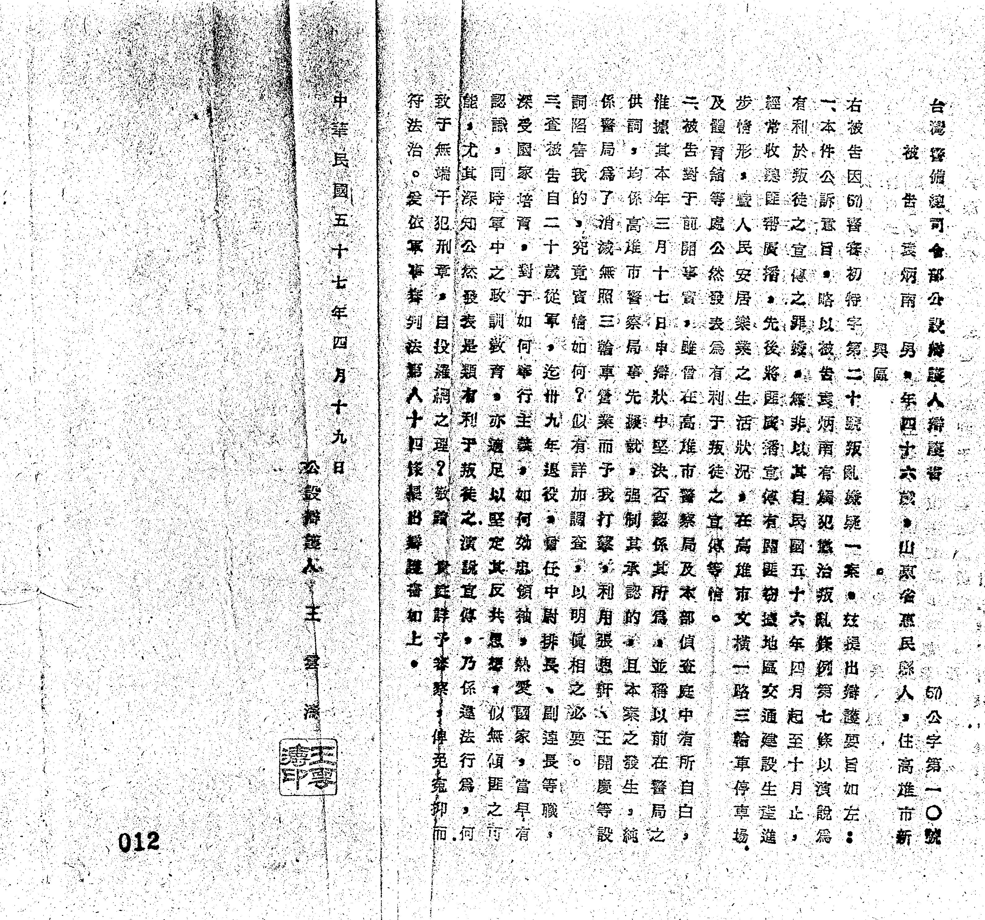 臺灣警備總司令部57年公字第0010號公設辯護人辯護書