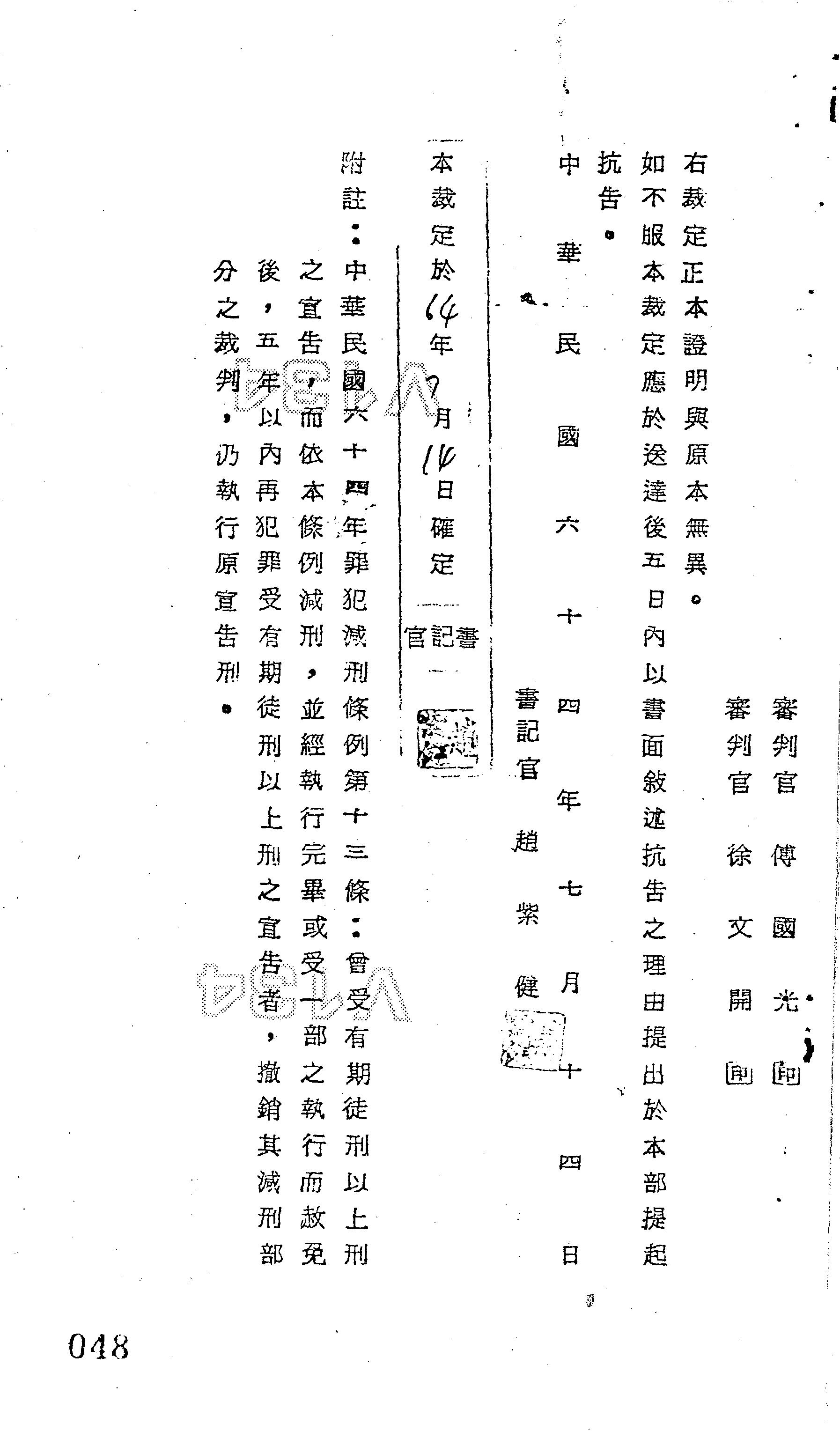 臺灣警備總司令部64年諫減字第0194號裁定書