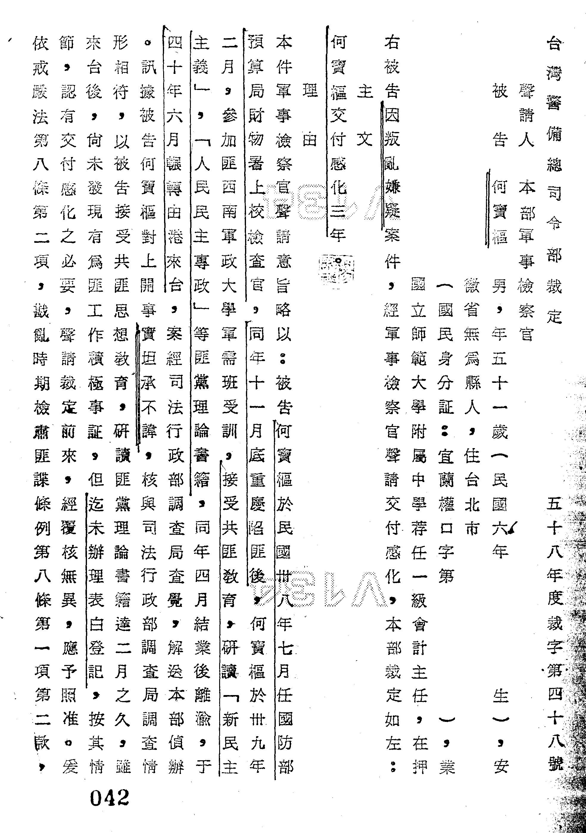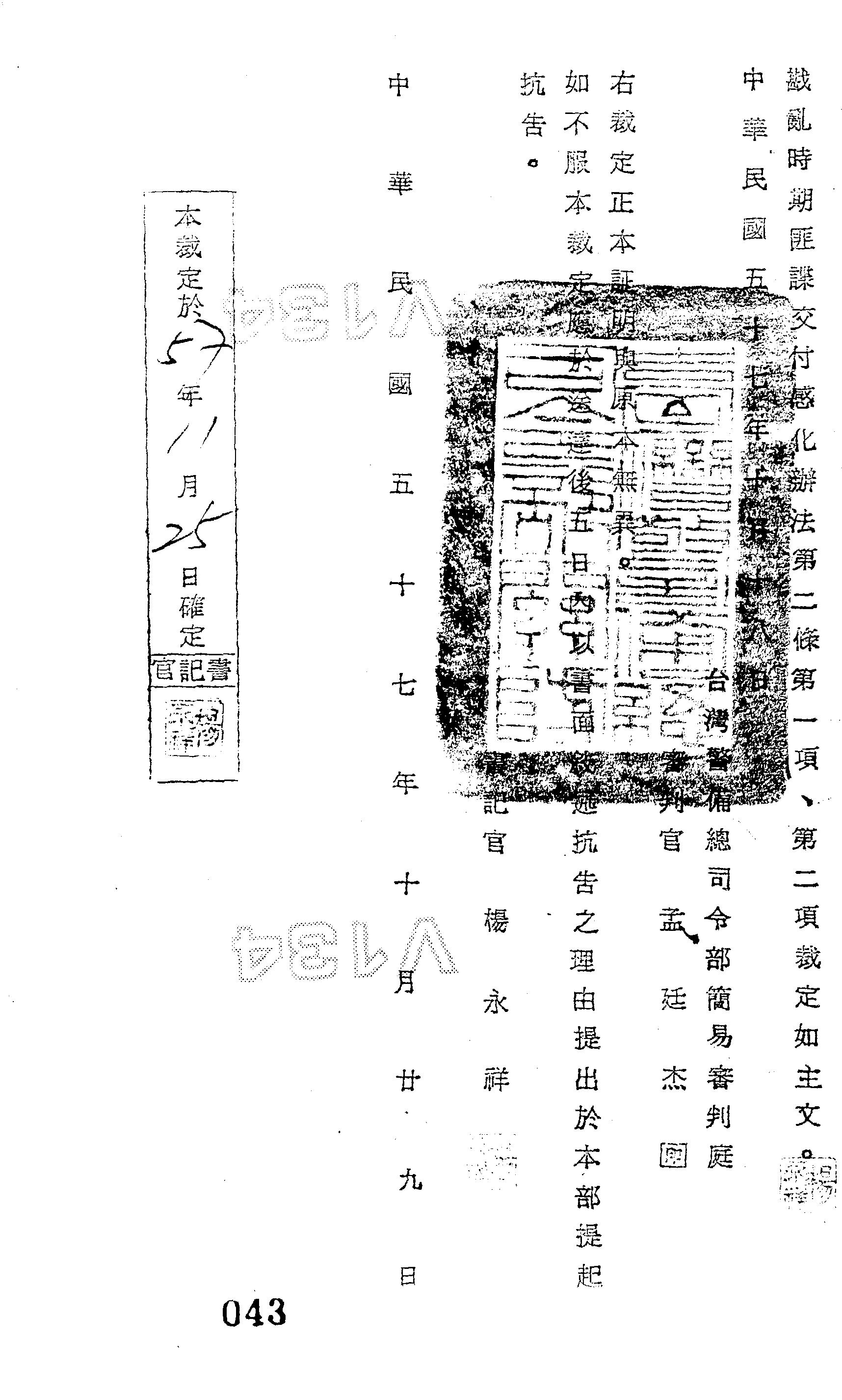 臺灣警備總司令部58年裁字第0048號裁定書