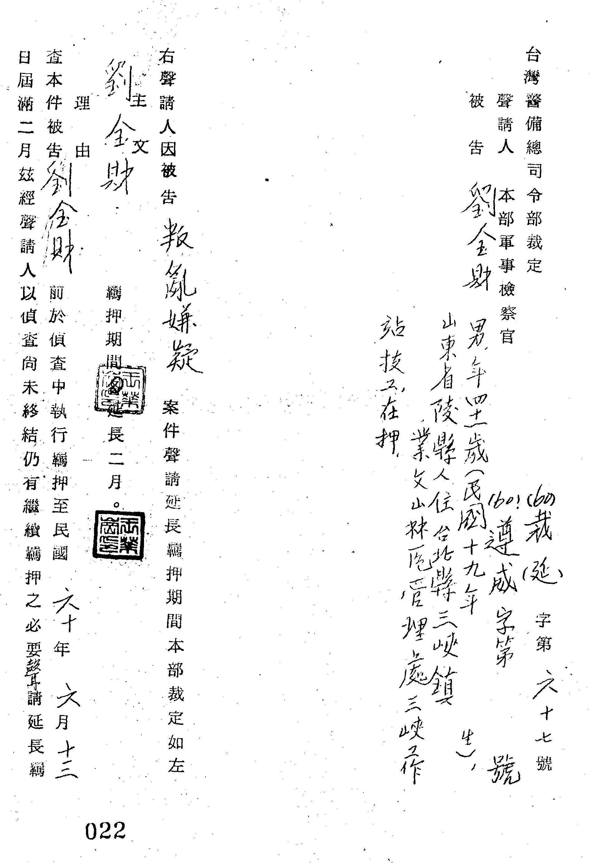 臺灣警備總司令部60年裁(延)字第0067號/60年遵威字裁定書