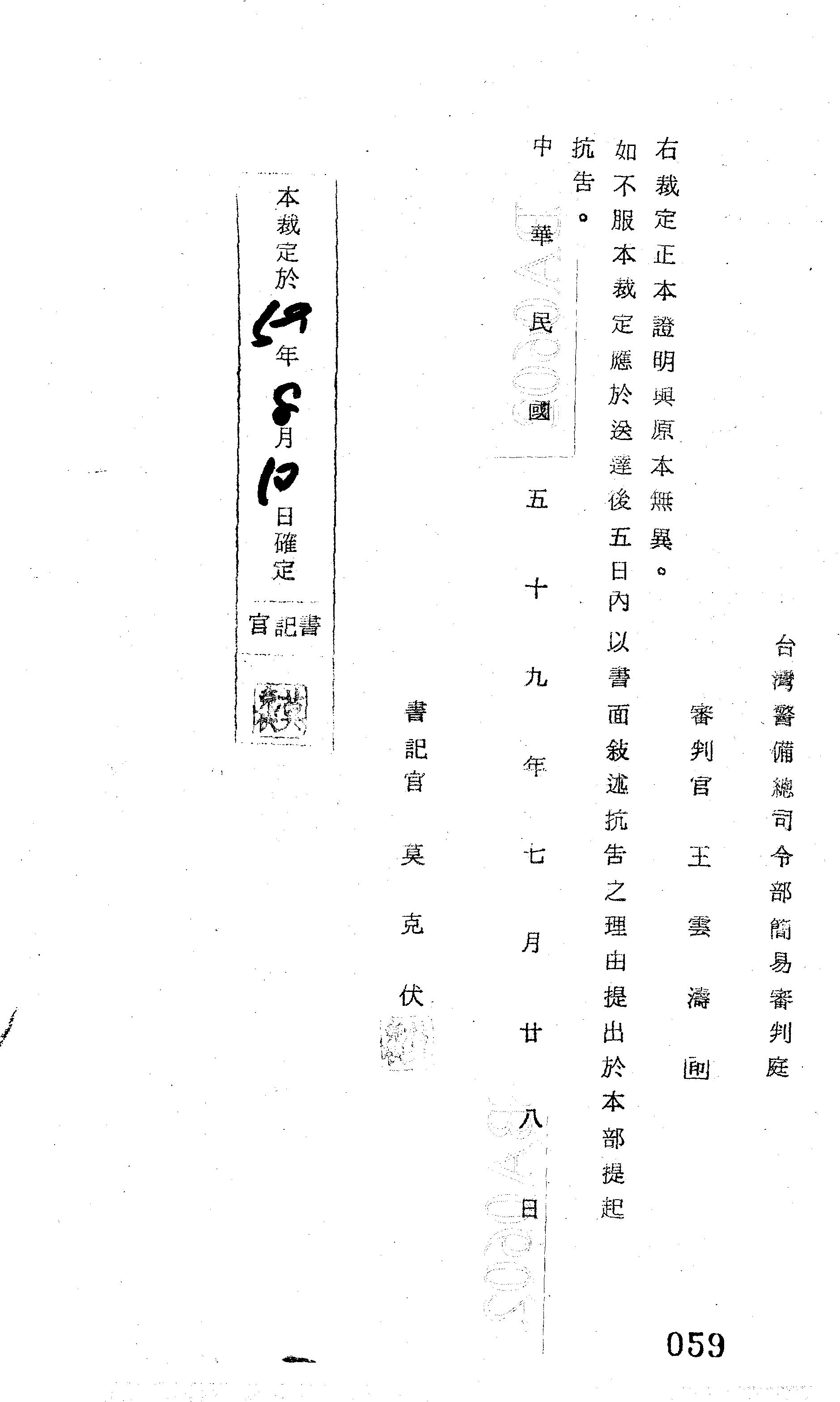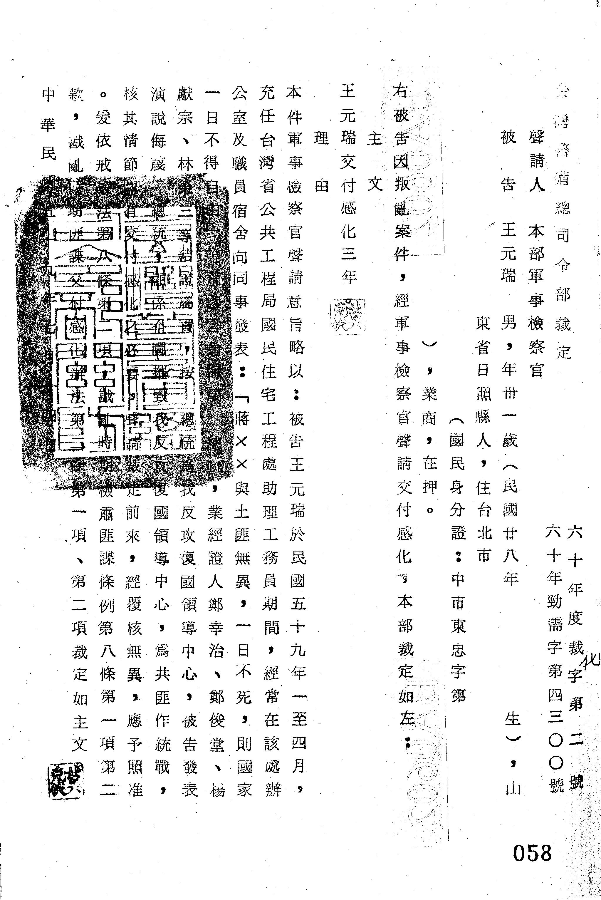 臺灣警備總司令部60年裁化字第0002號/60年勁需字第4300號裁定書