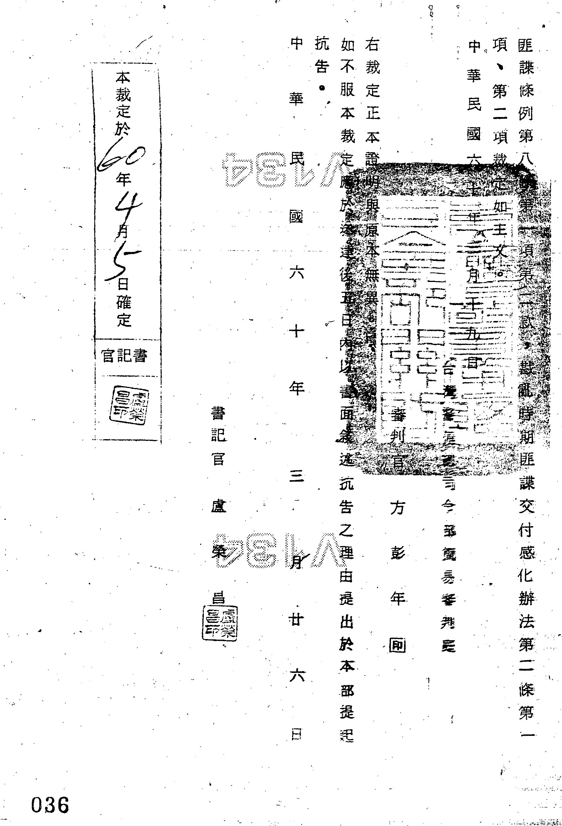 臺灣警備總司令部60年裁化字第0015號/60年遵威字第1727號裁定書