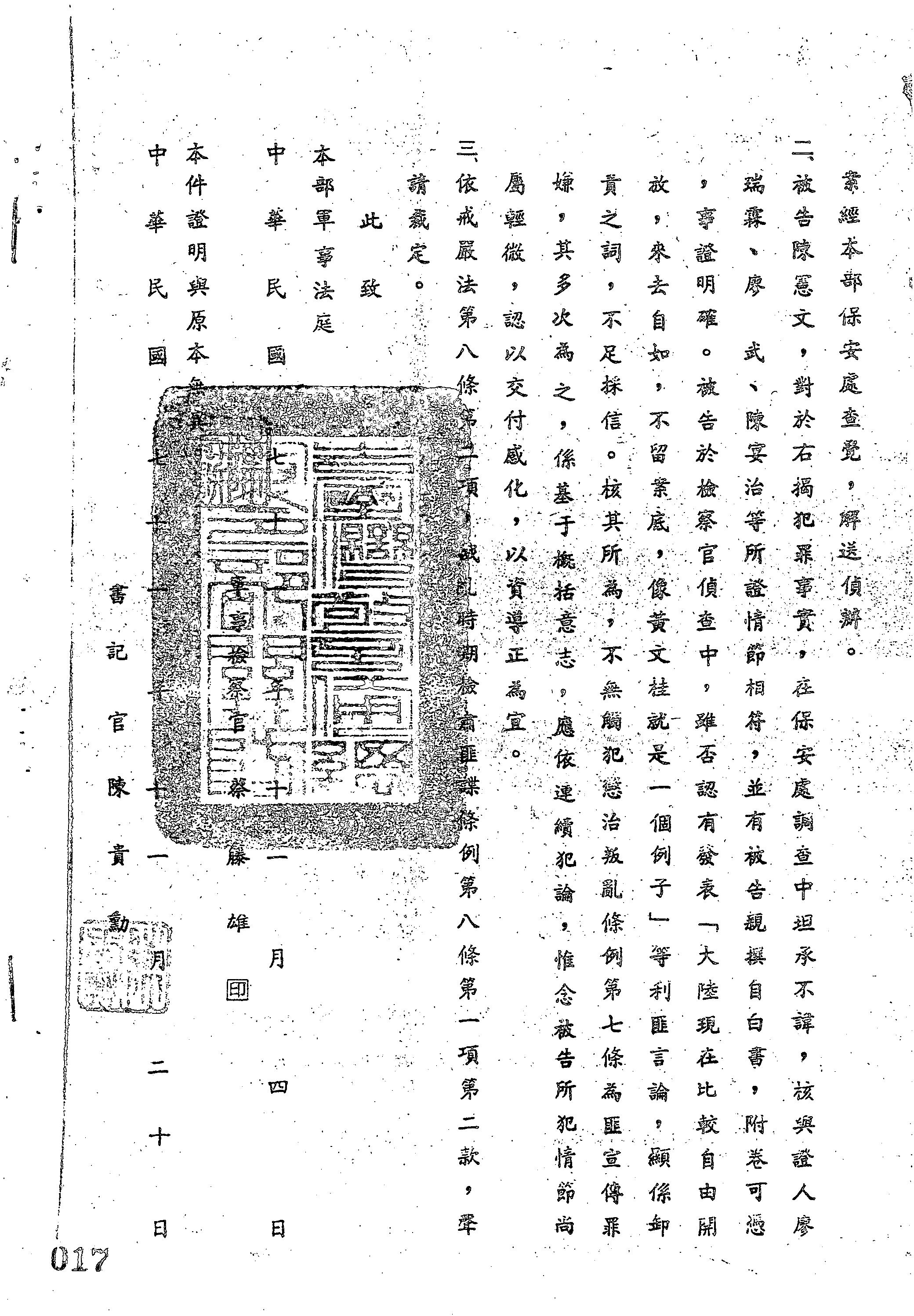 裁判書主文/要旨:陳憲文因叛亂嫌疑案件,已經偵查終結,認應聲請交付感化。