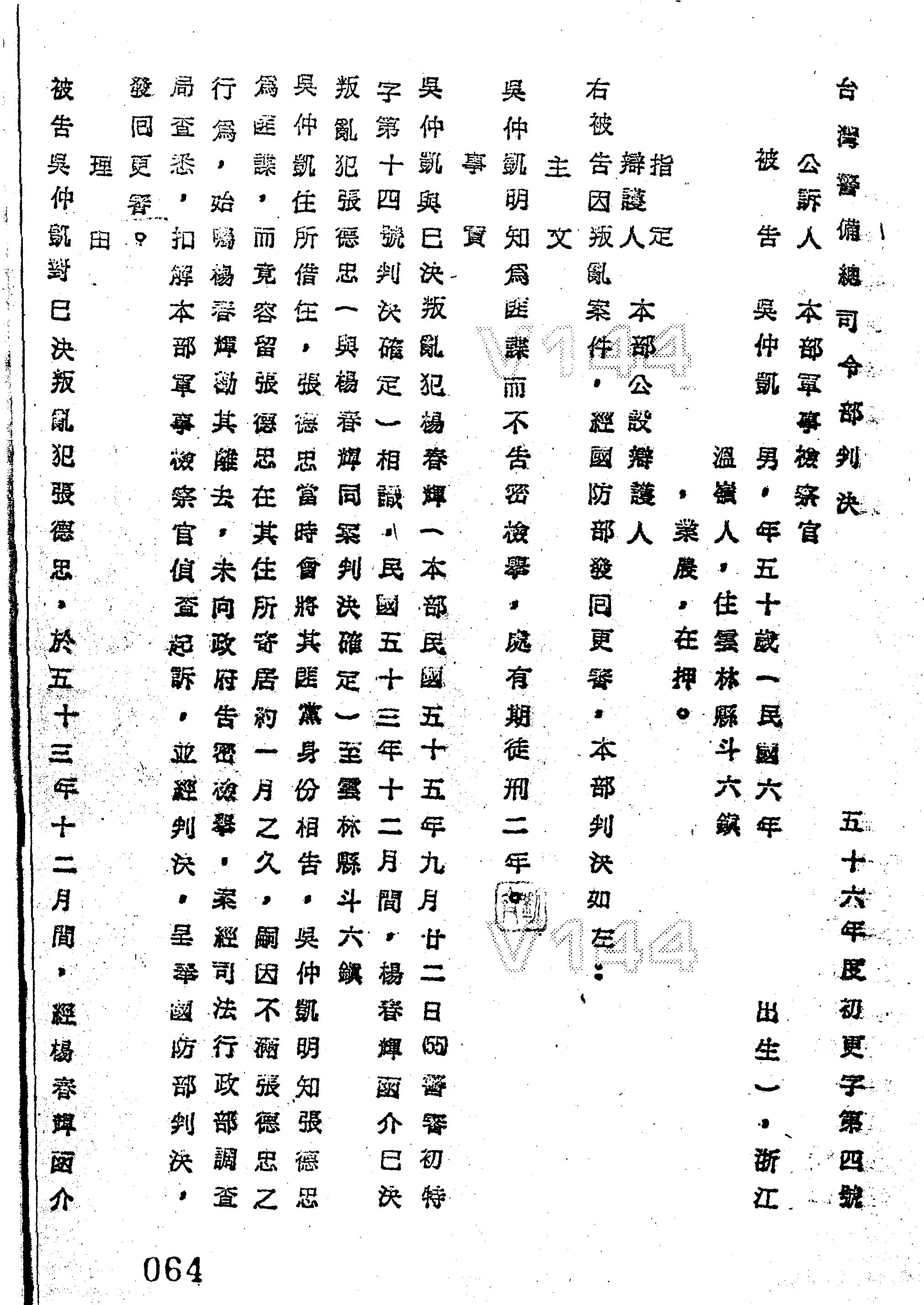 裁判書主文/要旨:吳仲凱「明知為匪諜而不告密檢舉」,處有期徒刑2年。