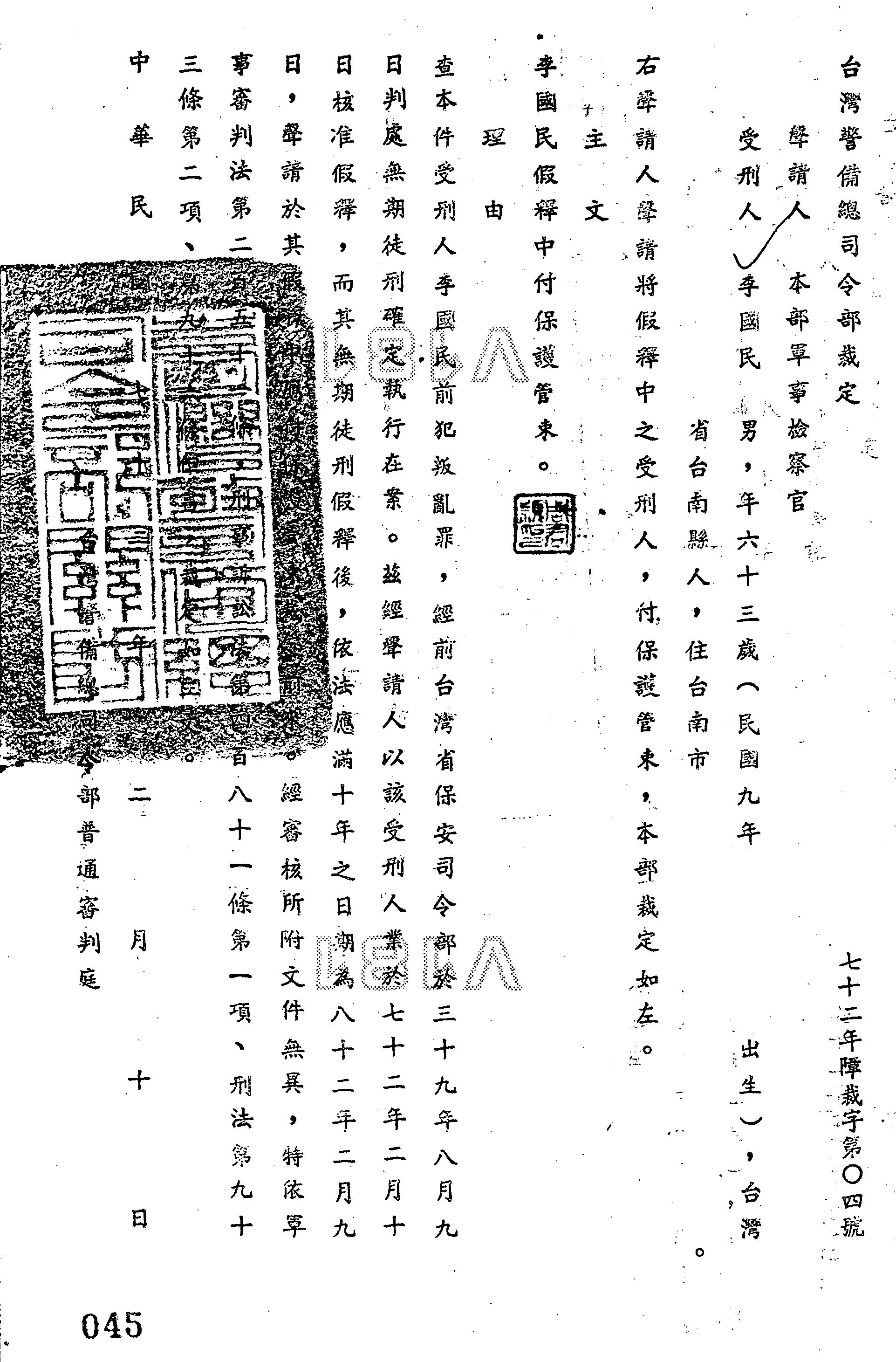 裁判書主文/要旨:李國民假釋中付保護管束。