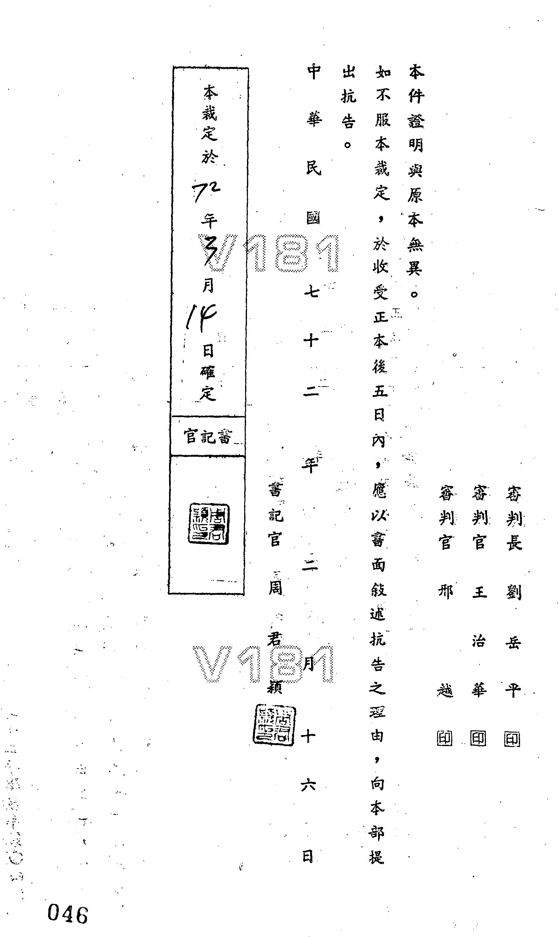 臺灣警備總司令部72年障裁字第0004號裁定書