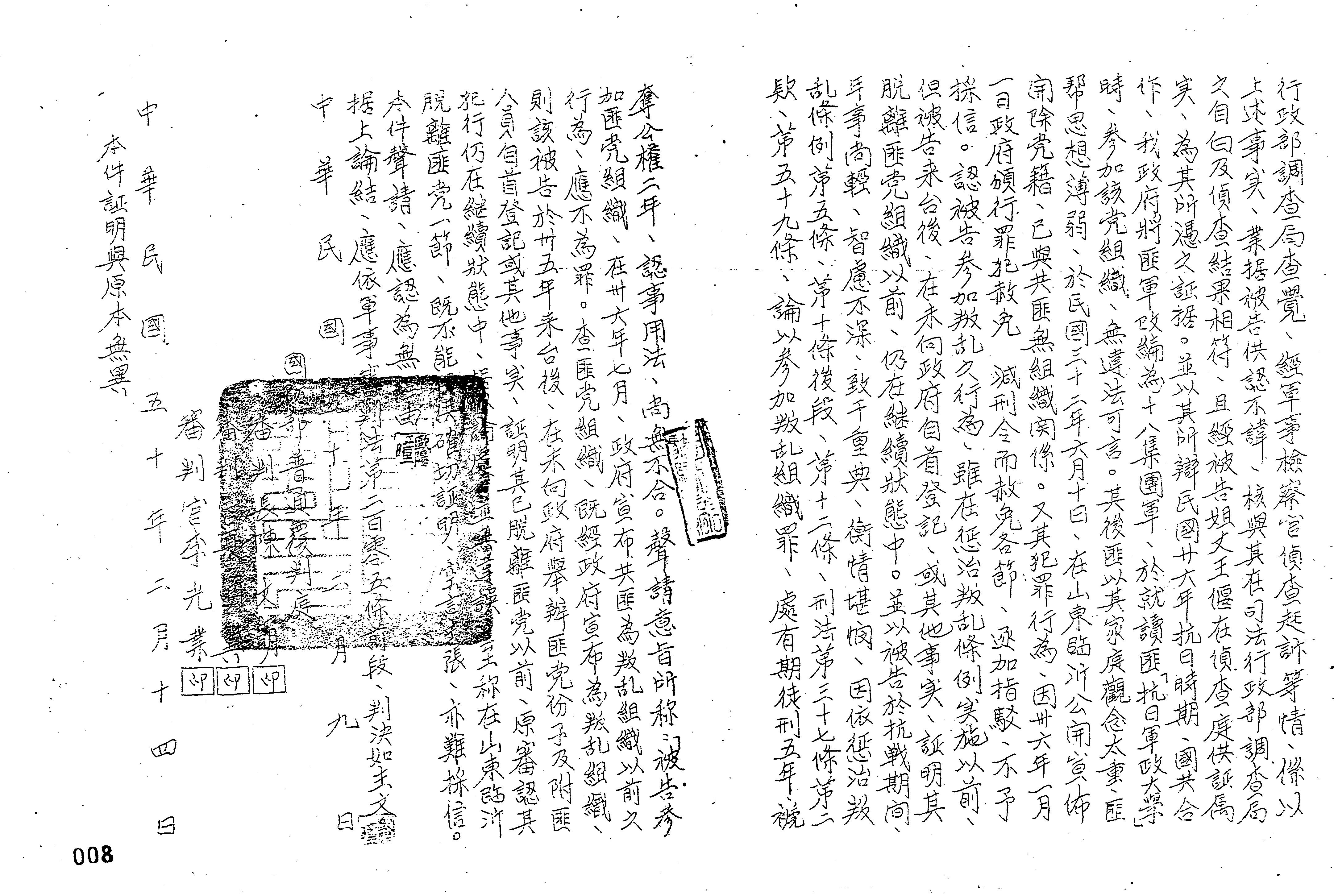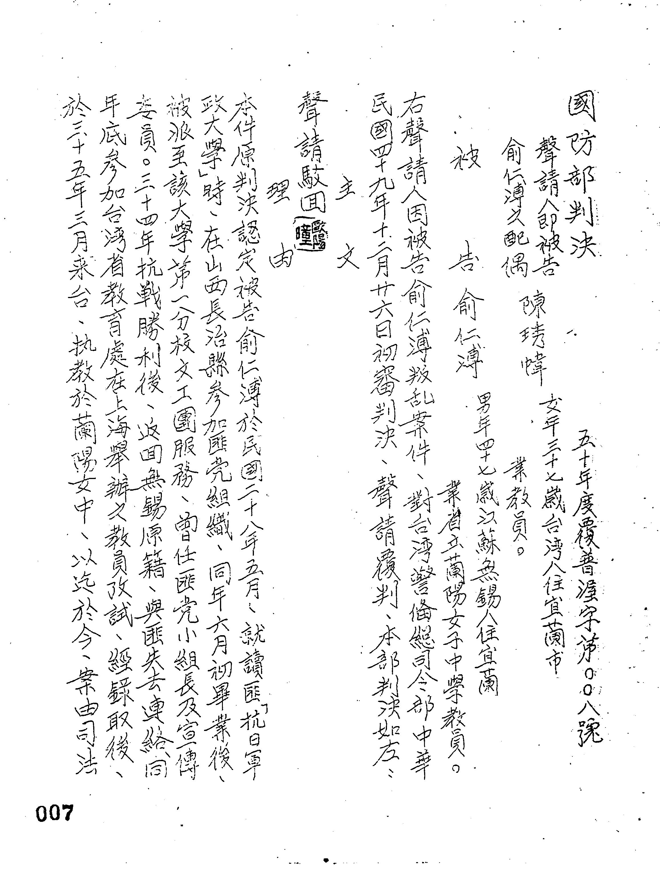 國防部50年覆普渥字第0008號判決書