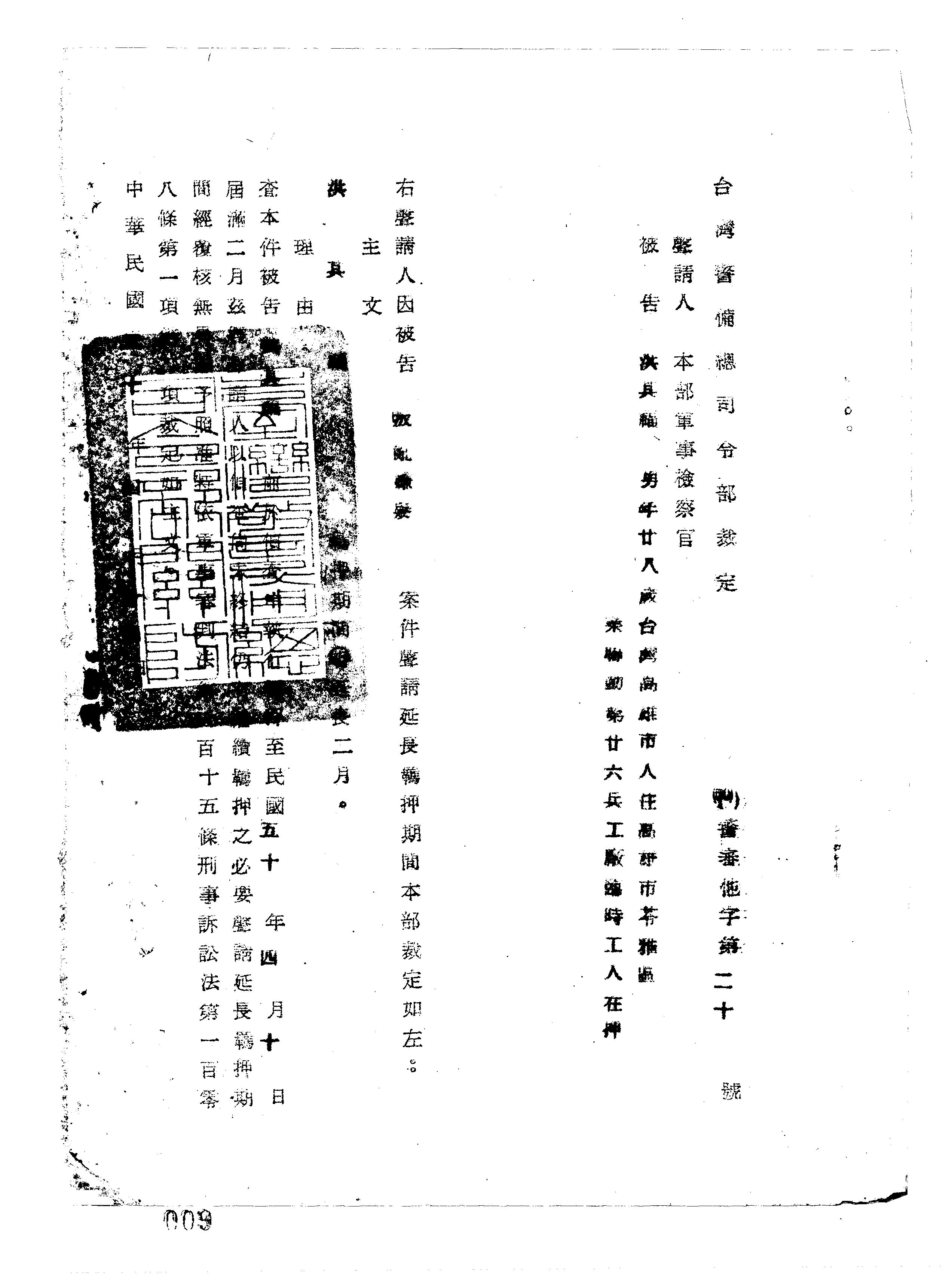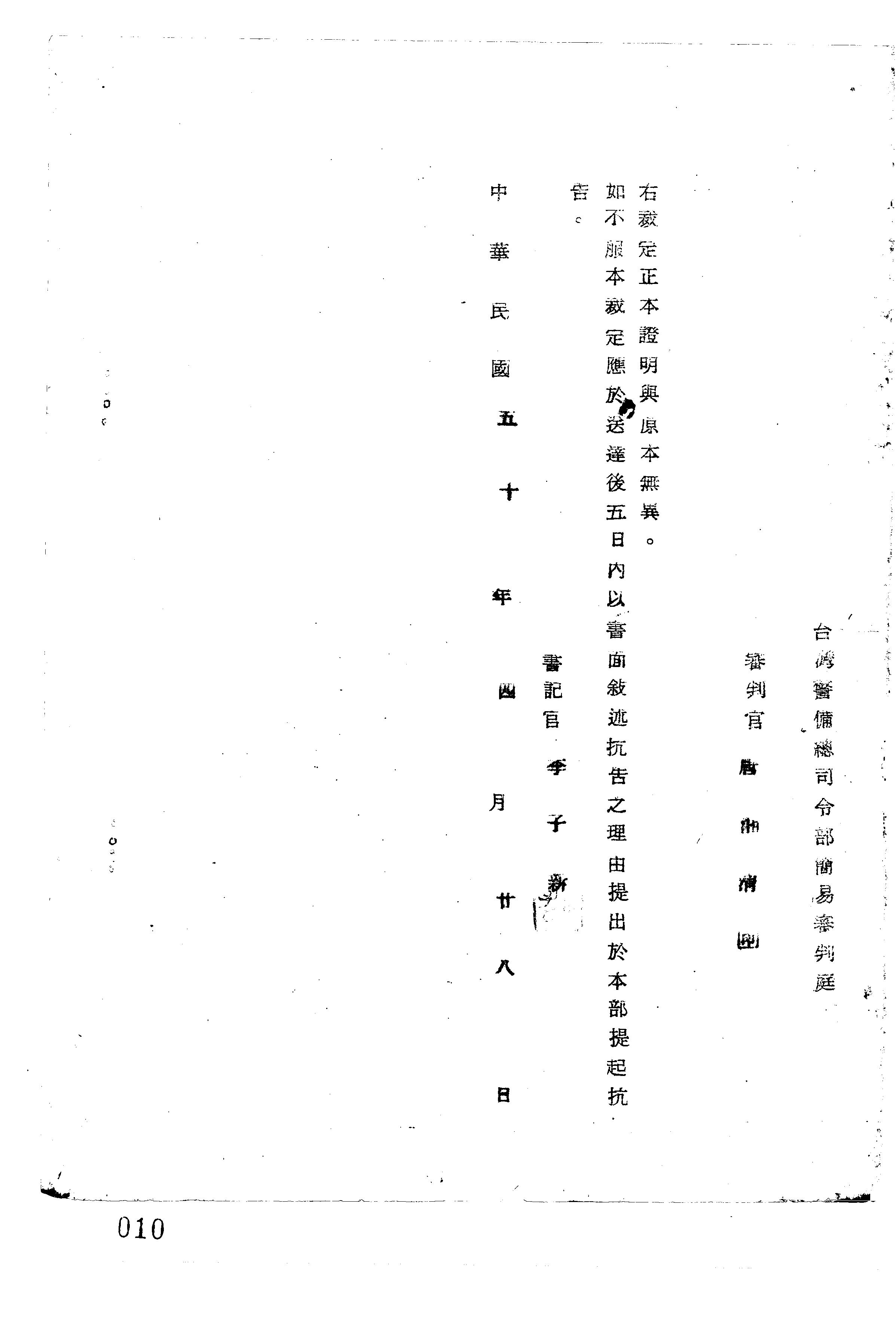 臺灣警備總司令部50年警審他字第0020號裁定書