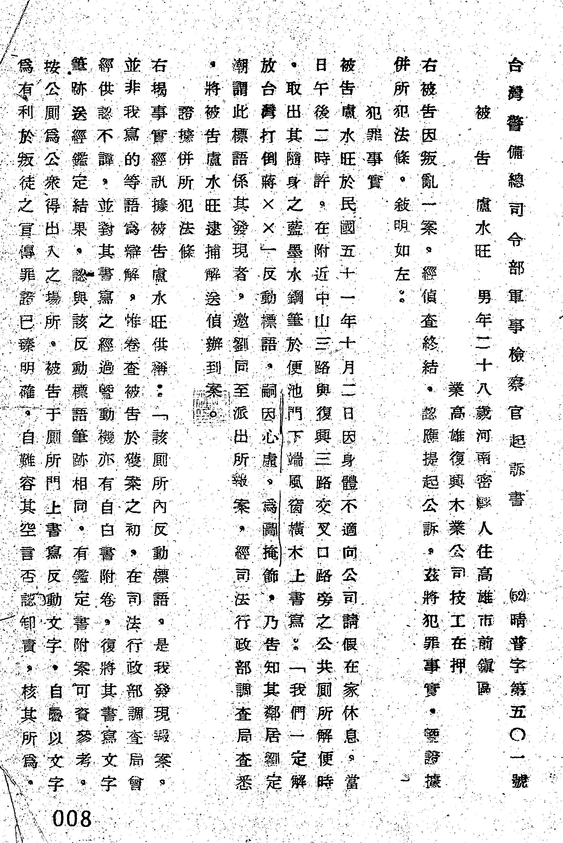 臺灣警備總司令部52年晴普字第0501號軍事檢察官起訴書