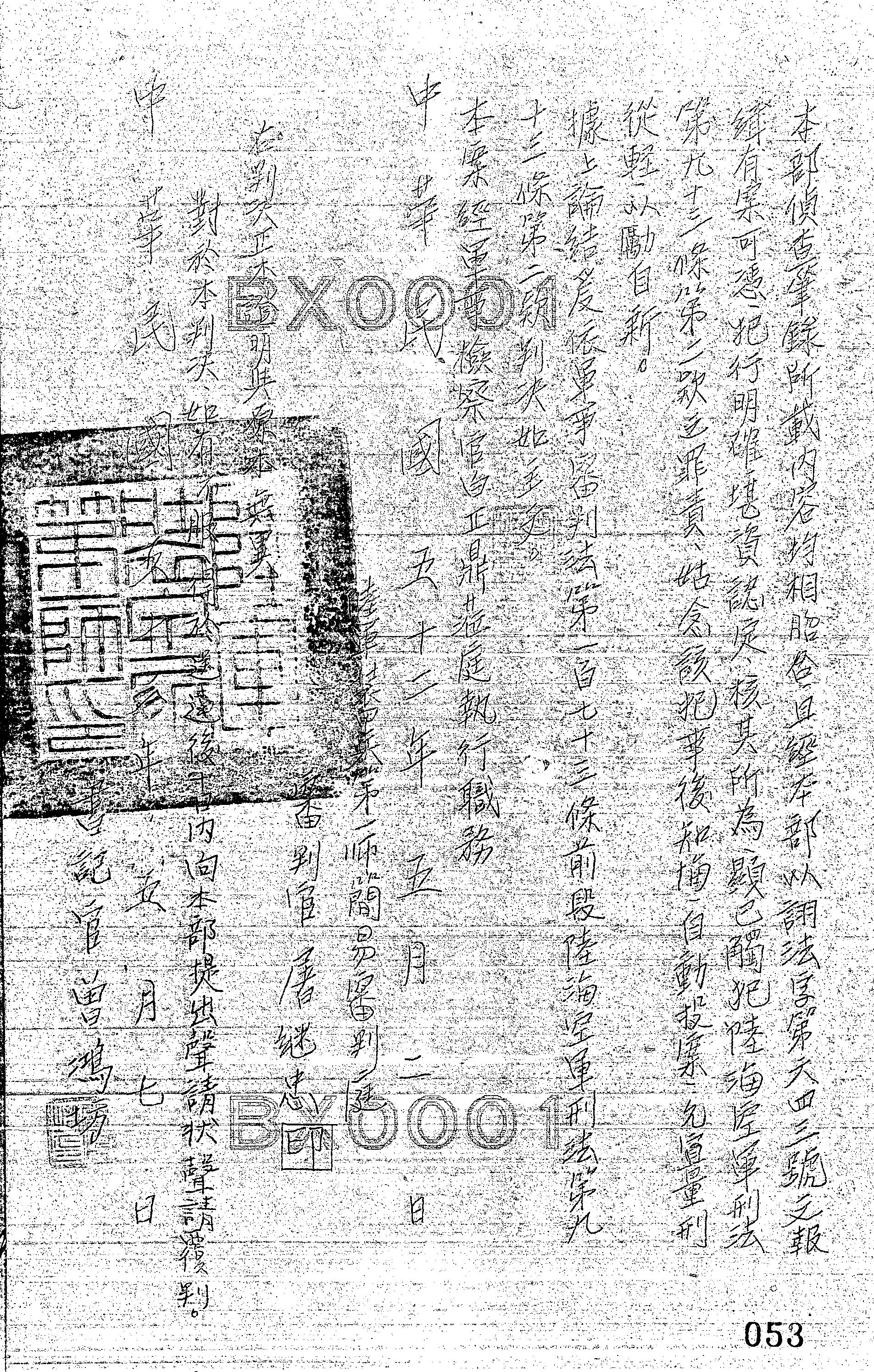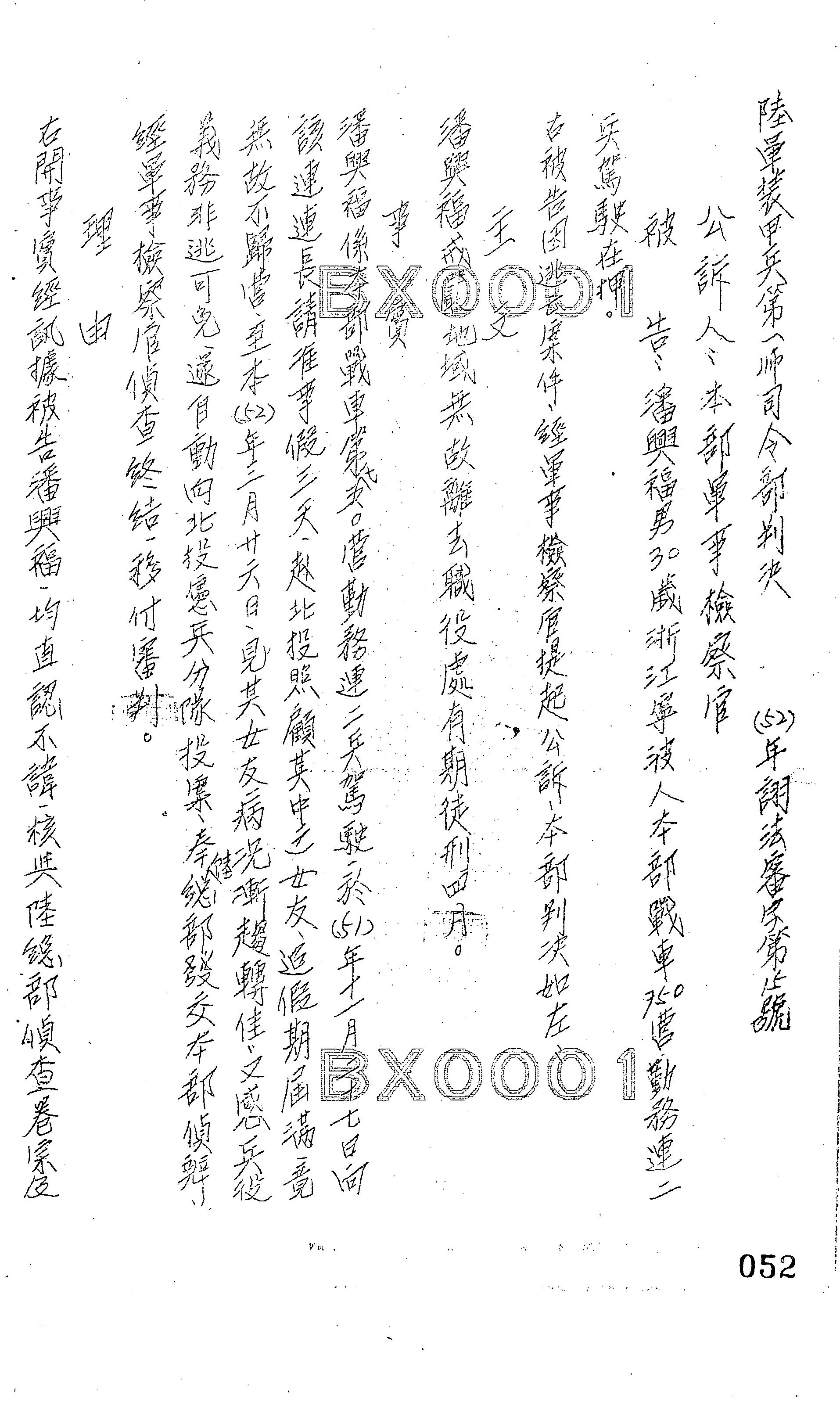 陸軍裝甲兵第一師司令部52年詡法審字第0015號判決書