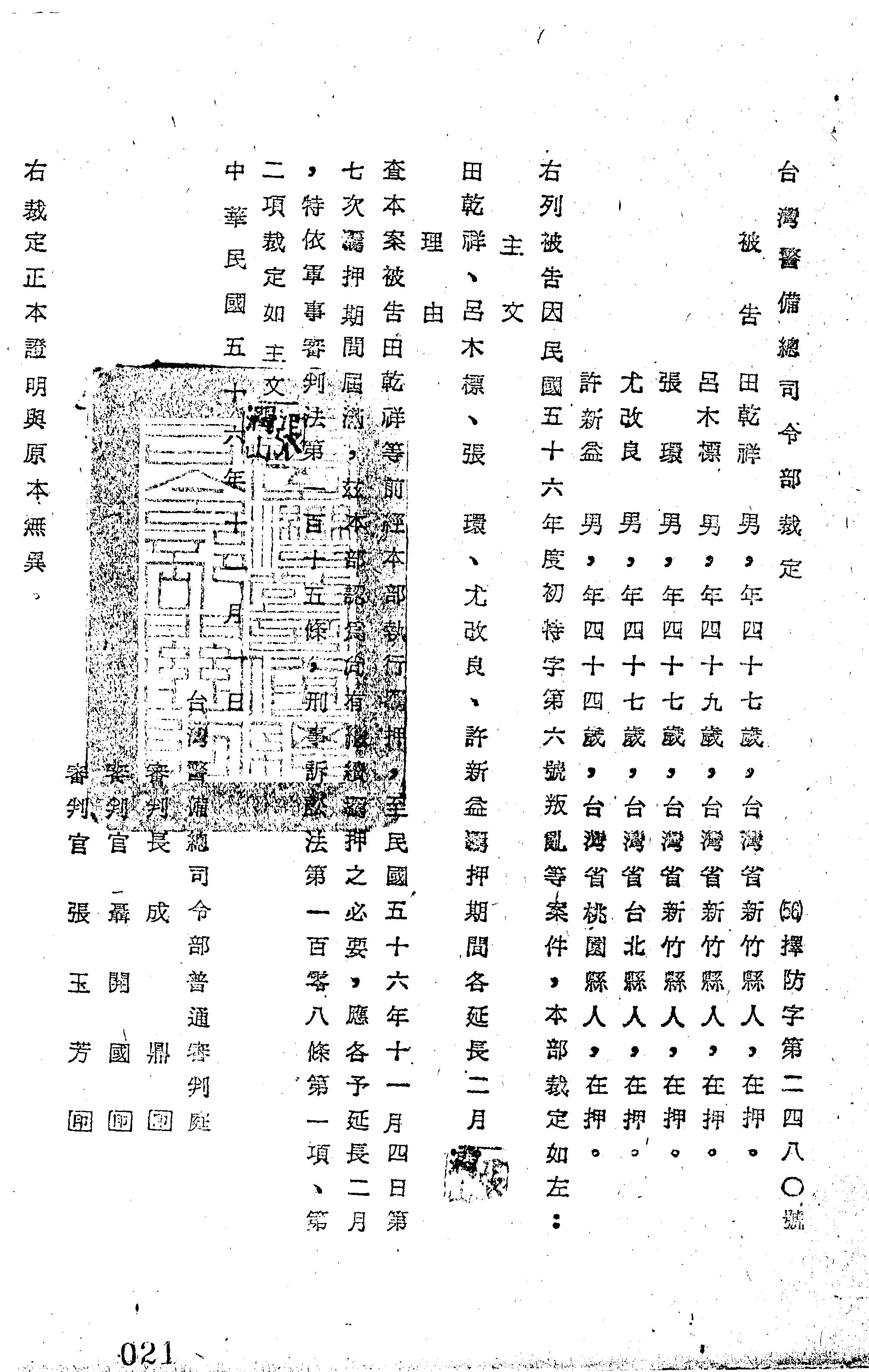 臺灣警備總司令部56年擇防字第2480號裁定書