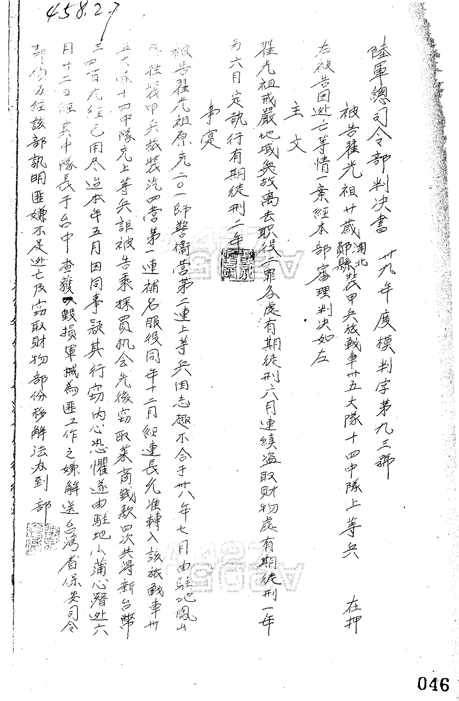 陸軍總司令部39年模判字第0093號判決書