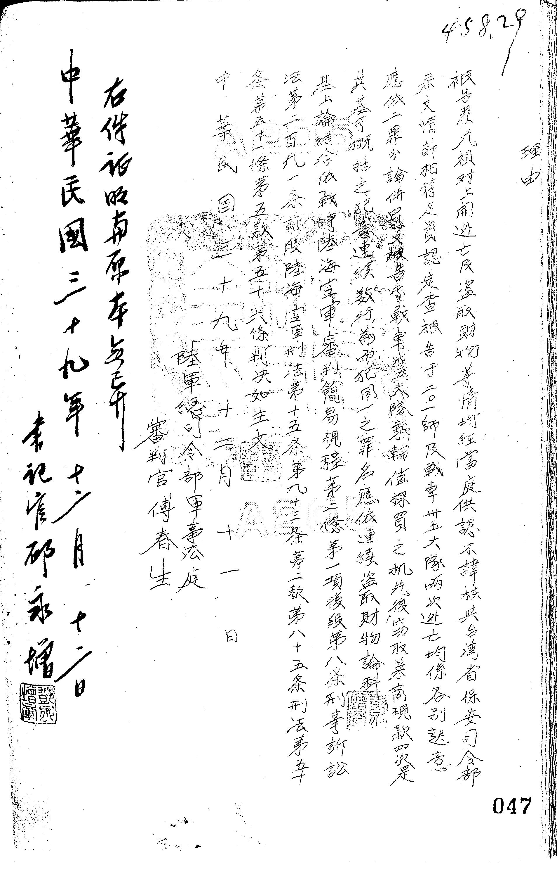 法條:戰時陸海空軍審判簡易規程第2條第1項後段、第8條;刑事訴訟法第291條前段;陸海空軍刑法第15條、第93條第2款、第85條;刑法第50條、第51條第5款、第56條