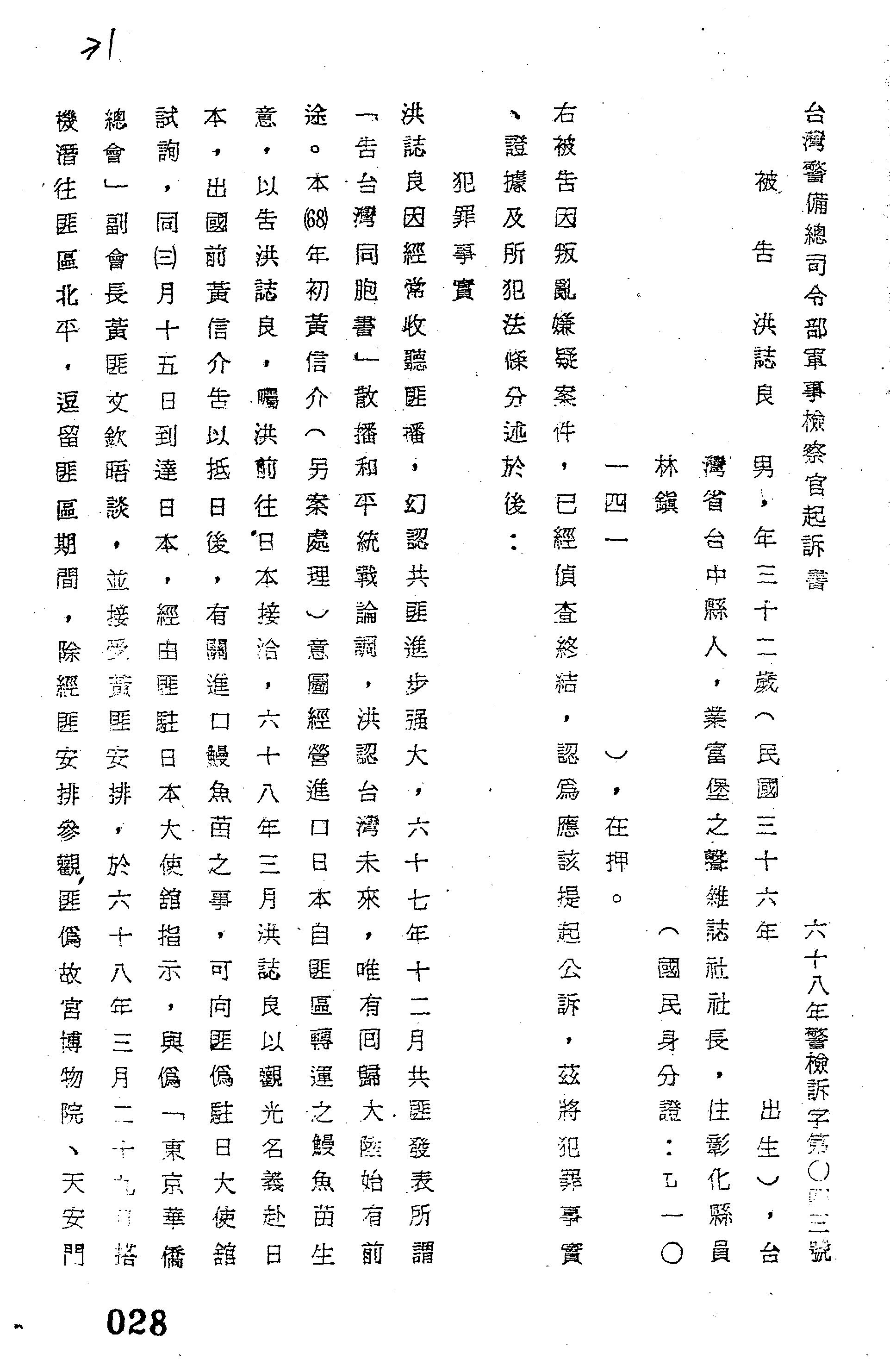 裁判書主文/要旨:洪誌良因叛亂嫌疑案件業經偵查終結認應提起公訴。