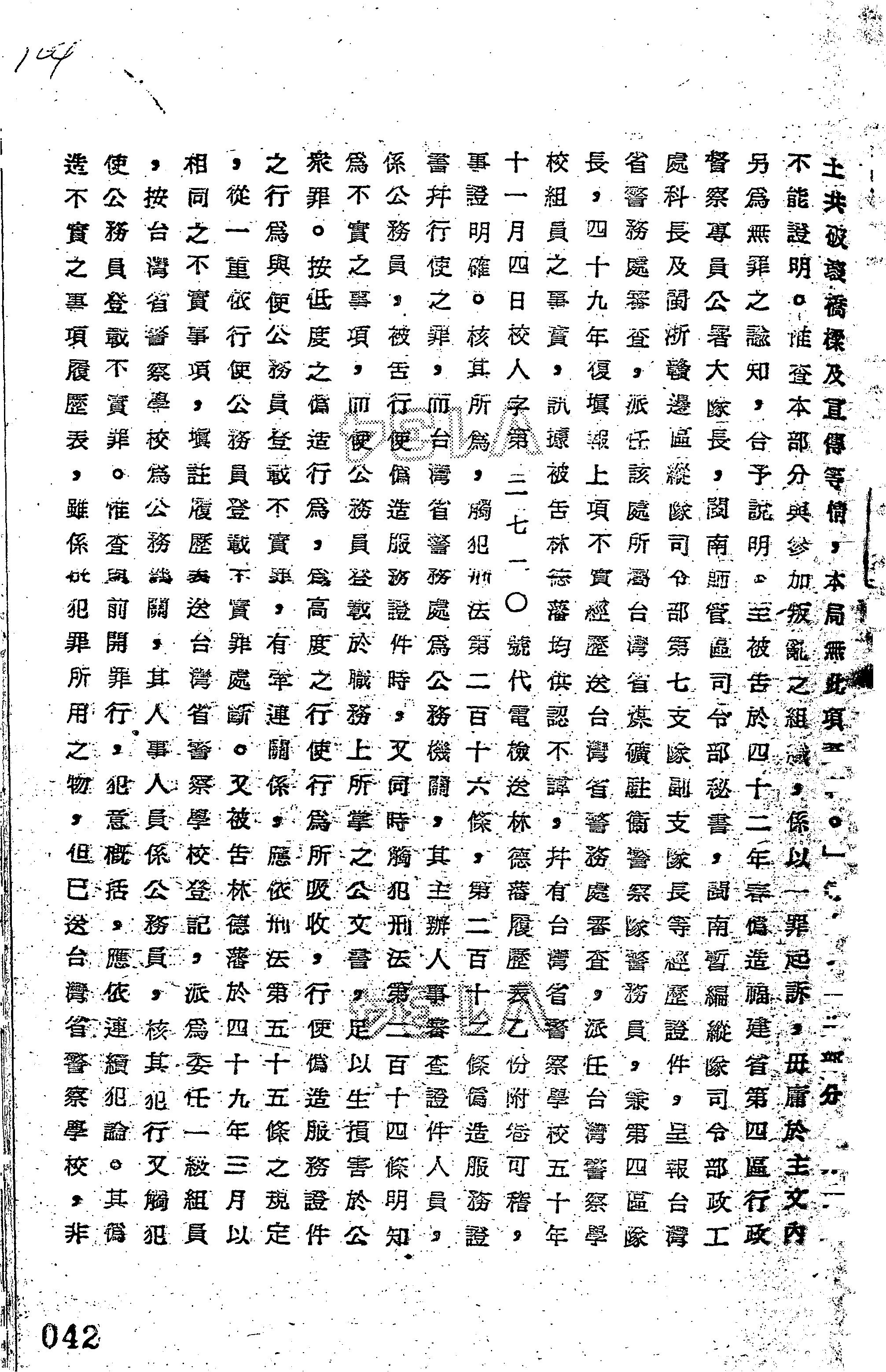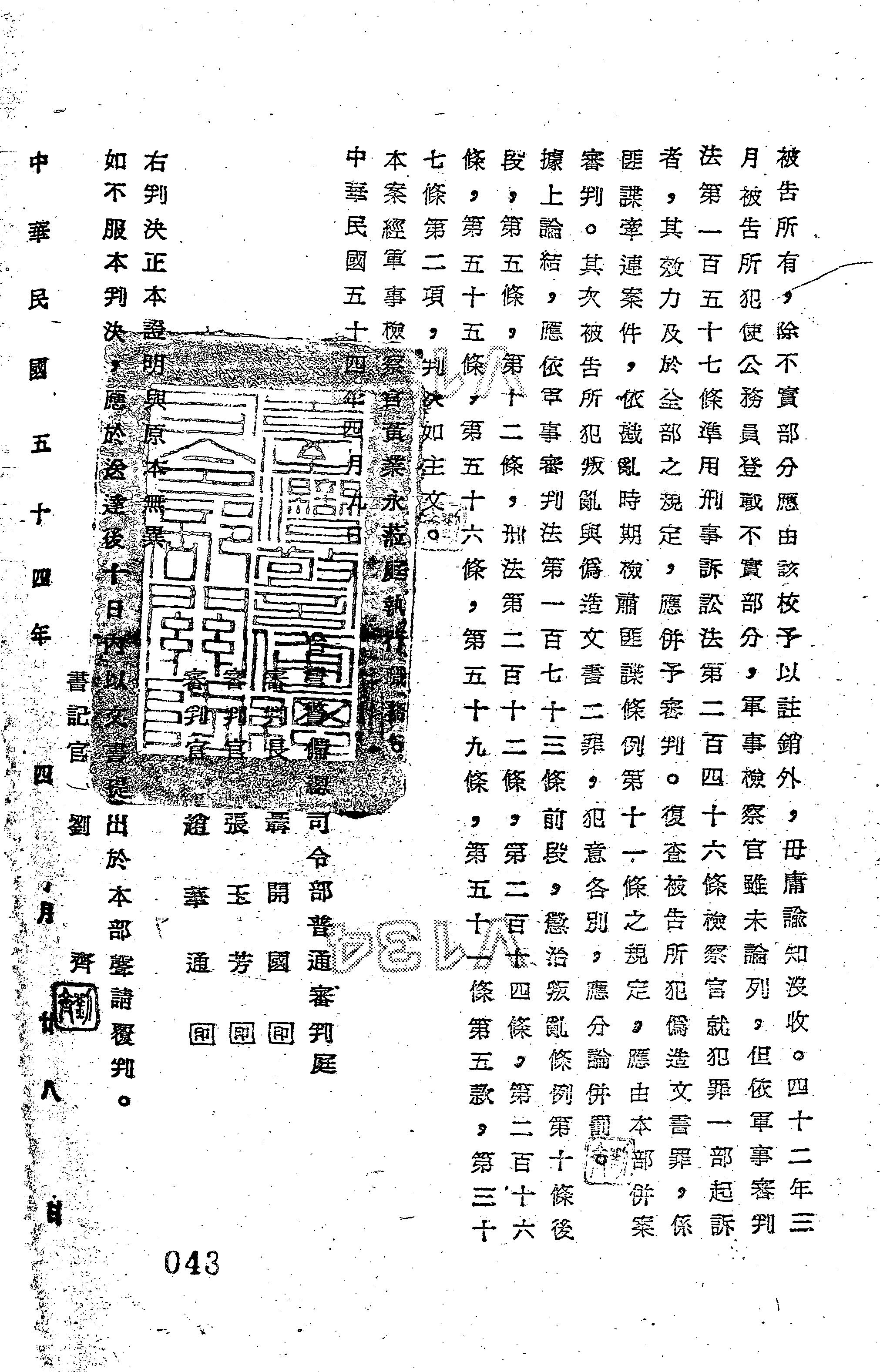 - 法條:軍事審判法第173條前段;懲治叛亂條例第10條後段、第5條、第12條;刑法第212條、第214條、第216條、第55條、第56條、第59條、第51條第5款、第37條第2項