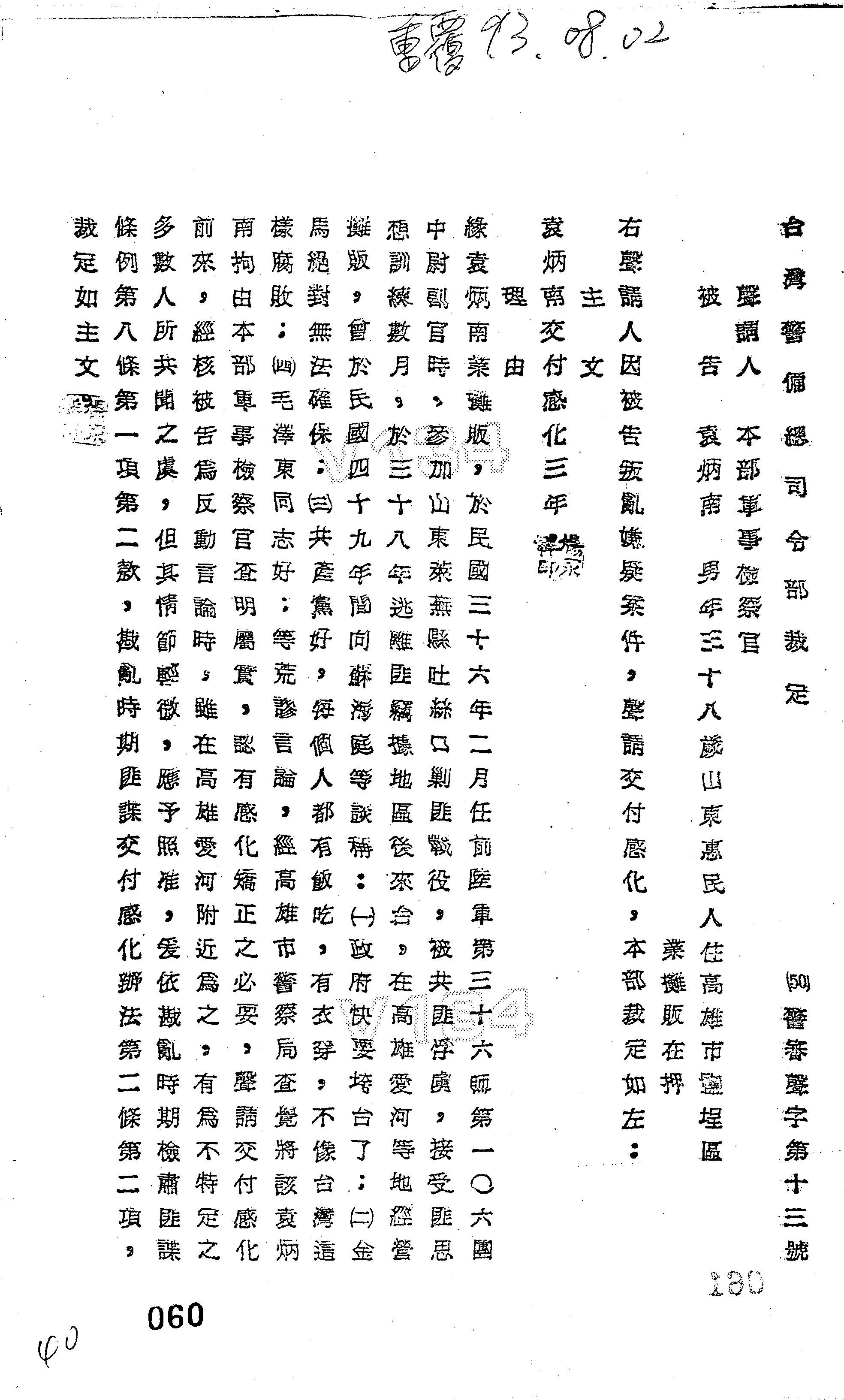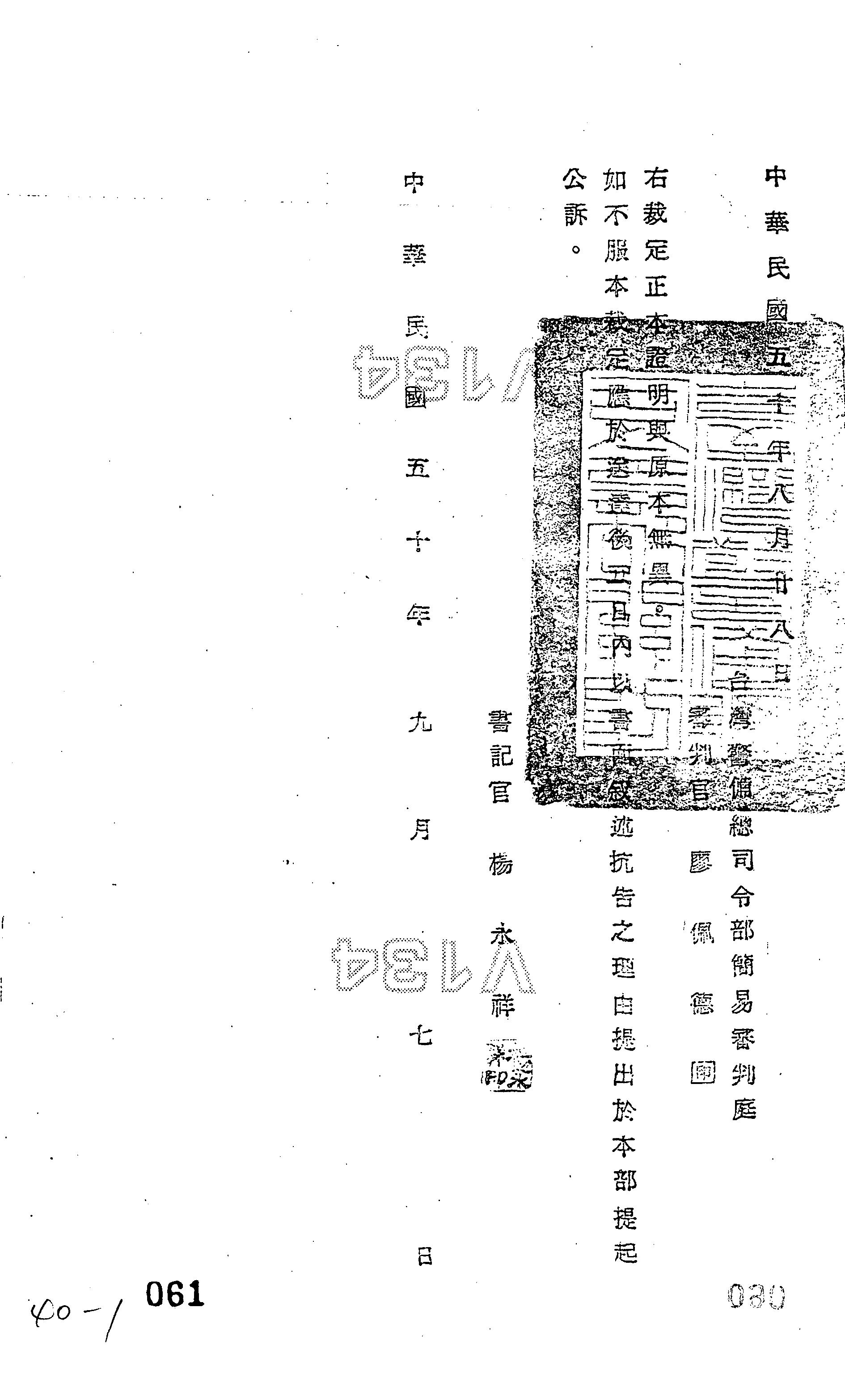 臺灣警備總司令部50年警審聲字第0013號裁定書