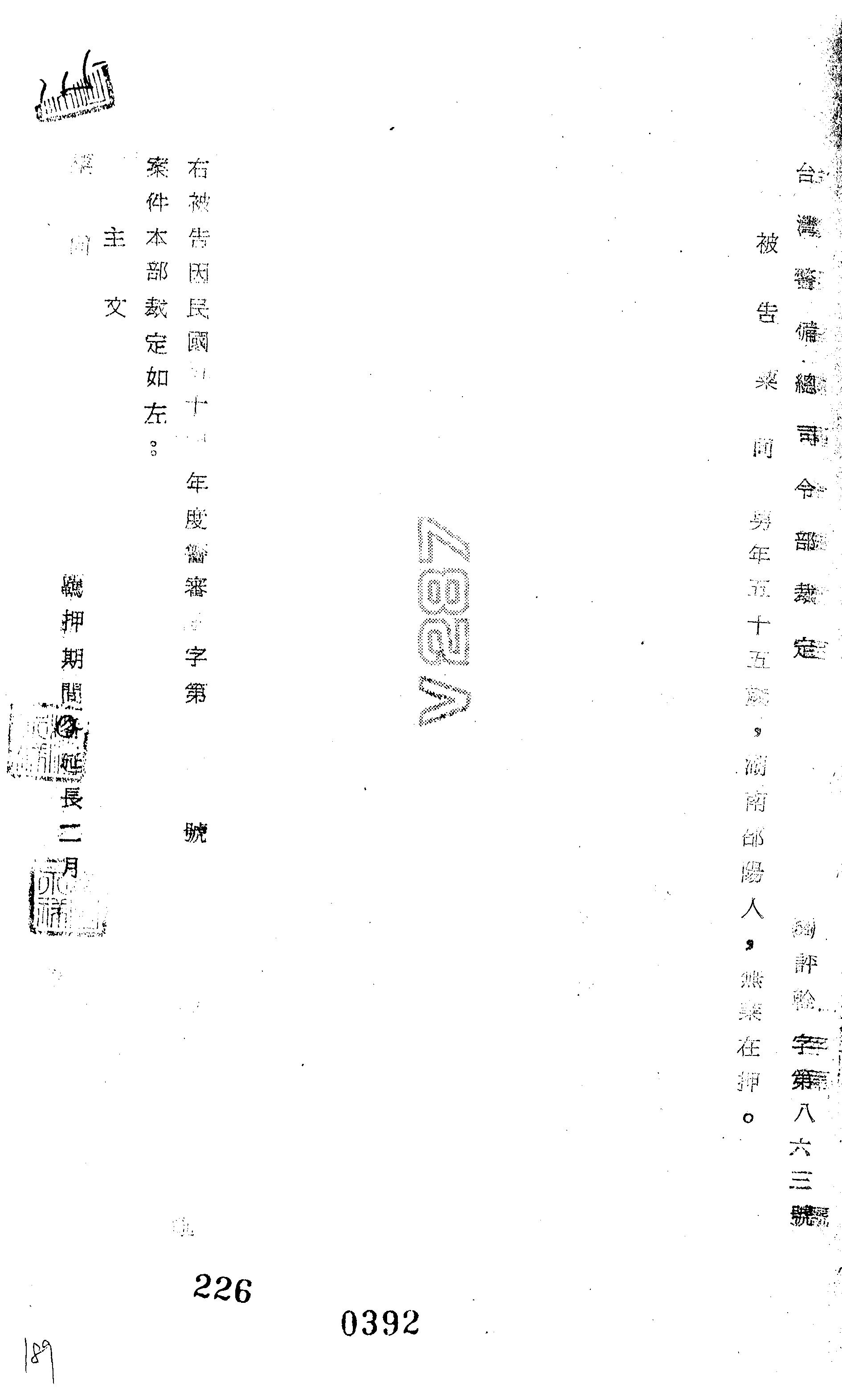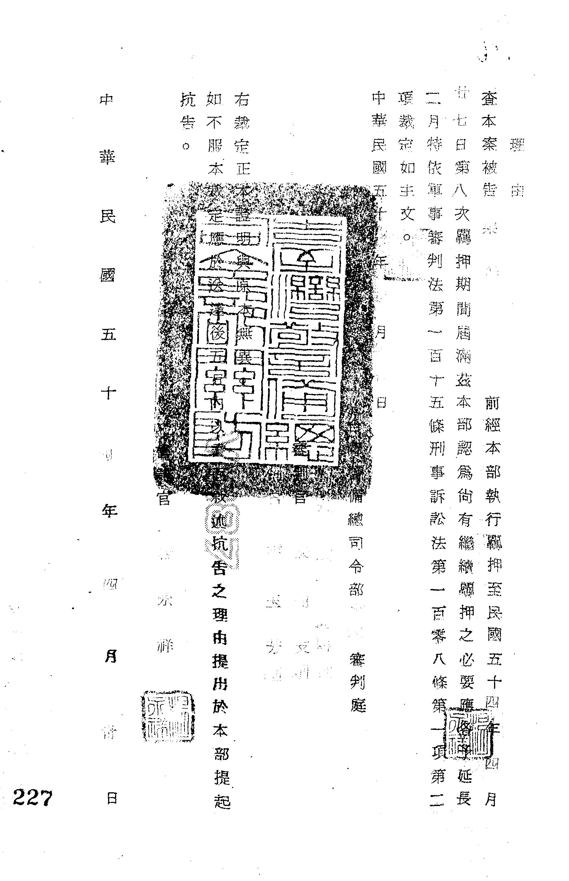 審理機關:臺灣警備總司令部
