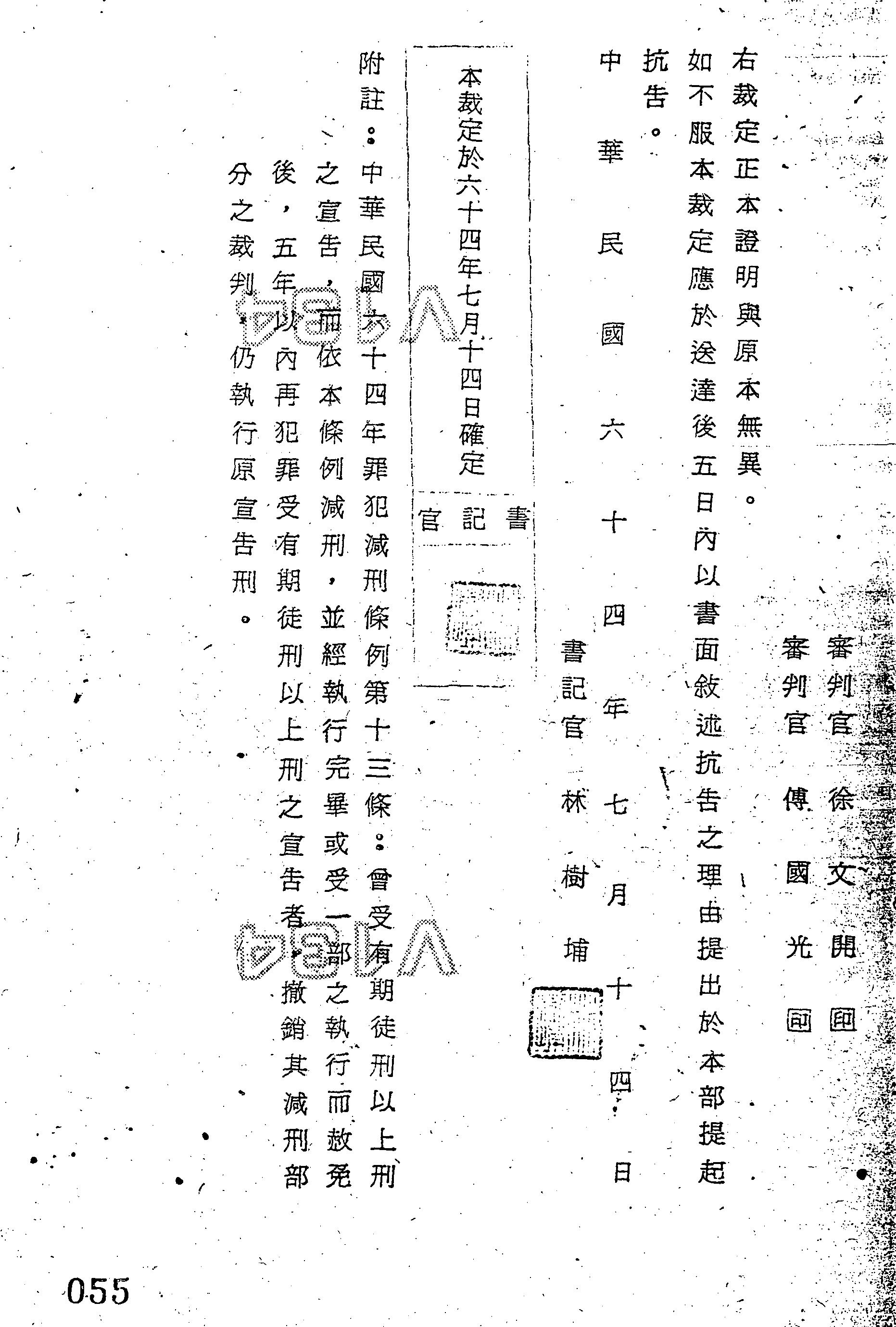 臺灣警備總司令部64年諫減字第0295號裁定書