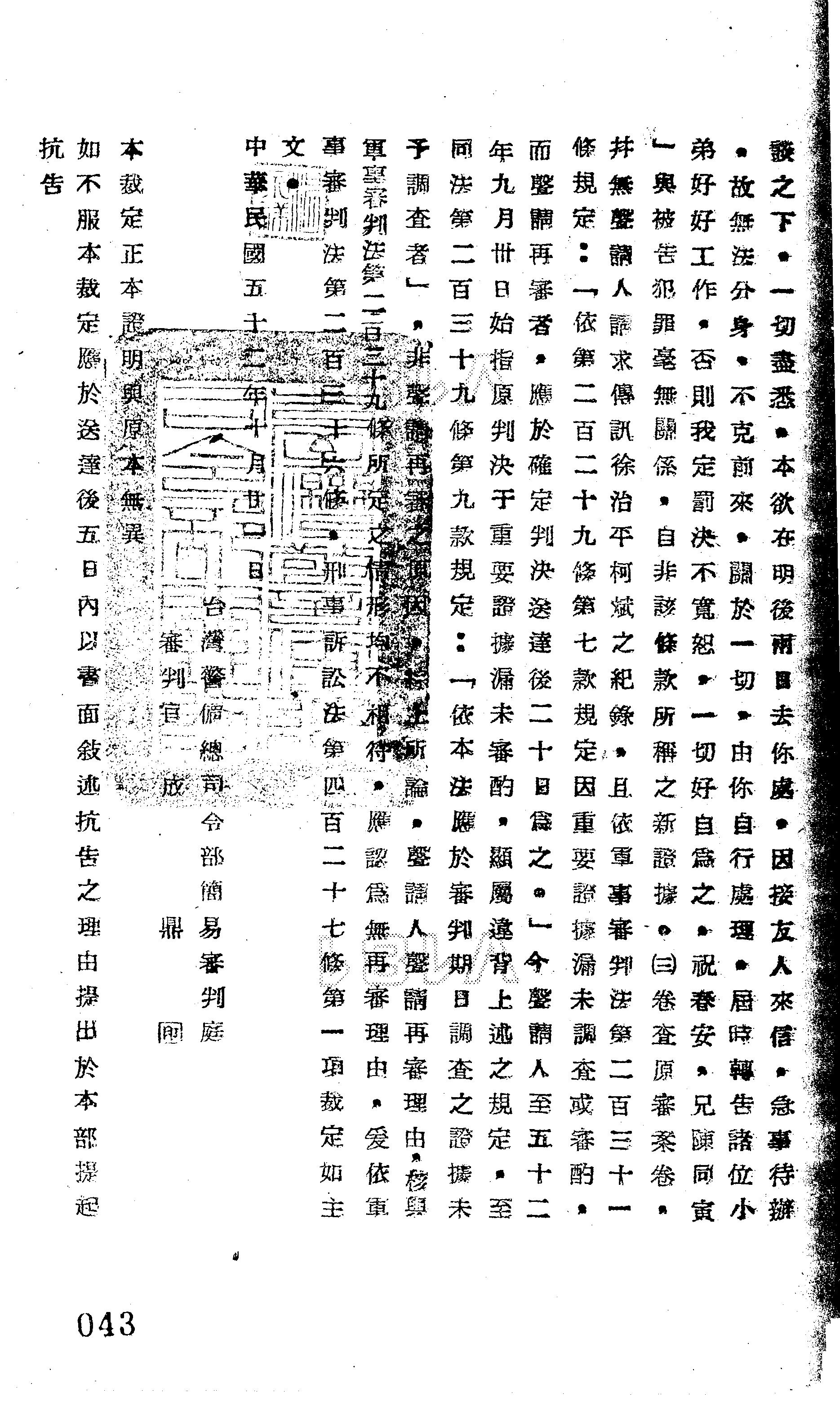 臺灣警備總司令部52年警審再字第0004號裁定書