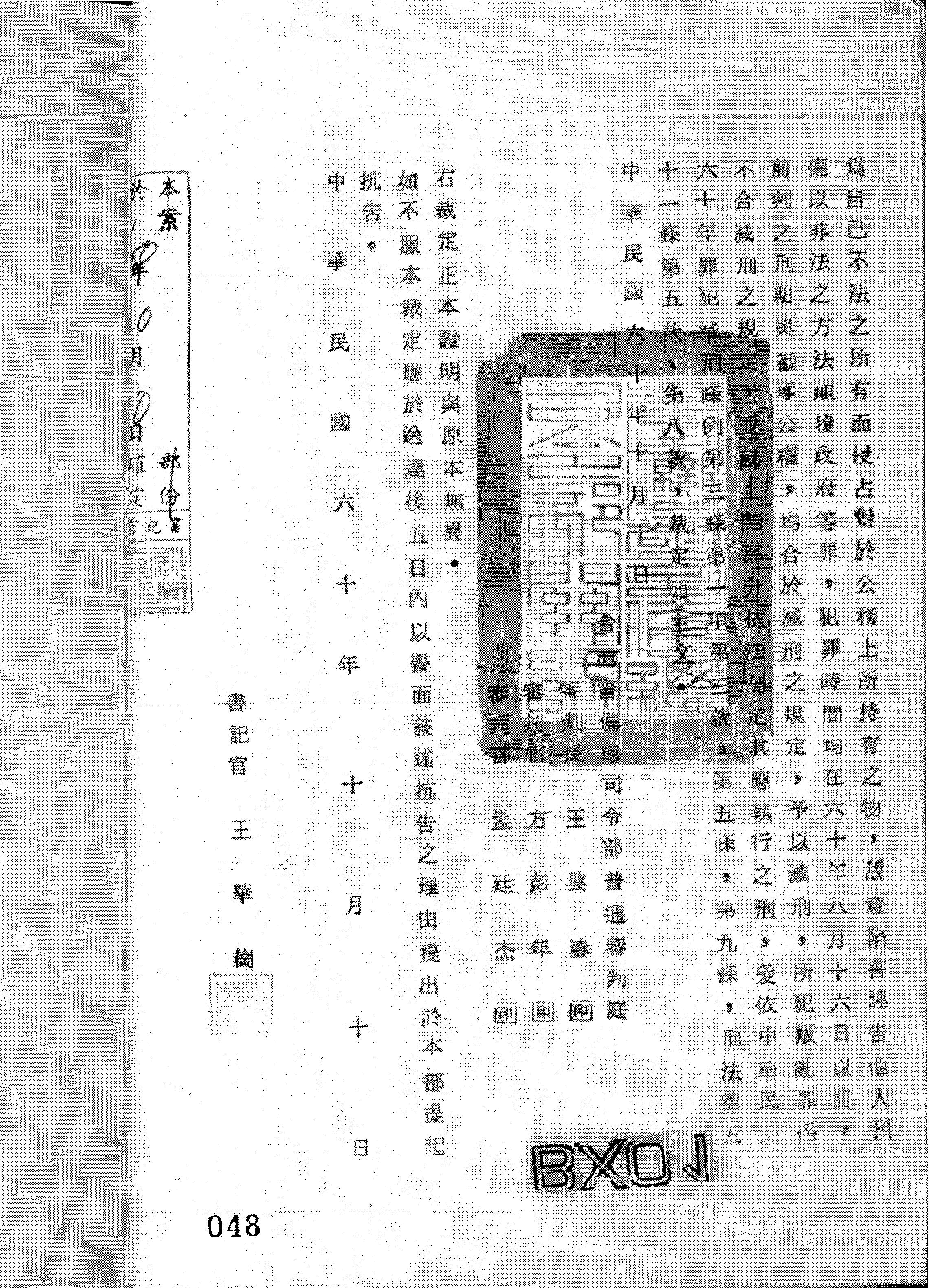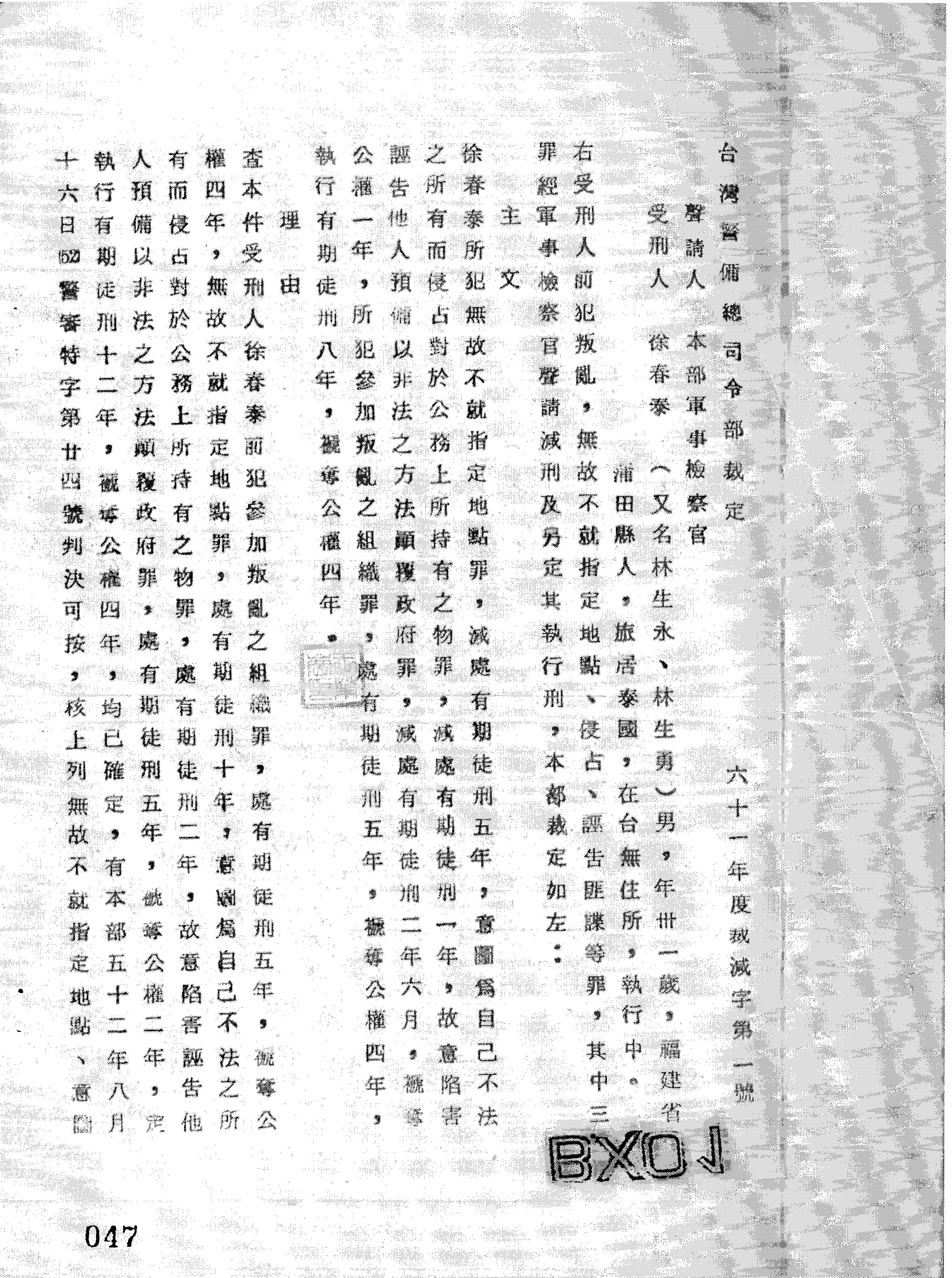 - 裁判書正題名: 臺灣警備總司令部61年裁減字第0001號裁定書