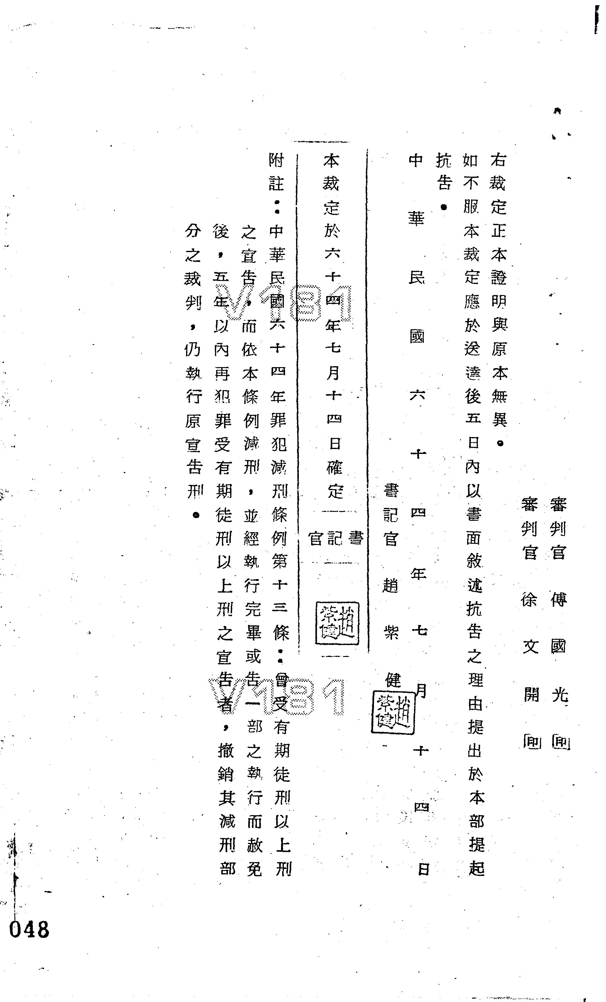 臺灣警備總司令部64年諫減字第0308號裁定書