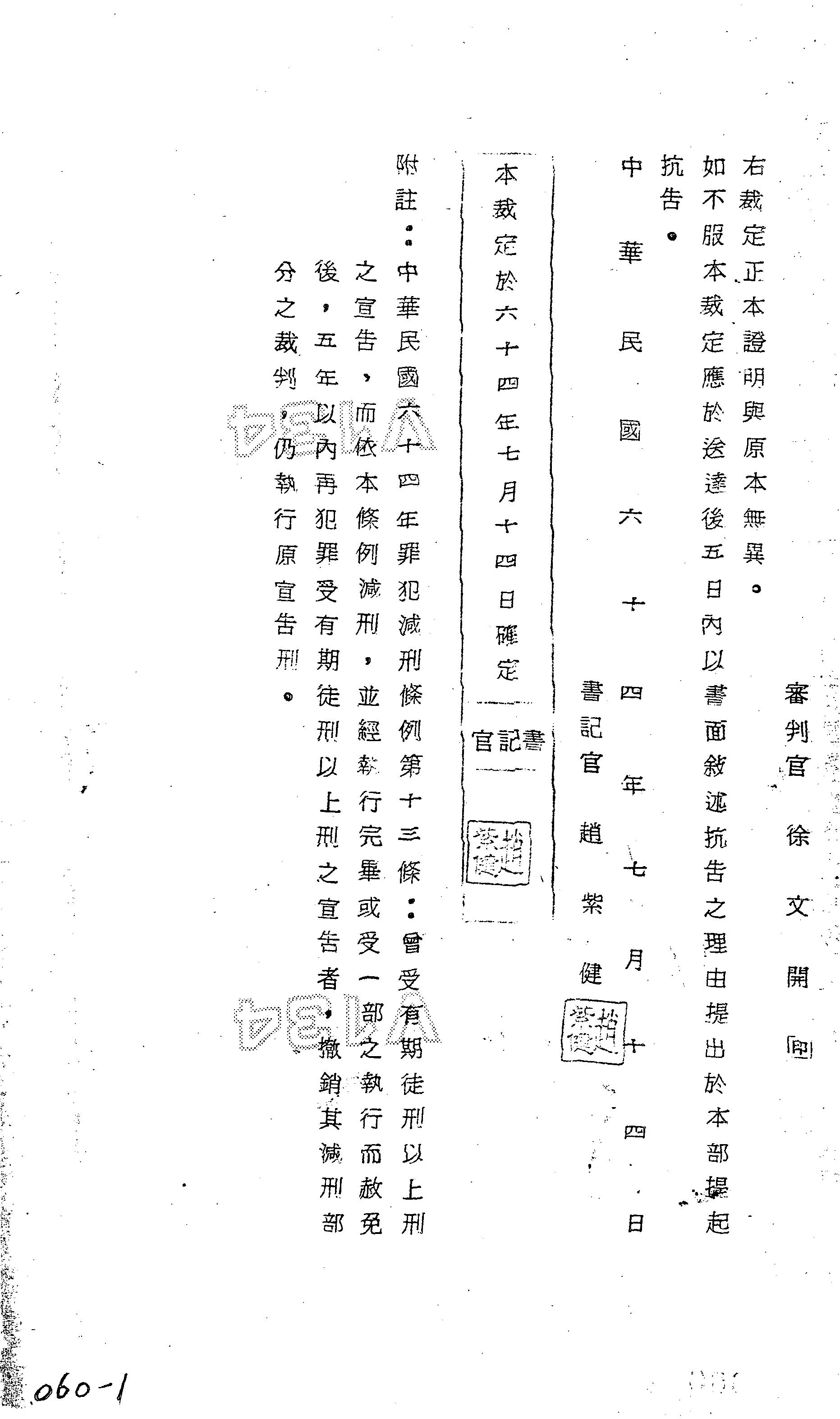 臺灣警備總司令部64年諫減字第0315號裁定書