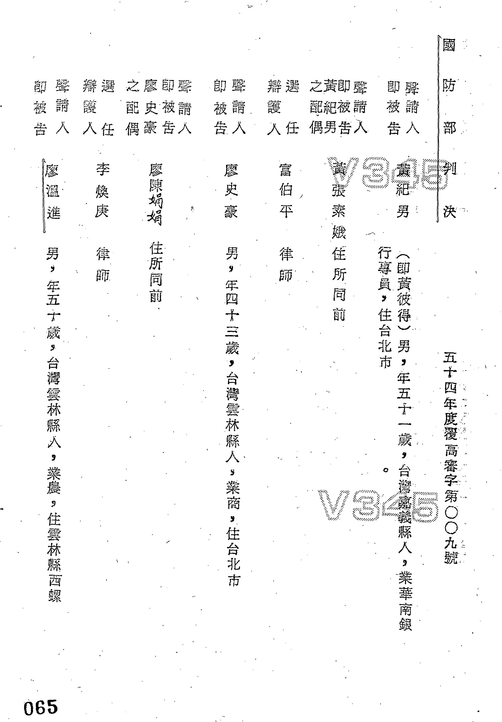 - 裁判書正題名: 國防部54年覆高審字第0009號判決書