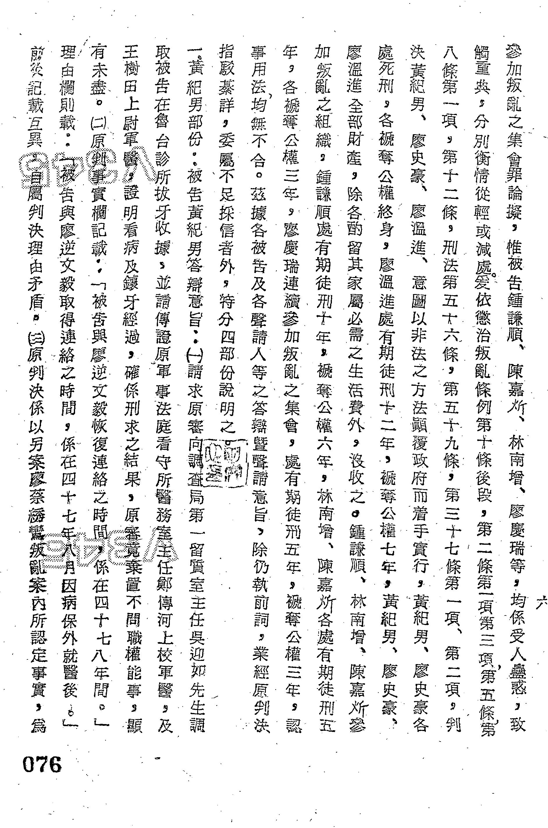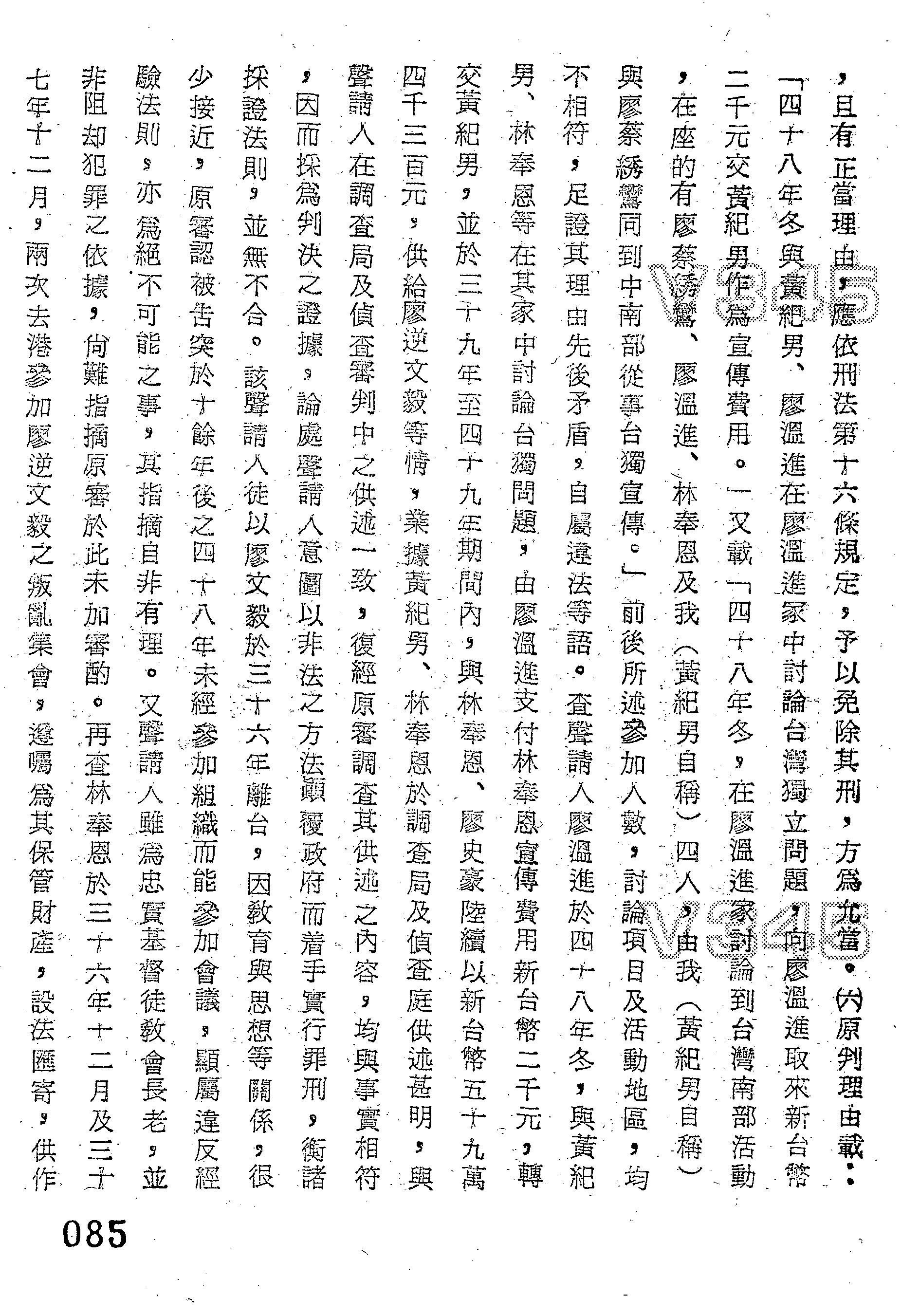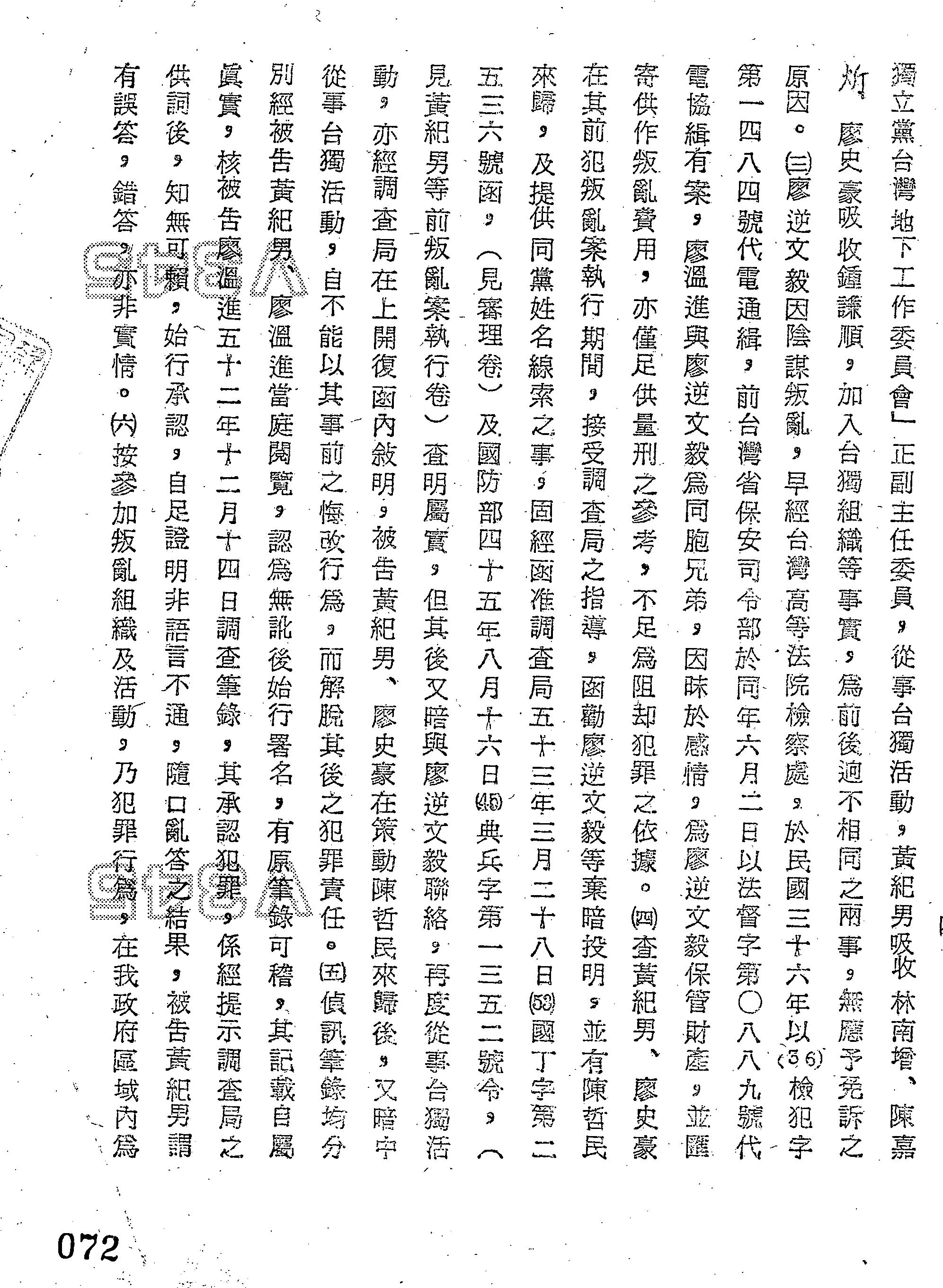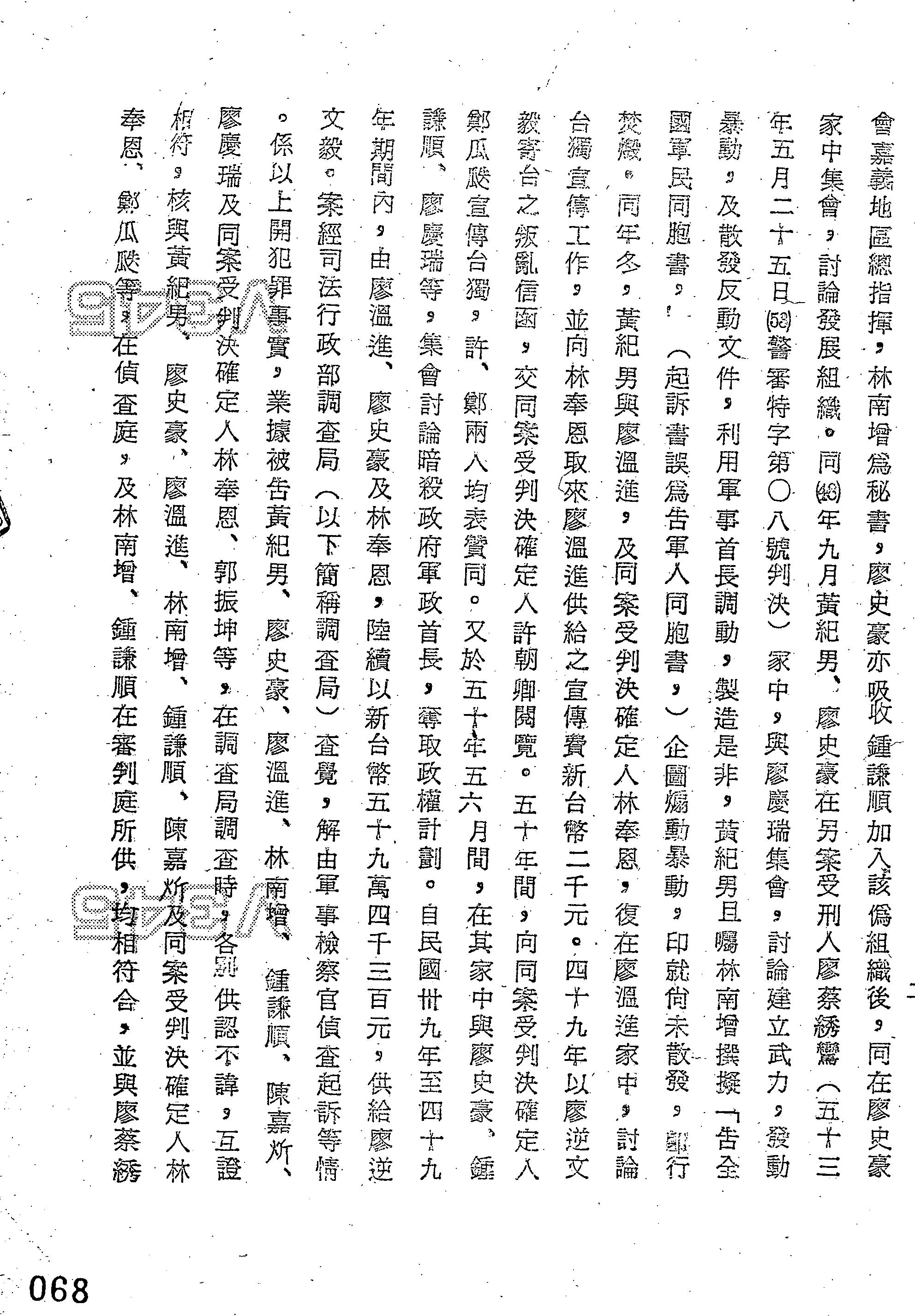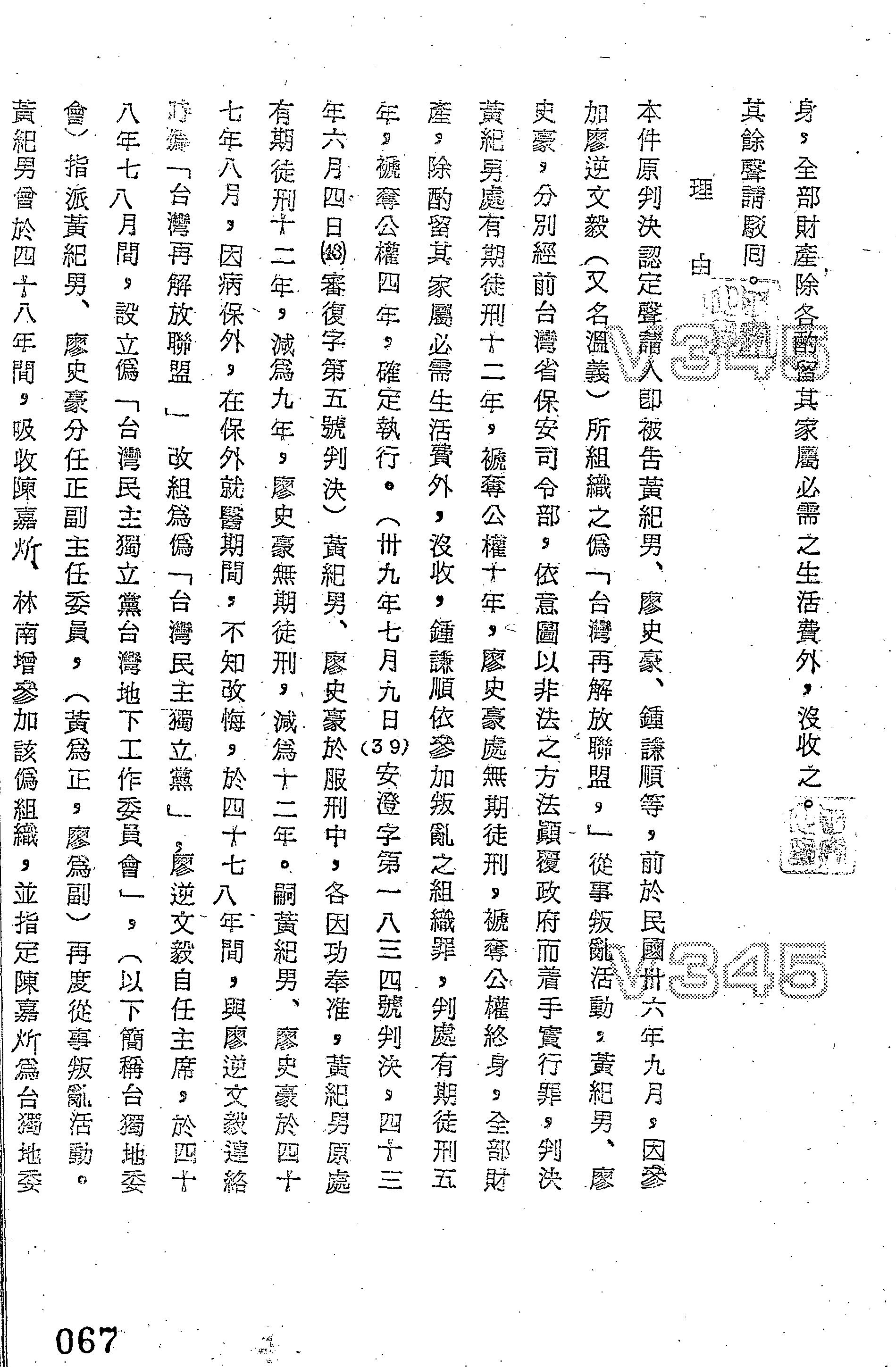 - 裁判書主文/要旨:原判決關於黃紀男、廖史豪罪刑部分撤銷。黃紀男、廖史豪「意圖以非法之方法顛覆政府而著手實行」,各處無期徒刑,各褫奪公權終身,全部財產除酌留家屬必需生活費外,沒收之。其餘聲請駁回。