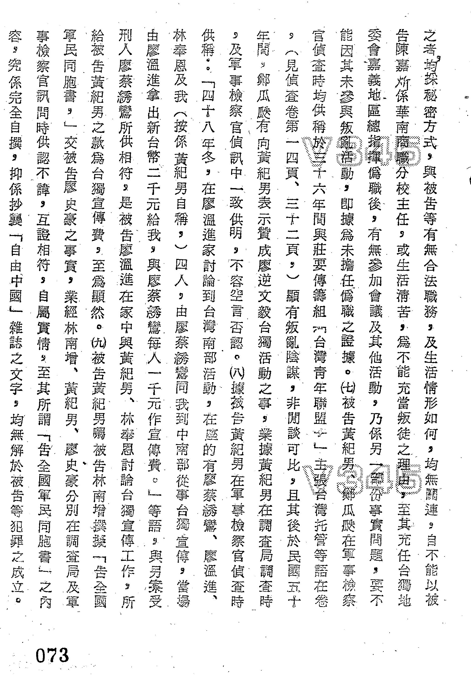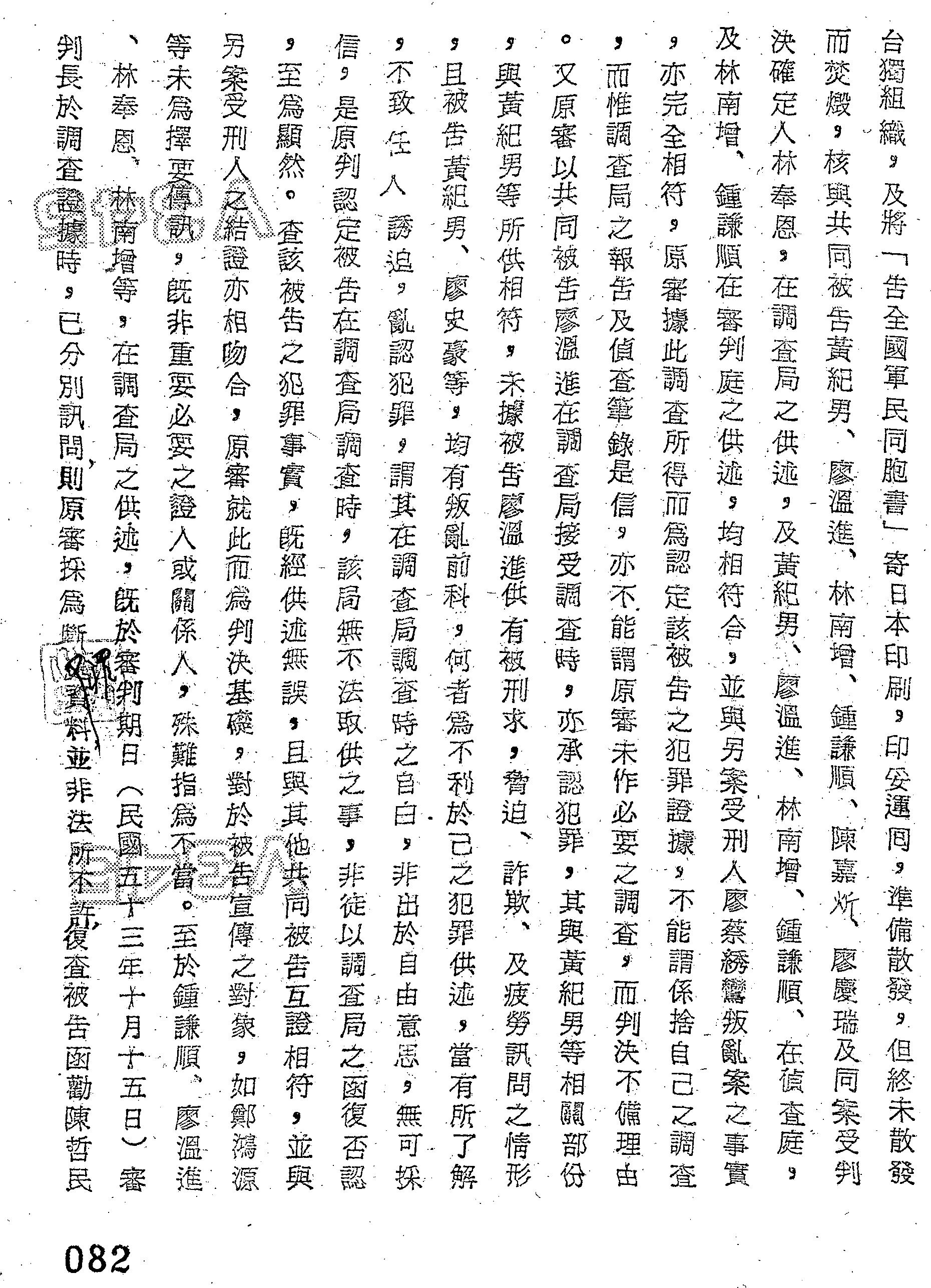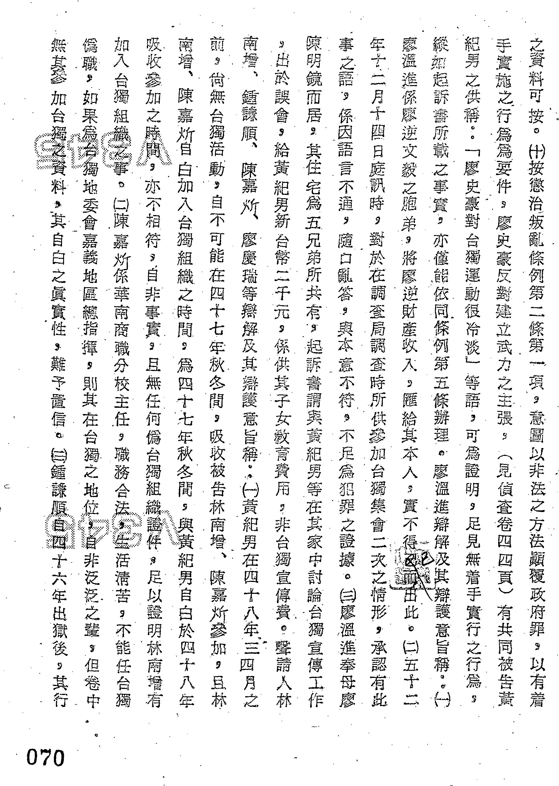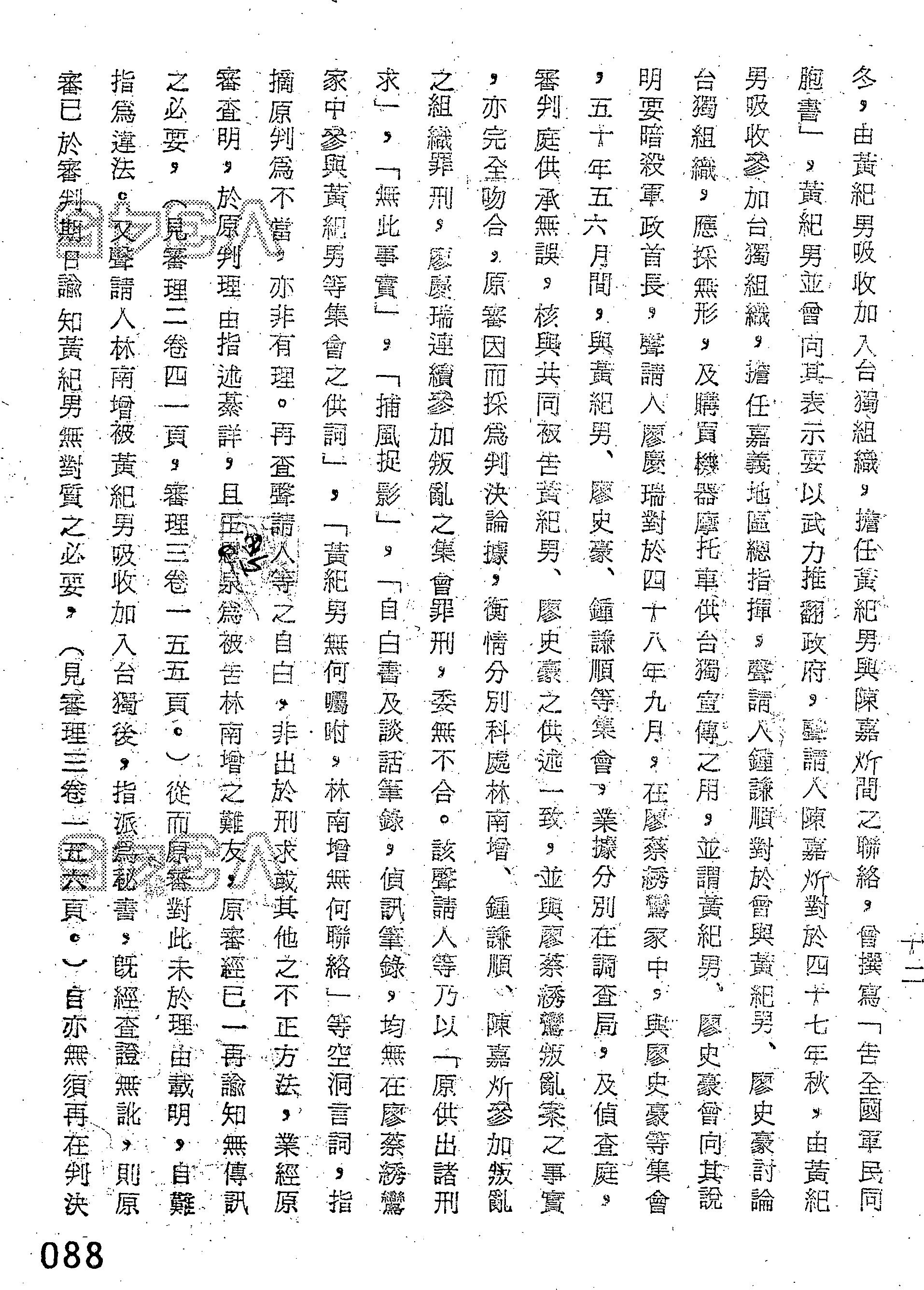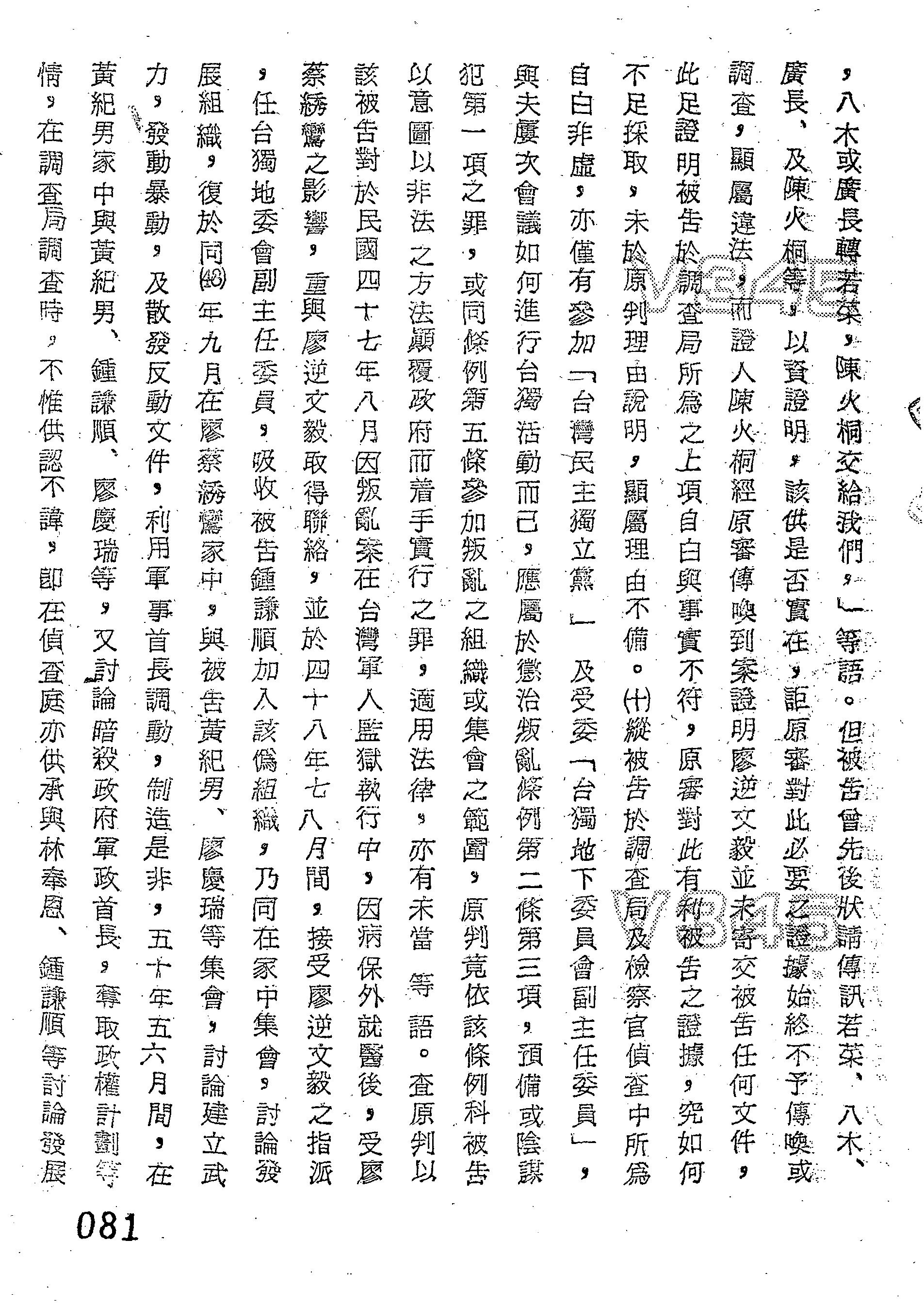 - 裁判書主文/要旨:原判決關於黃紀男、廖史豪罪刑部分撤銷。黃紀男、廖史豪「意圖以非法之方法顛覆政府而著手實行」,各處無期徒刑,各褫奪公權終身,全部財產除酌留家屬必需生活費外,沒收之。其餘聲請駁回。
