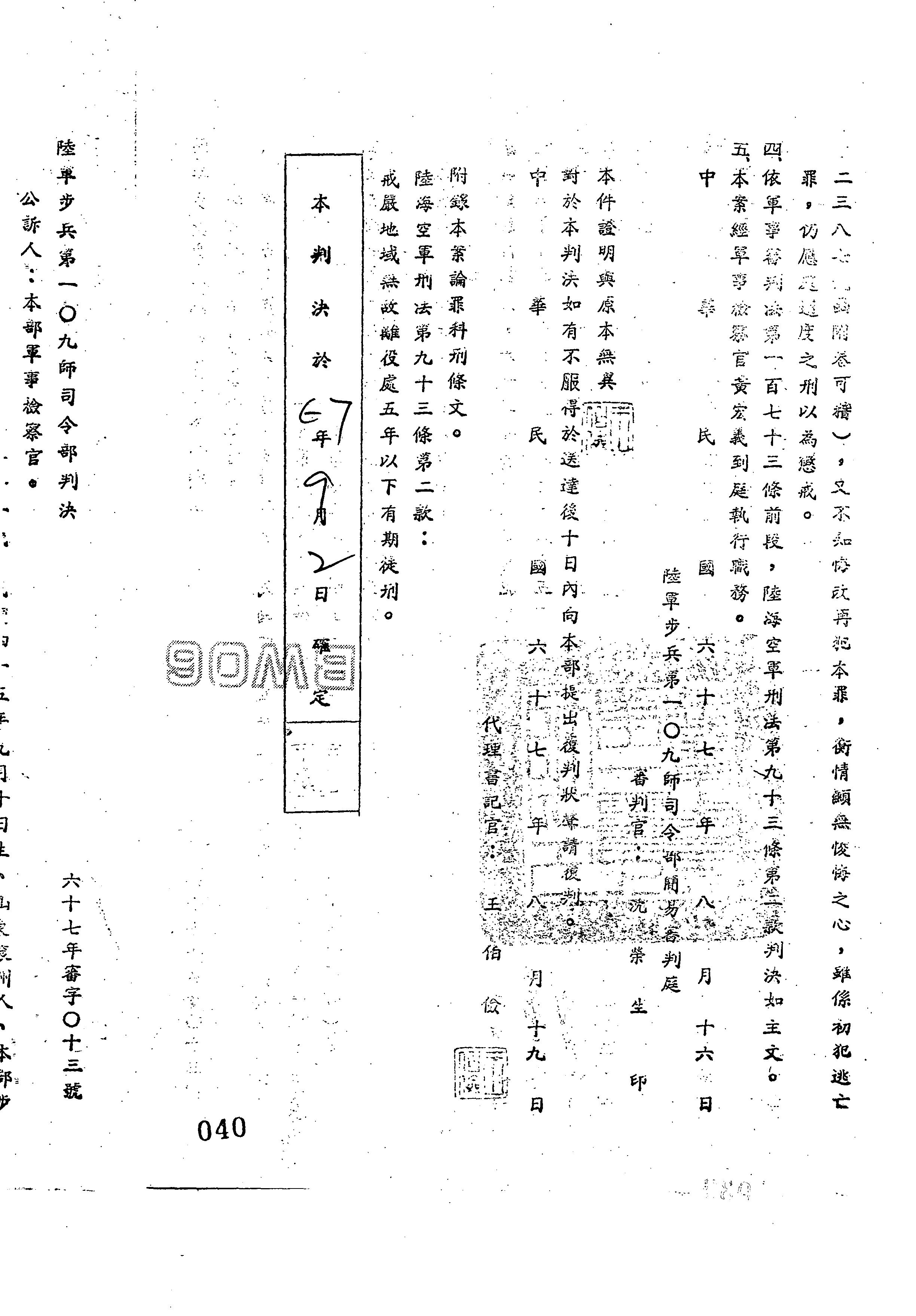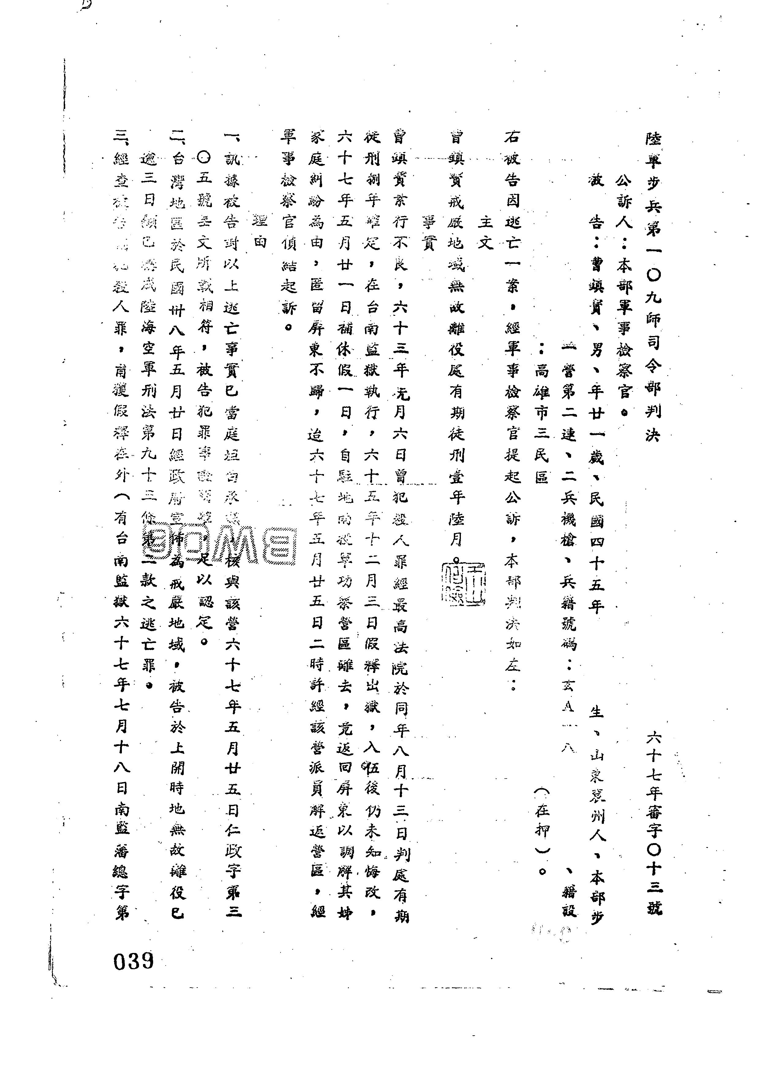 陸軍步兵第一○九師司令部67年審字第0013號判決書
