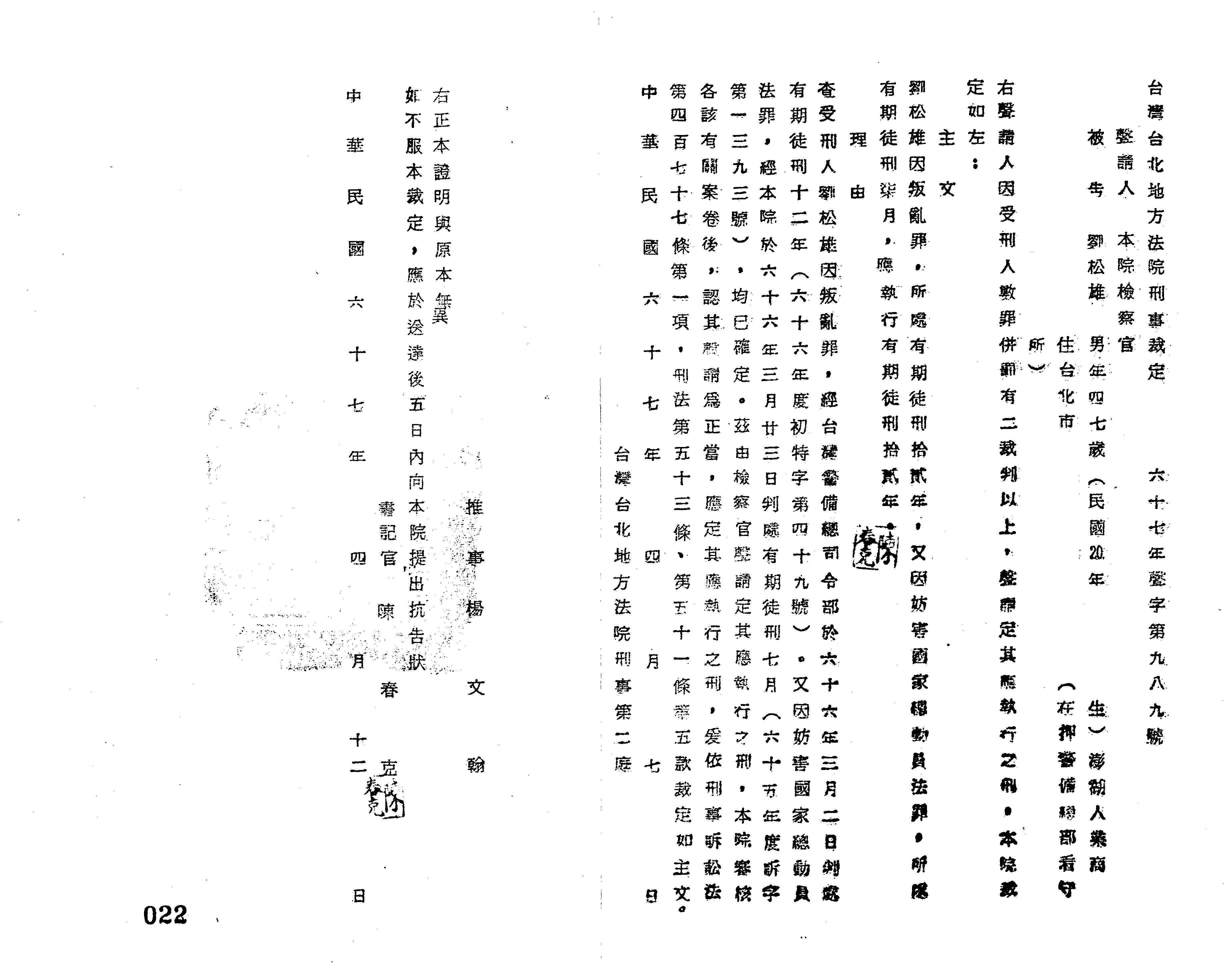 裁判書主文/要旨:劉松雄因叛亂罪,所處有期徒刑12年,又因妨害國家總動員法罪,所處有期徒刑7月,應執行有期徒刑12年。