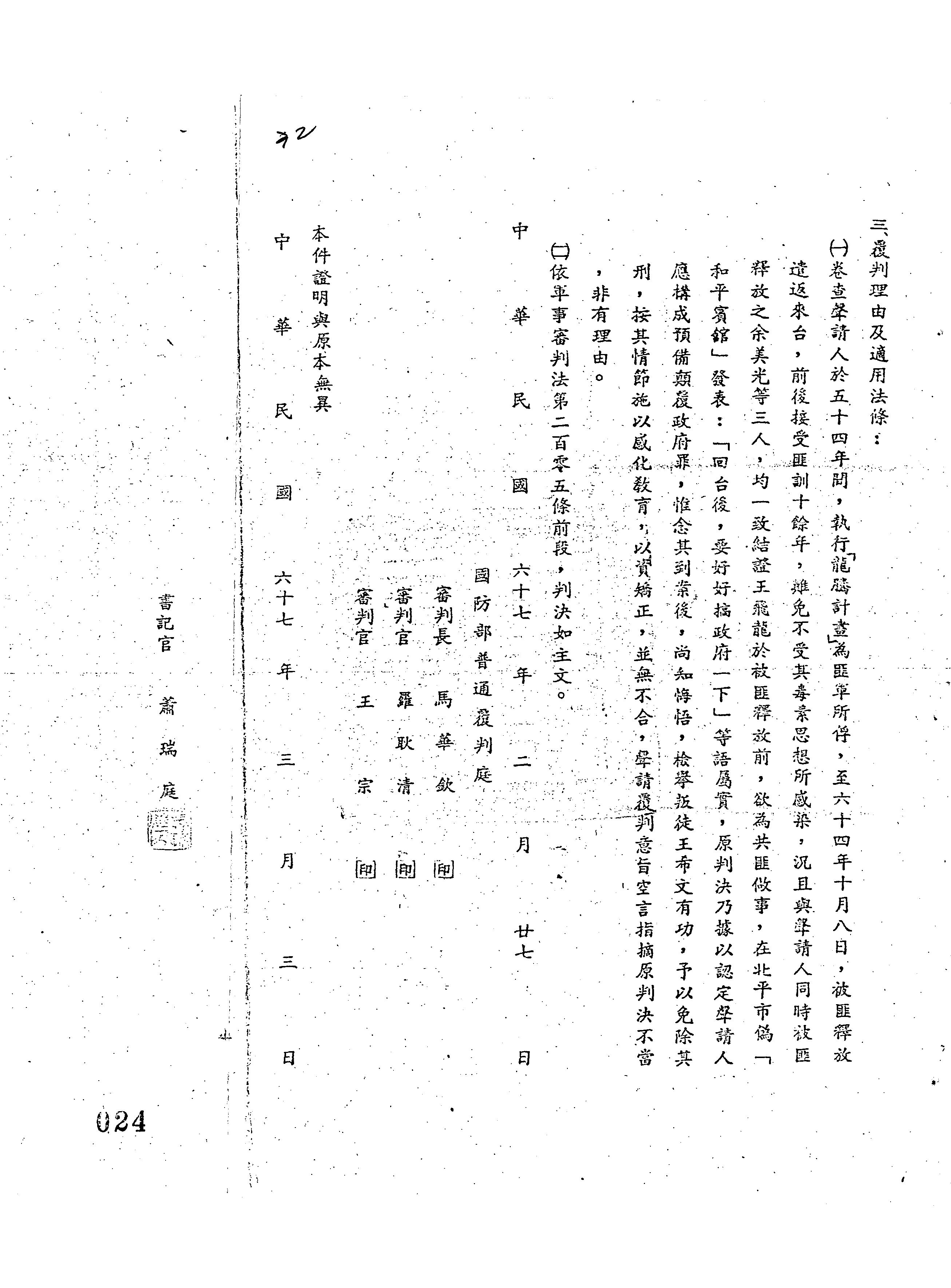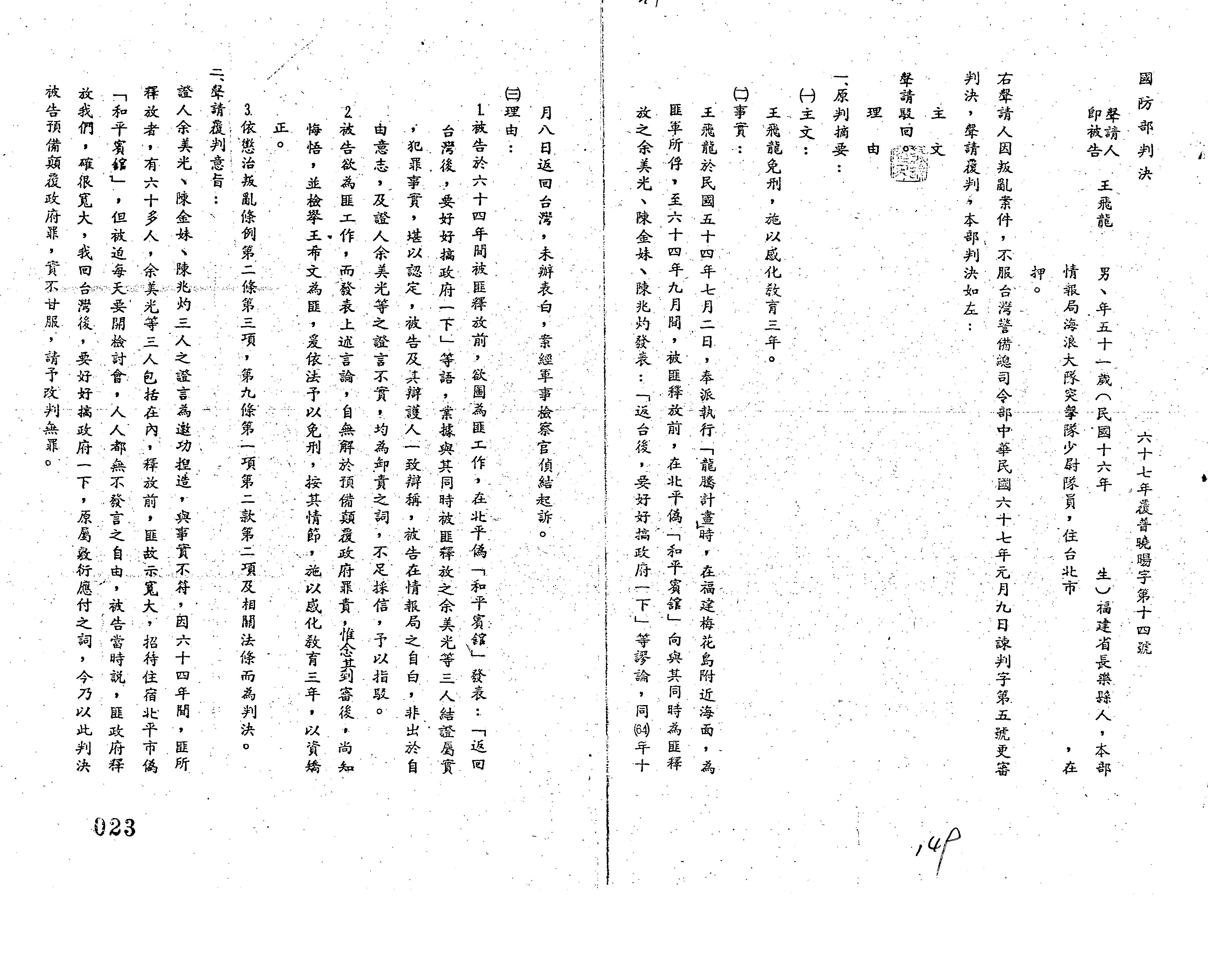 國防部67年覆普曉暘字第0014號判決書