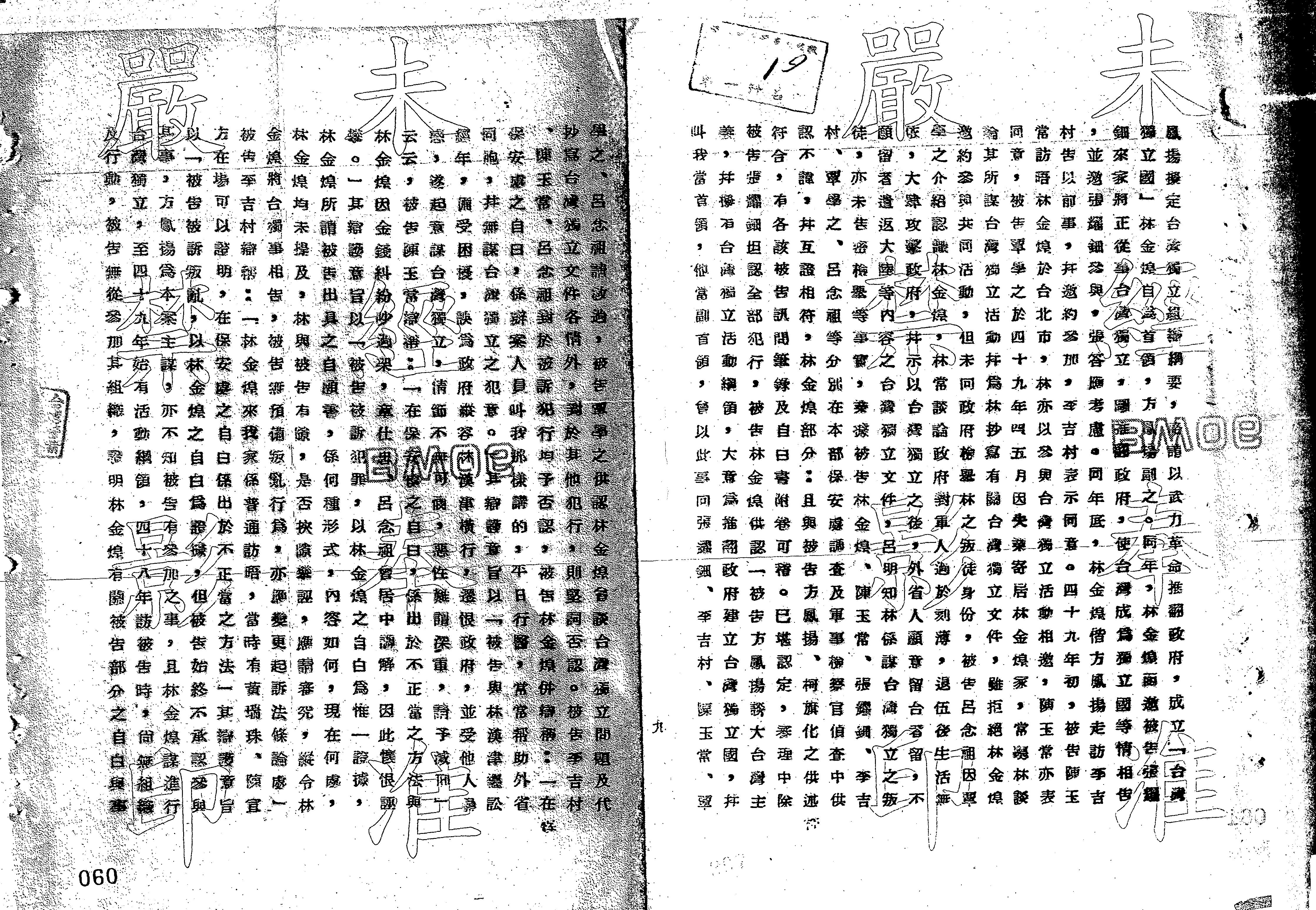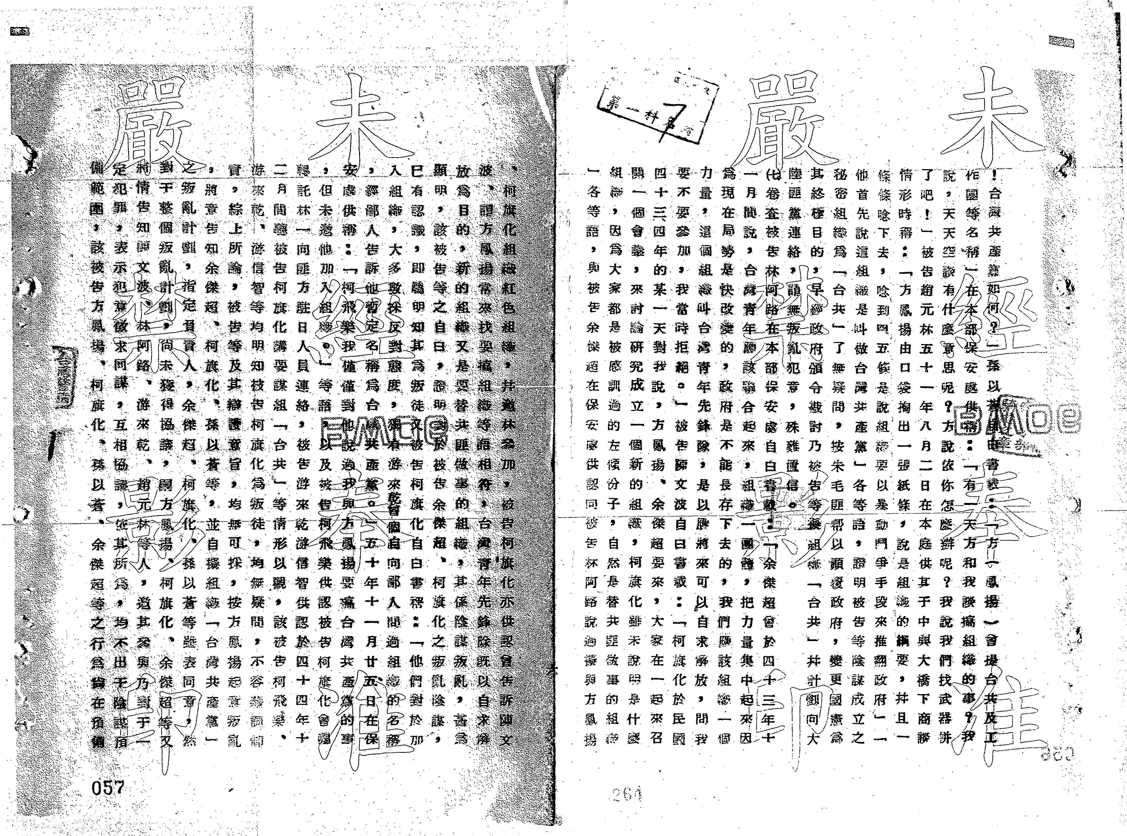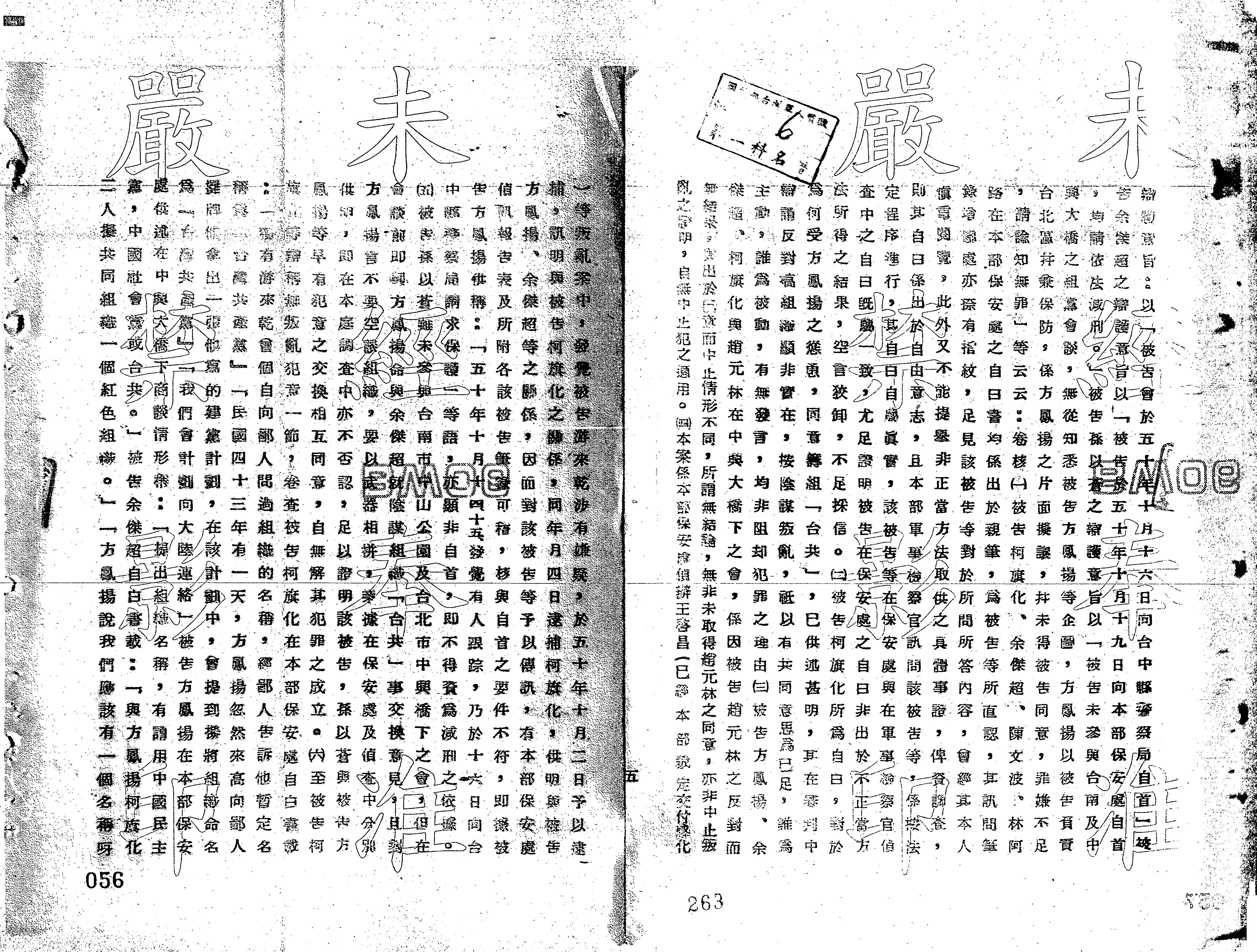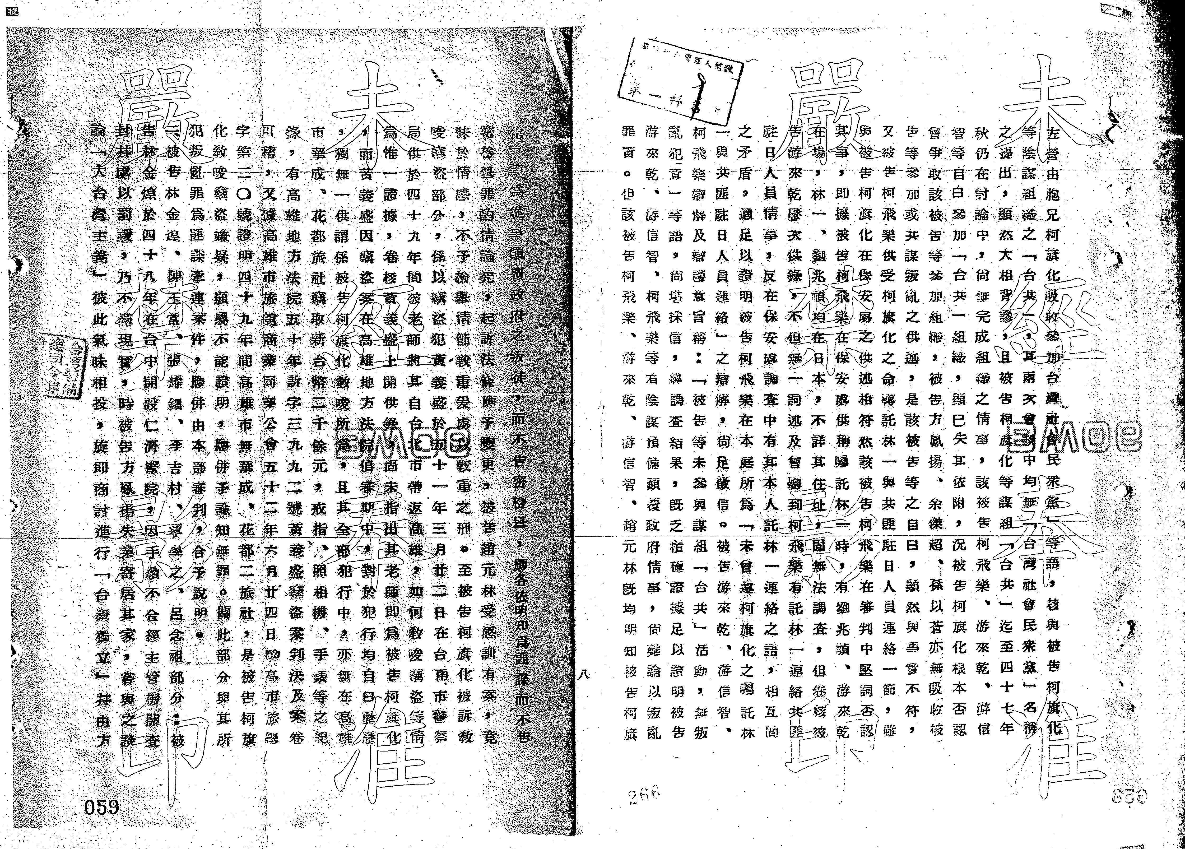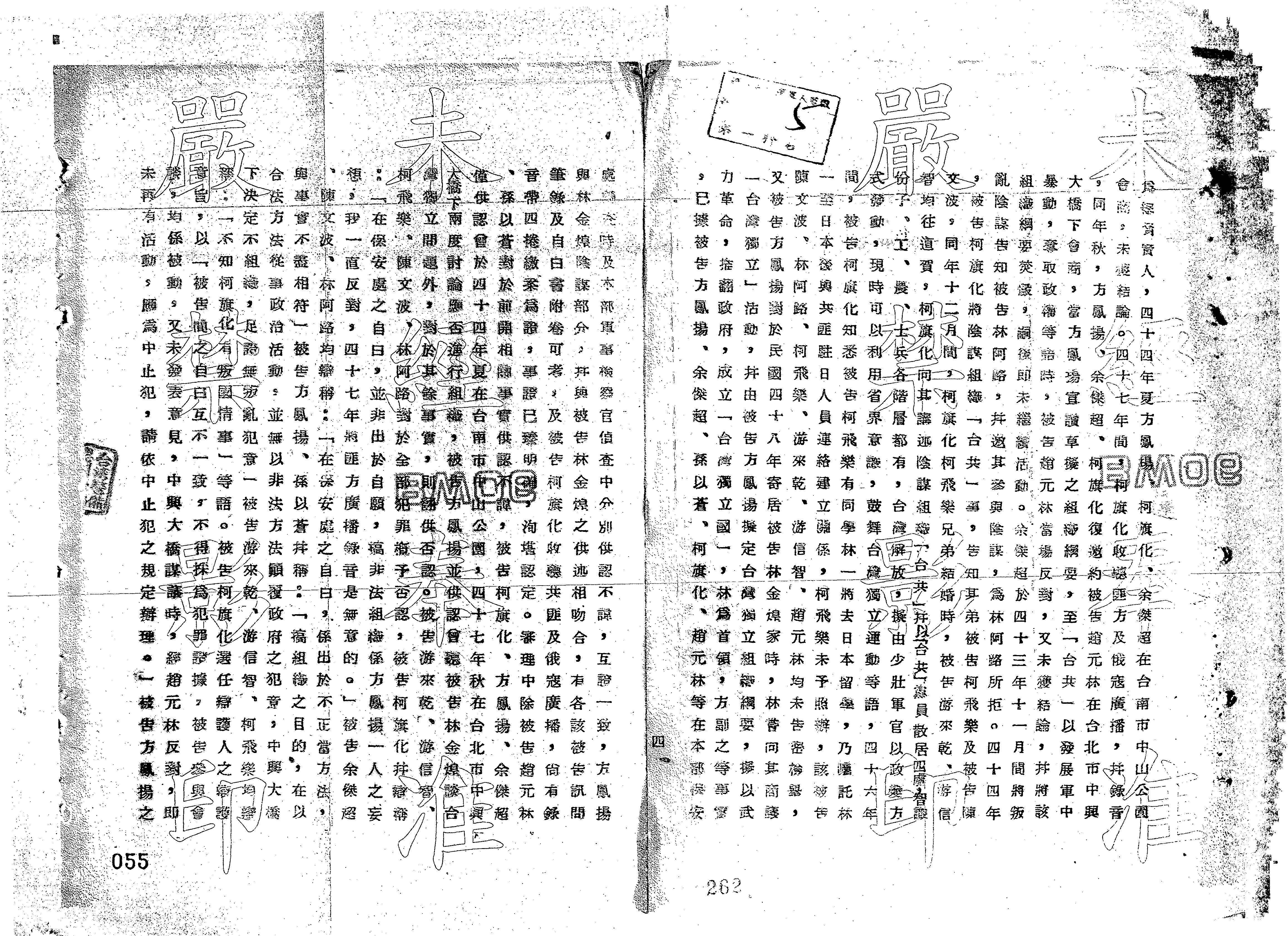 - 裁判書主文/要旨:方鳳揚、余傑超、孫以蒼、林金煌「預備以非法之方法顛覆政府」,方鳳揚處有期徒刑14年,褫奪公權7年;余傑超、孫以蒼,各處有期徒刑12年,各褫奪公權6年。林金煌處有期徒刑10年,褫奪公權5年。柯旗化「預備以非法之方法顛覆政府」,處有期徒刑12年,褫奪公權6年;其餘部分無罪。李吉村「累犯陰謀以非法之方法顛覆政府」,處有期徒刑8年,褫奪公權4年。陳玉常、張耀鈿「陰謀以非法之方法顛覆政府」,各處有期徒刑5年,褫奪公權2年。趙元林、林阿路、陳文波、柯飛樂、游來乾、游信智、覃學之、呂念祖「明知為匪諜而不告密檢舉」,趙元林、林阿路、陳文波各處有期徒刑3年6月;柯飛樂、游來乾、游信智、覃學之、呂念祖各處有期徒刑2年。共匪及俄寇廣播錄音4捲沒收之。