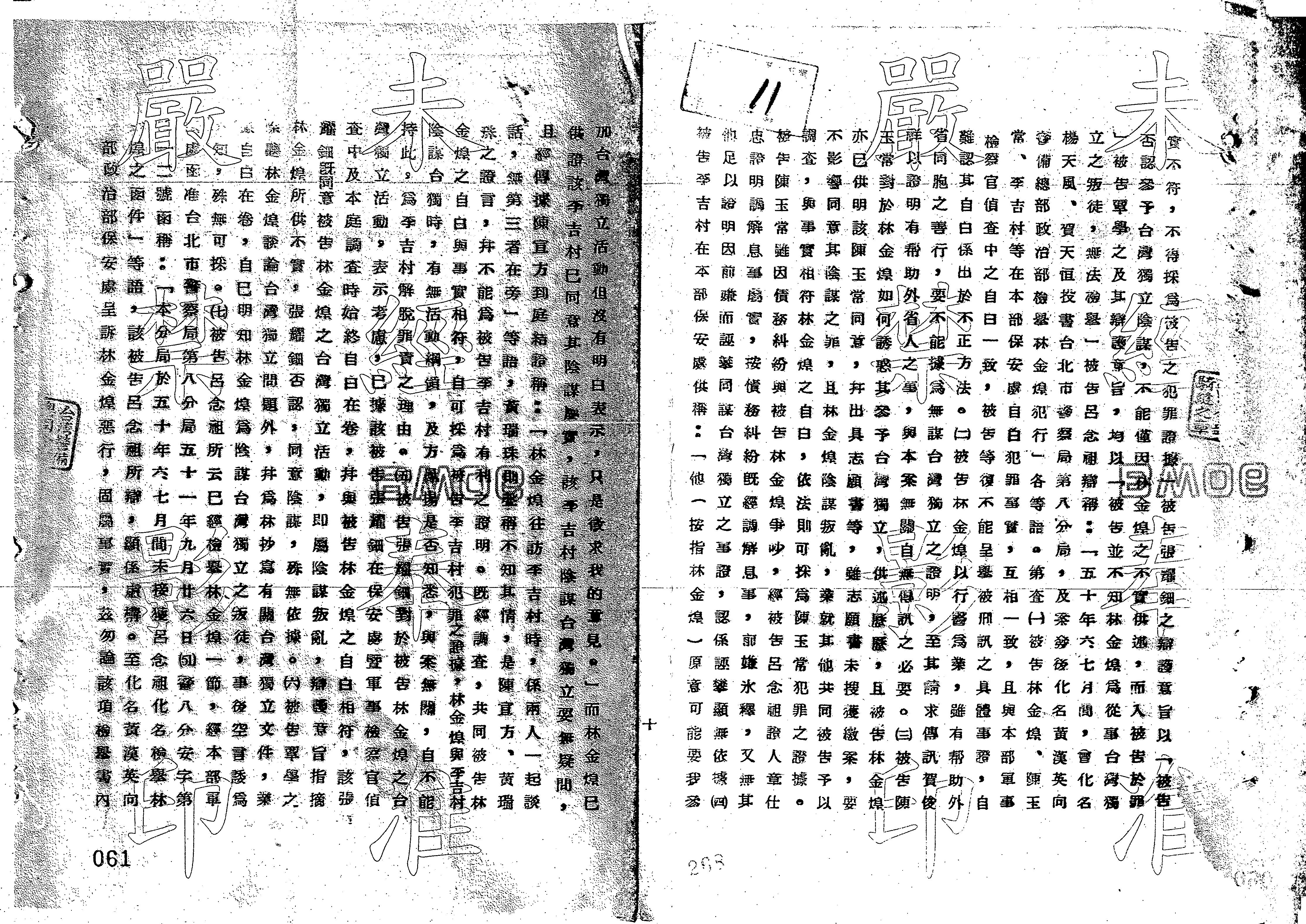 - 法條:軍事審判法第173條前段、第174條;懲治叛亂條例第10條後段、第2條第3項、第12條;戒嚴法第8條第2項;戡亂時期檢肅匪諜條例第9條、第11條;刑法第47條、第59條、第37條第2項、第38條第1項第1款