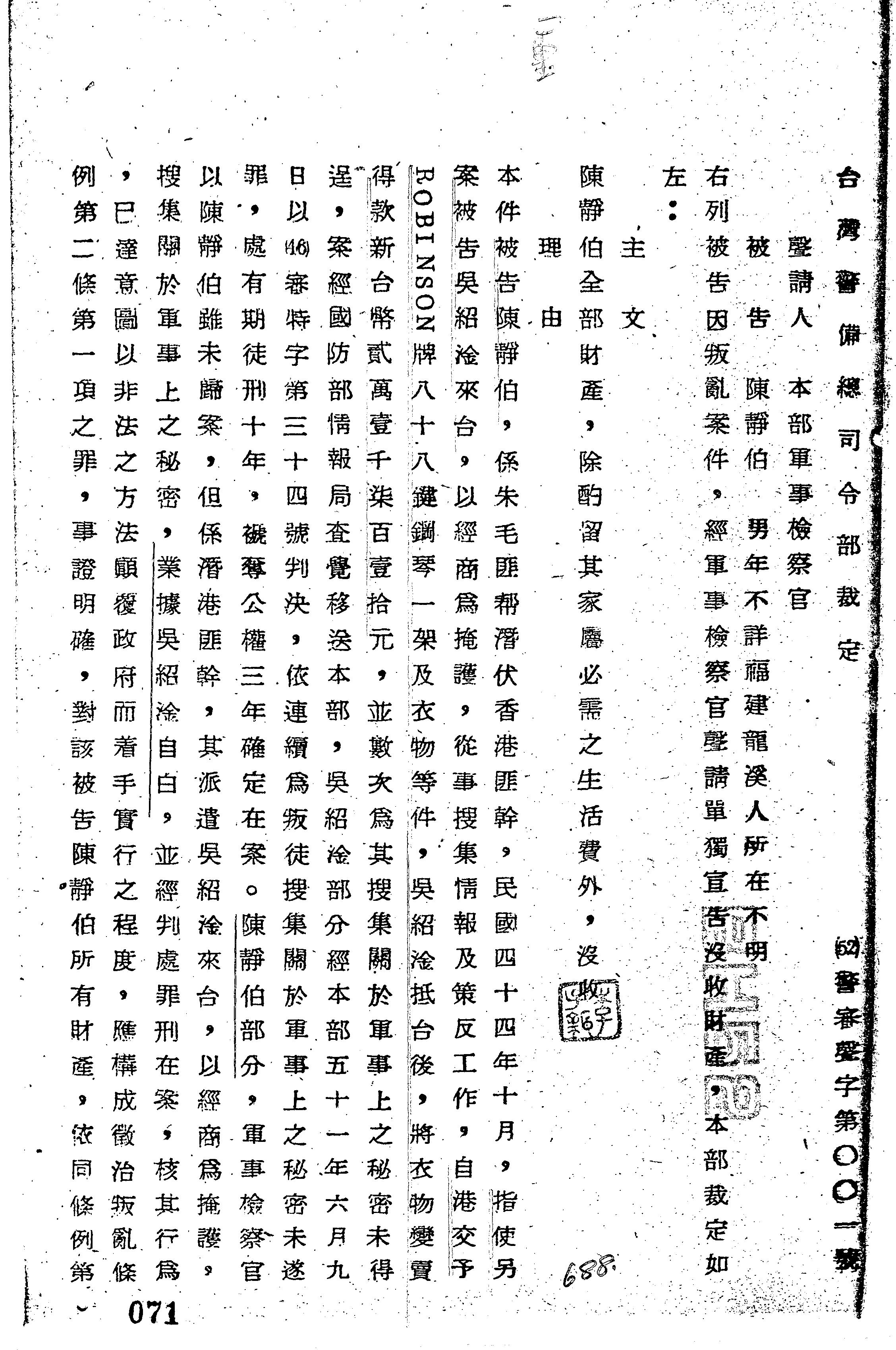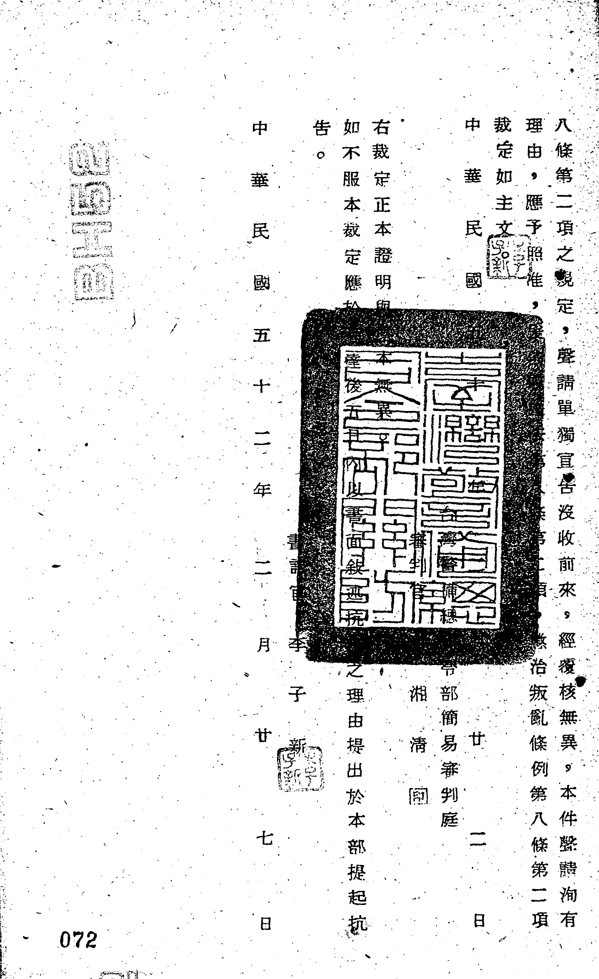 臺灣警備總司令部52年警審聲字第0001號裁定書