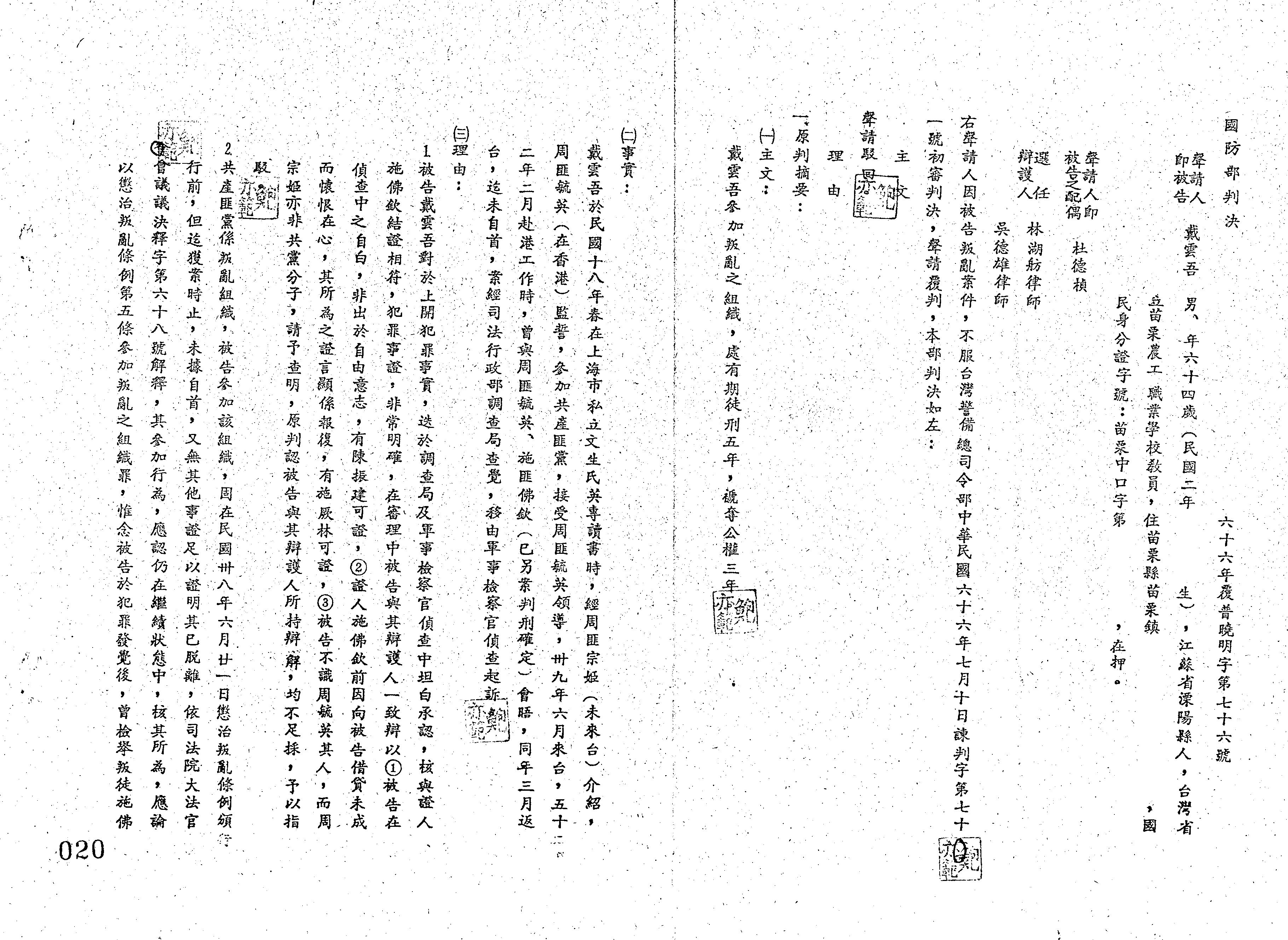 國防部66年覆普曉明字第0076號判決書