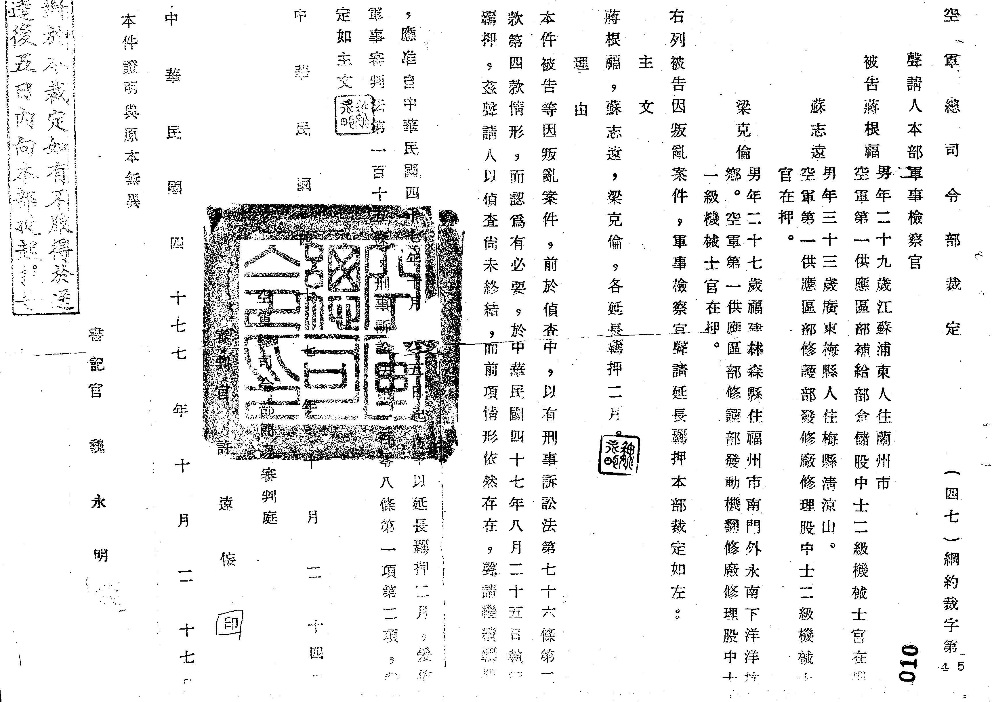 裁判書主文/要旨:蔣根福、蘇志遠、梁克倫各延長羈押2月。