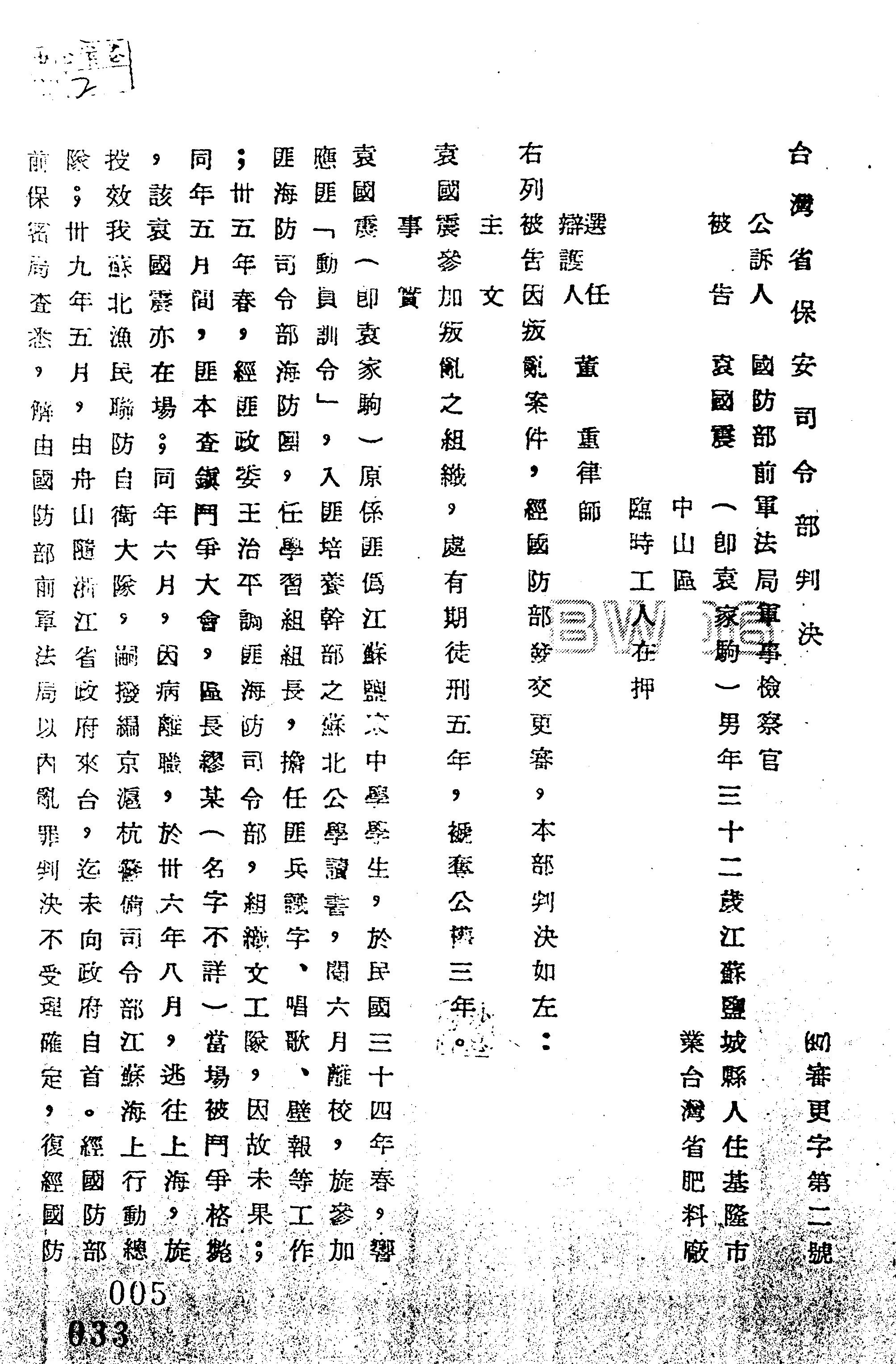 裁判書主文/要旨:袁國震「參加叛亂之組織」處有期徒刑5年,褫奪公權3年。