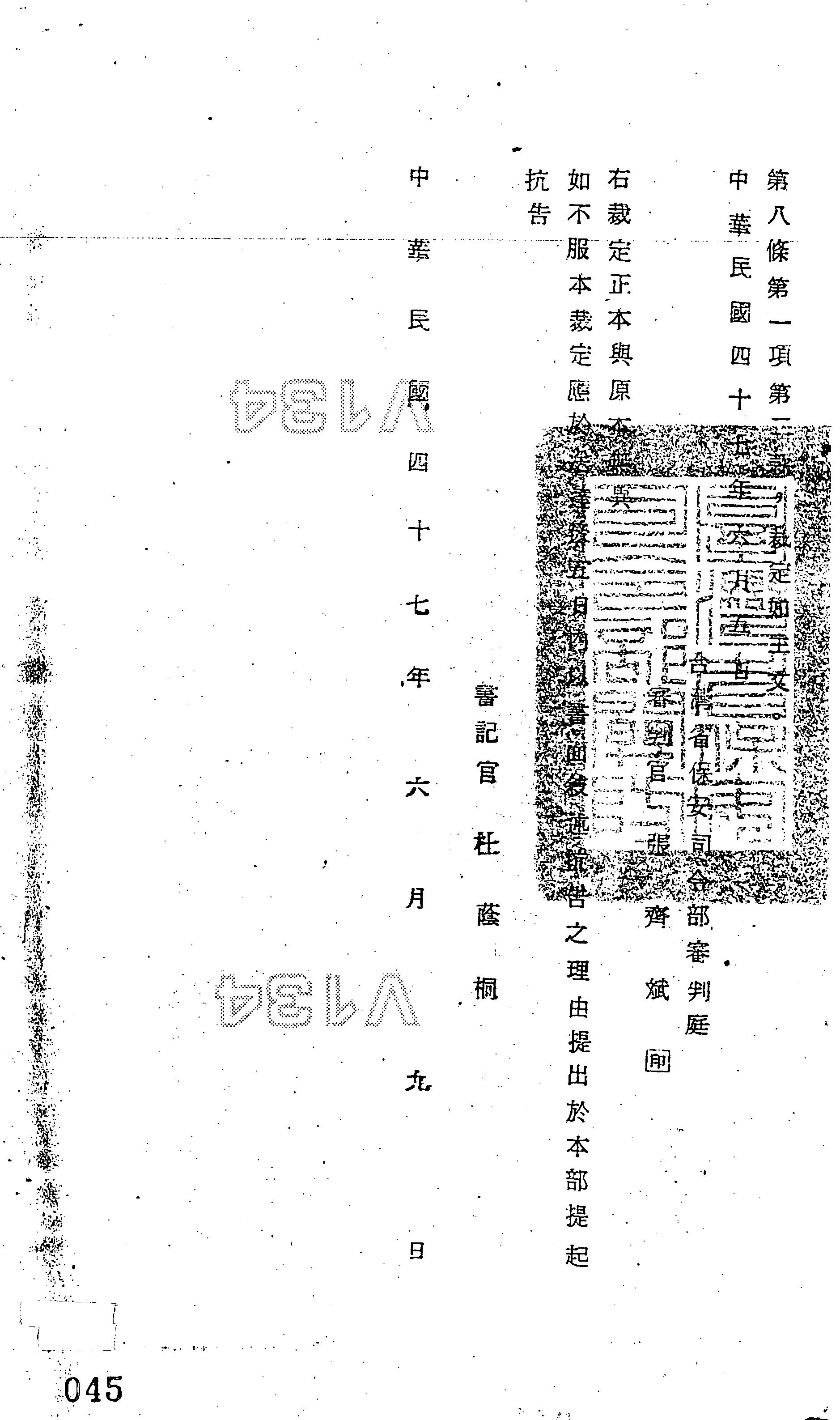 臺灣省保安司令部47年審聲字第0048號裁定書