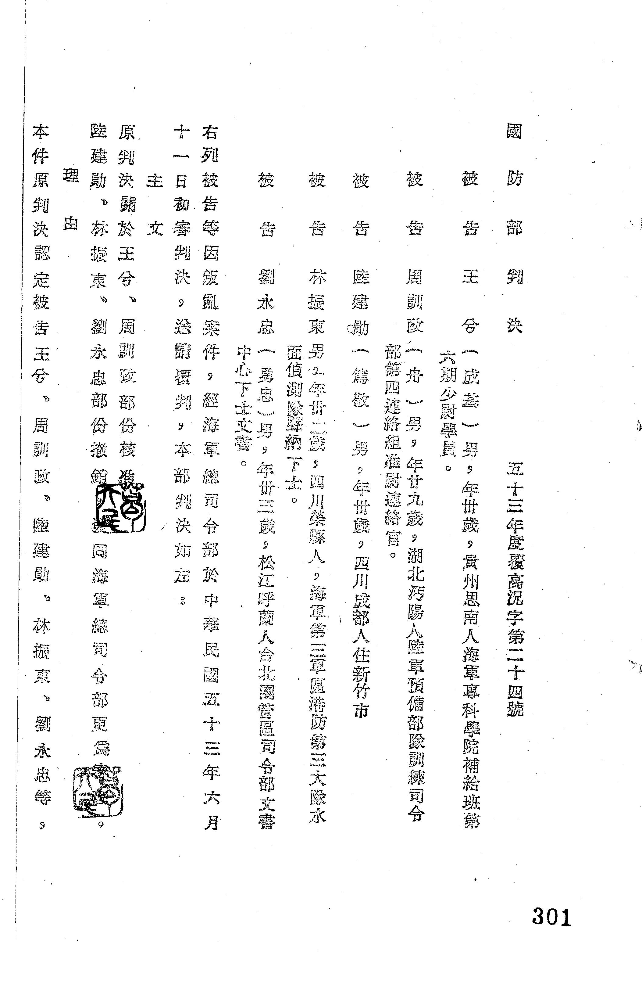 裁判書主文/要旨:原判決關於王兮、周訓政部分核准。陸建勛、林振東、劉永忠部分撤銷,發回海軍總司令部更為審理。