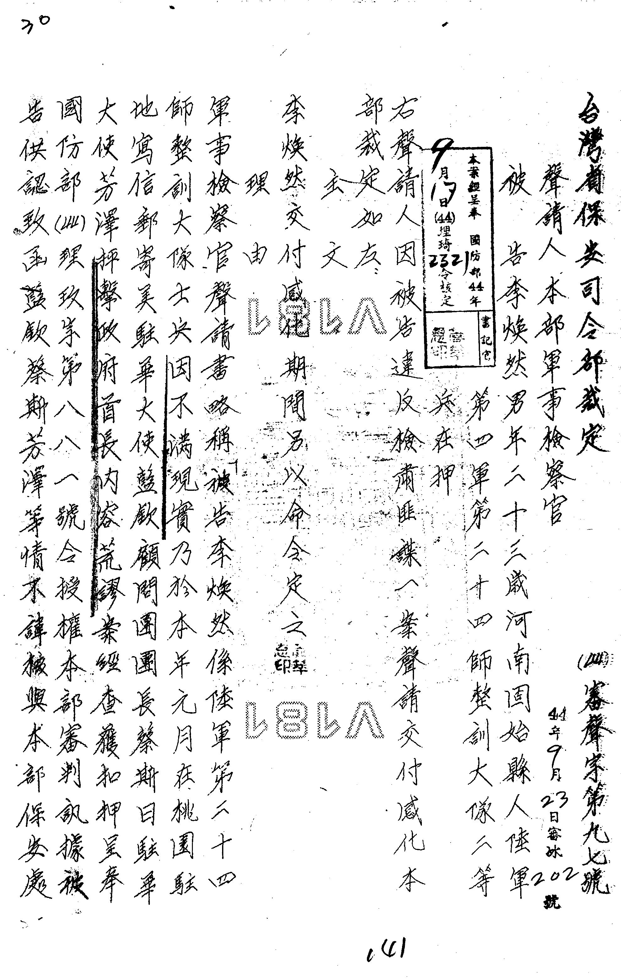 臺灣省保安司令部44年審聲字第0097號裁定書