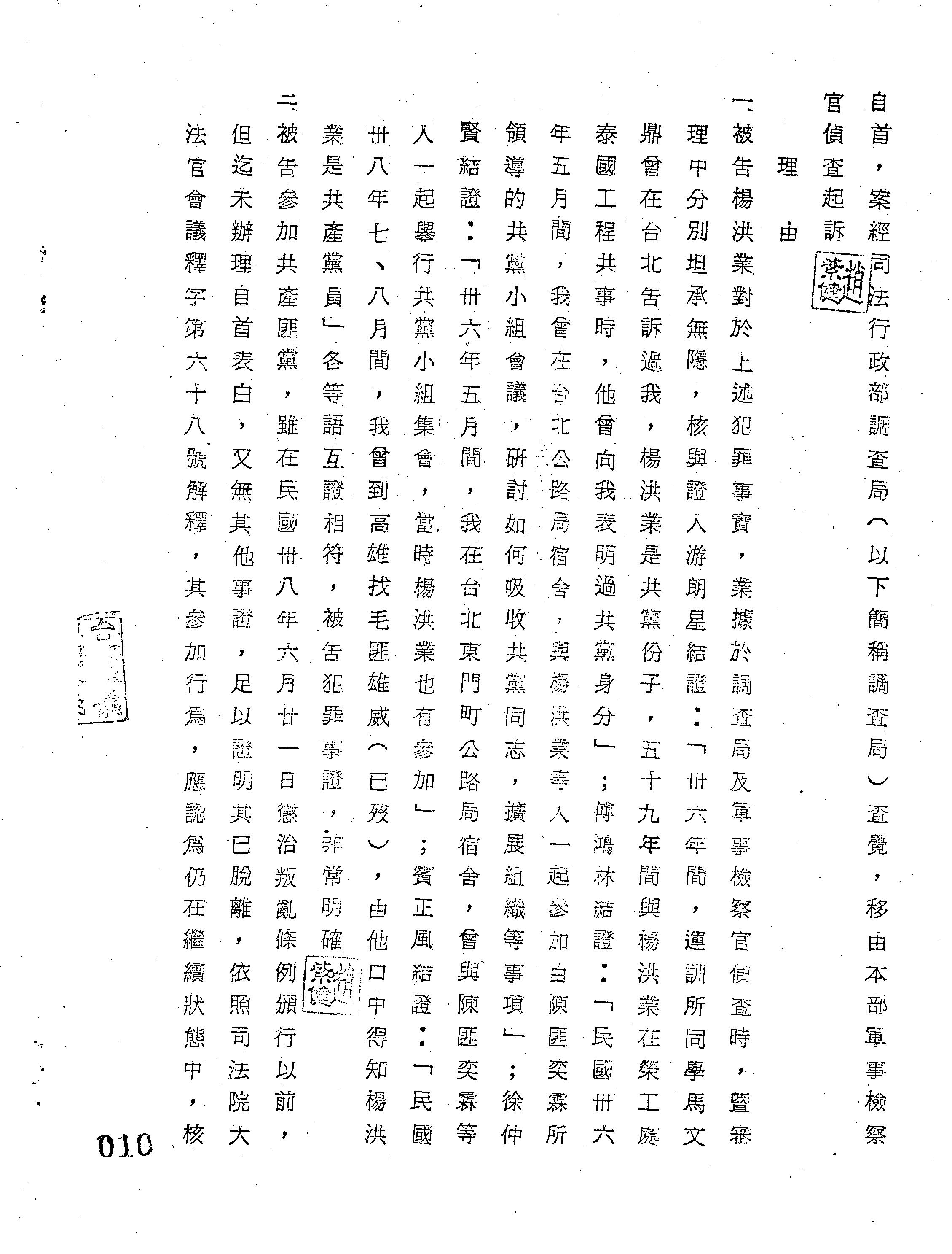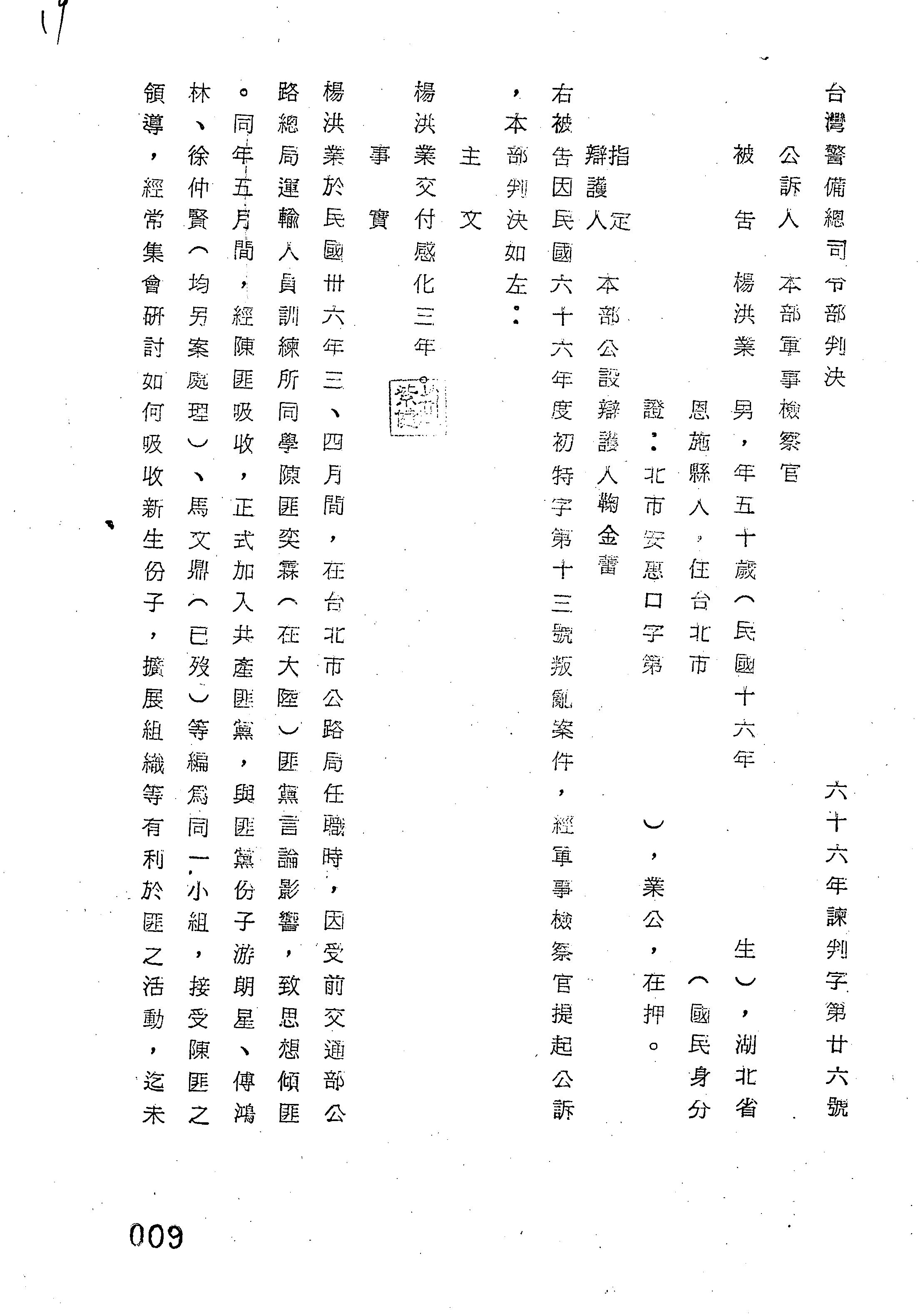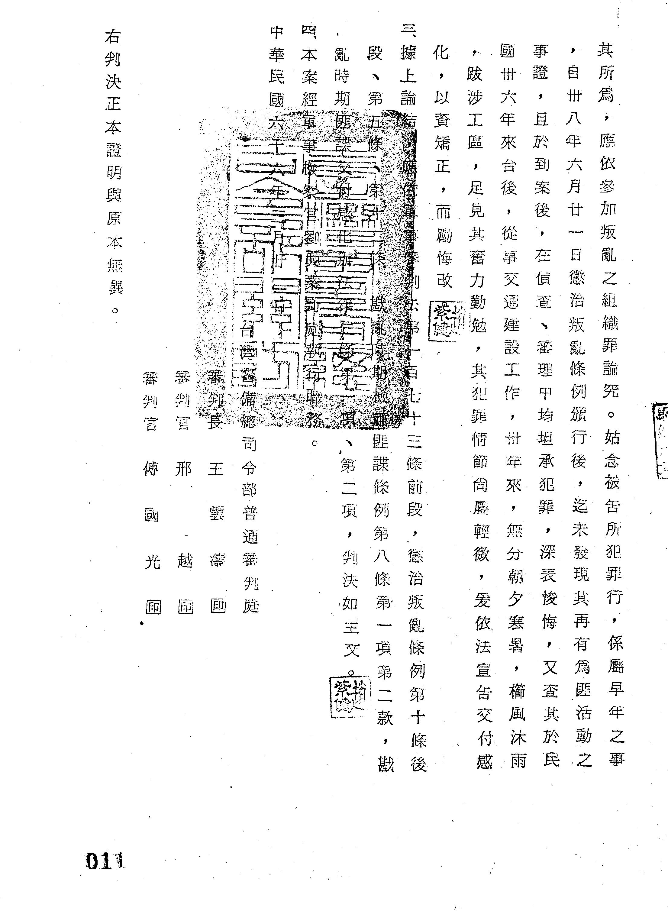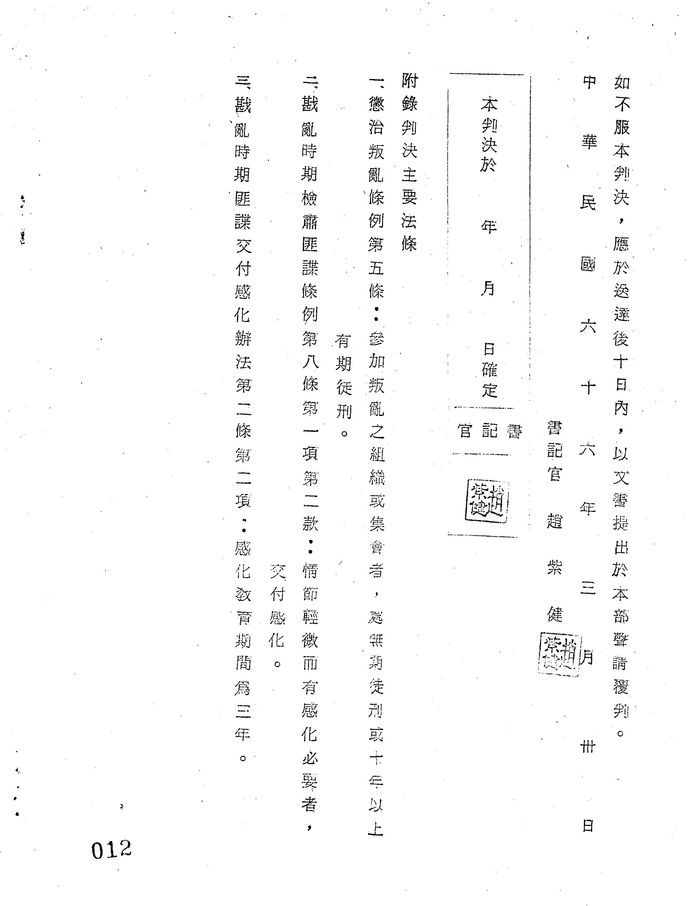 法條:軍事審判法第173條前段;懲治叛亂條例第10條後段、第5條、第12條;戡亂時期檢肅匪諜條例第8條第1項第2款;戡亂時期匪諜交付感化辦法第2條第1項、第2條第2項