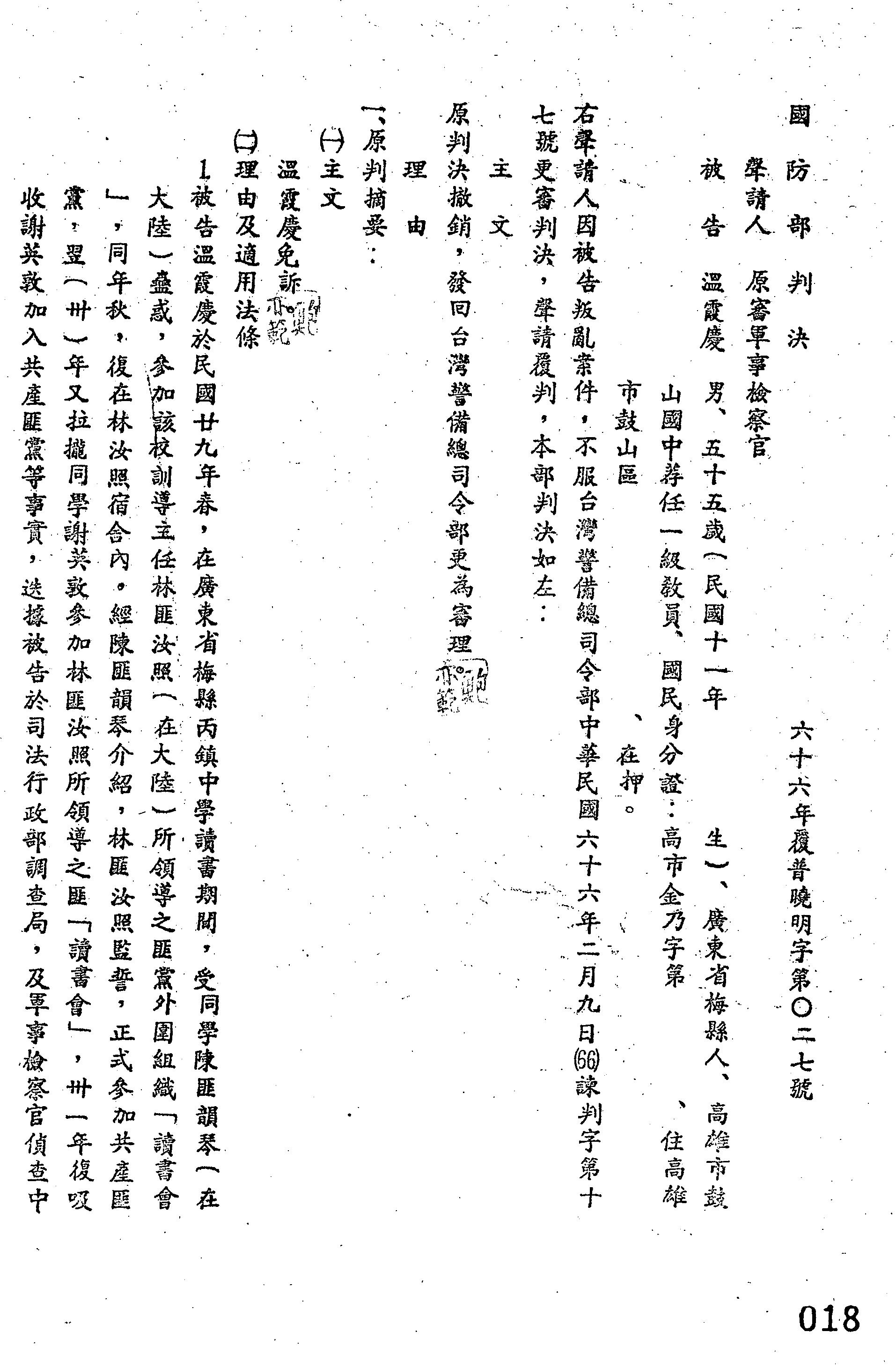 國防部66年覆普曉明字第0027號判決書
