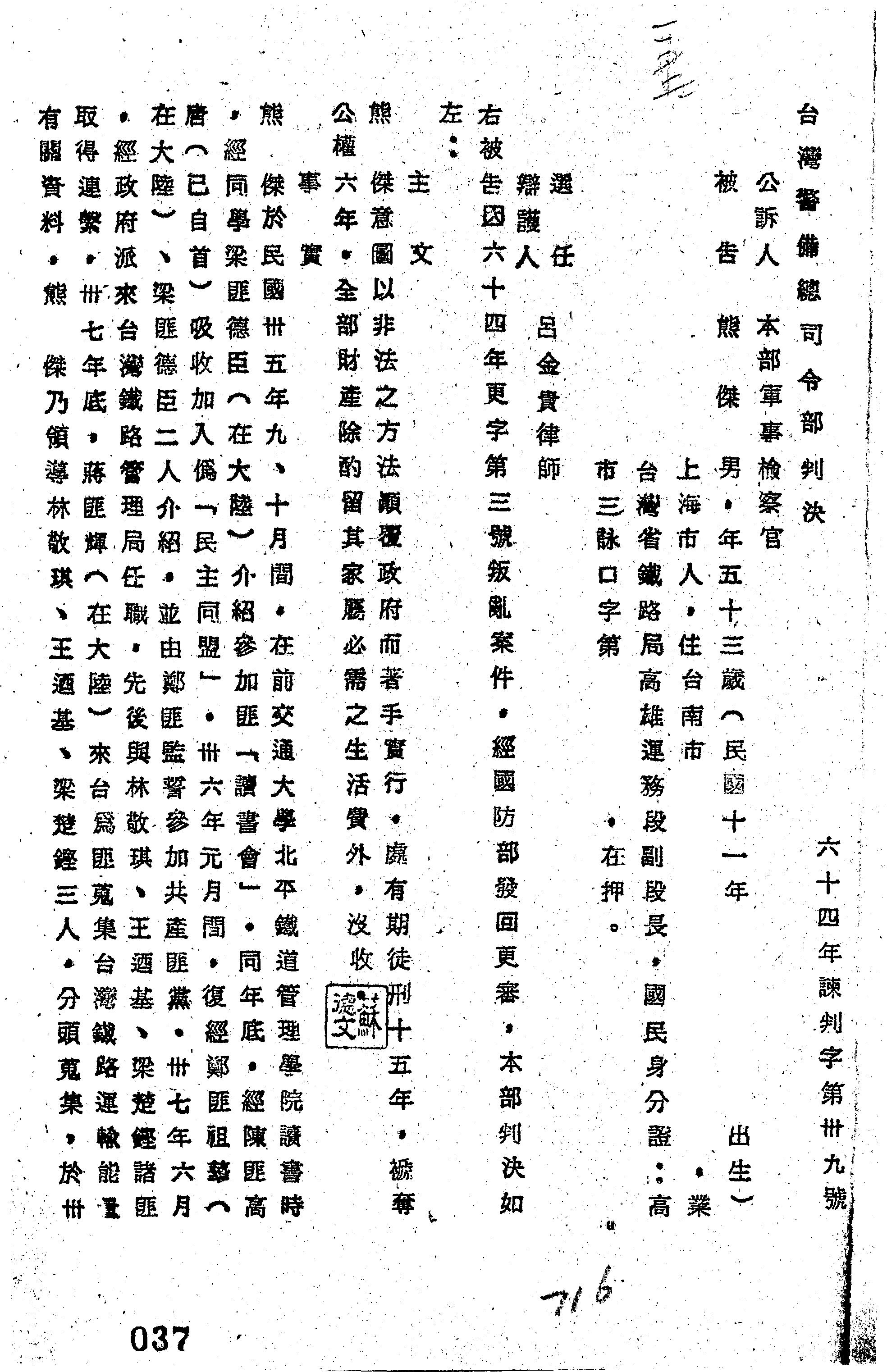 裁判書主文/要旨:熊傑「意圖以非法之方法顛覆政府而著手實行」,處有期徒刑15年,褫奪公權6年,全部財產除酌留其家屬必需之生活費外,沒收。