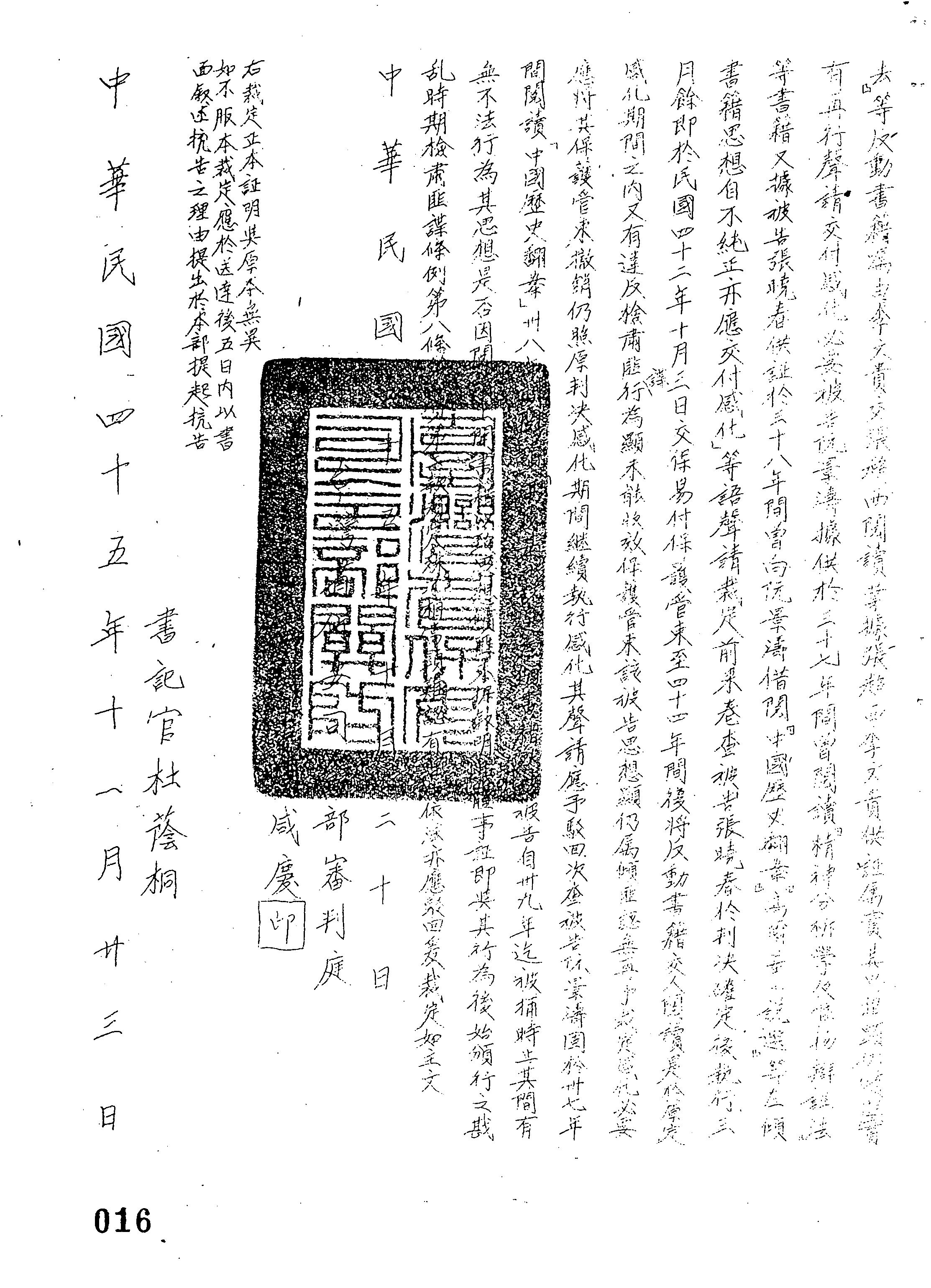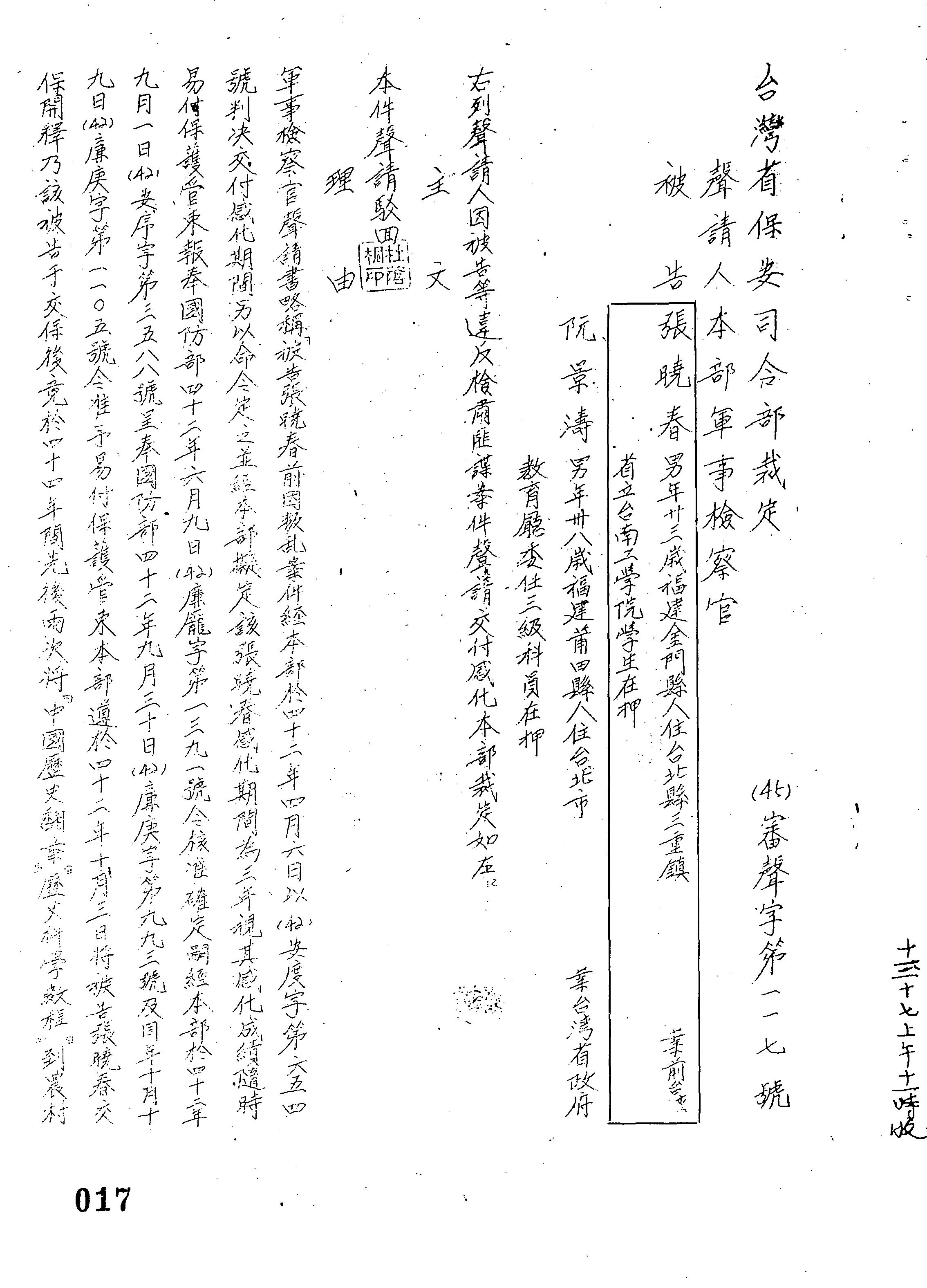 臺灣省保安司令部45年審聲字第0117號裁定書