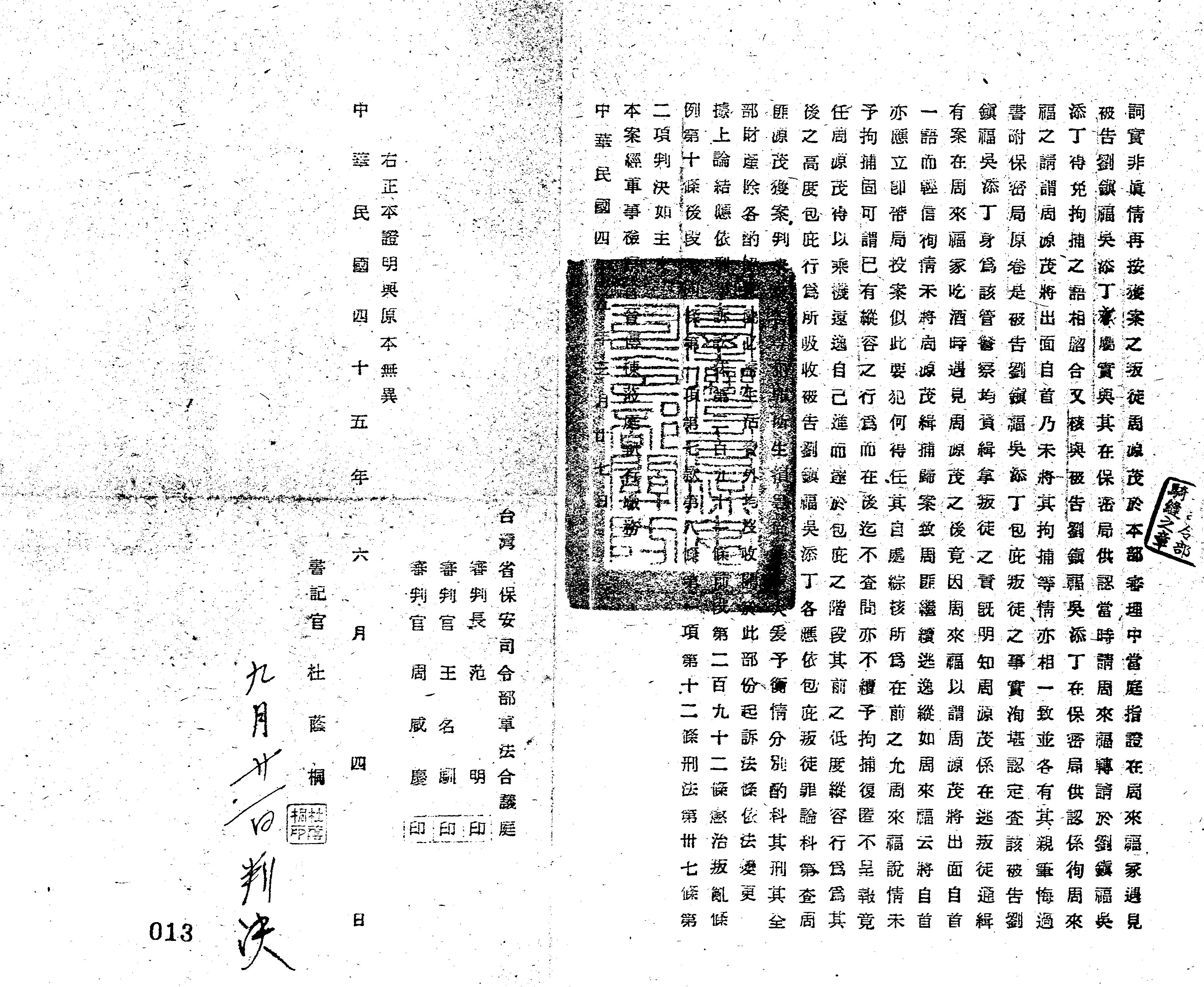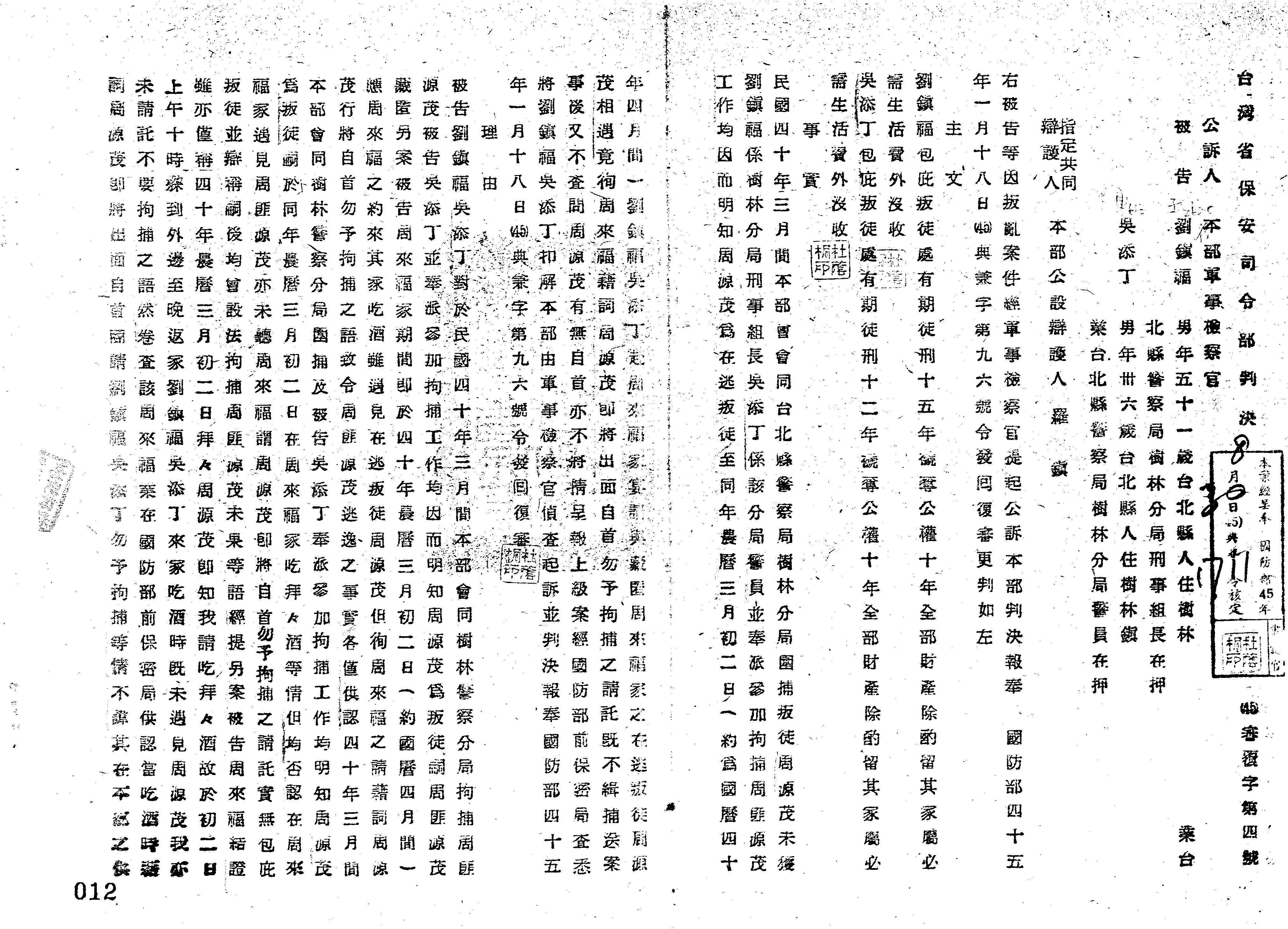 - 裁判書主文/要旨:劉鎮福「包庇叛徒」處有期徒刑15年,褫奪公權10年,全部財產除酌留其家屬必需生活費外沒收。吳添丁「包庇叛徒」處有期徒刑12年,褫奪公權10年,全部財產除酌留其家屬必需生活費外沒收。
