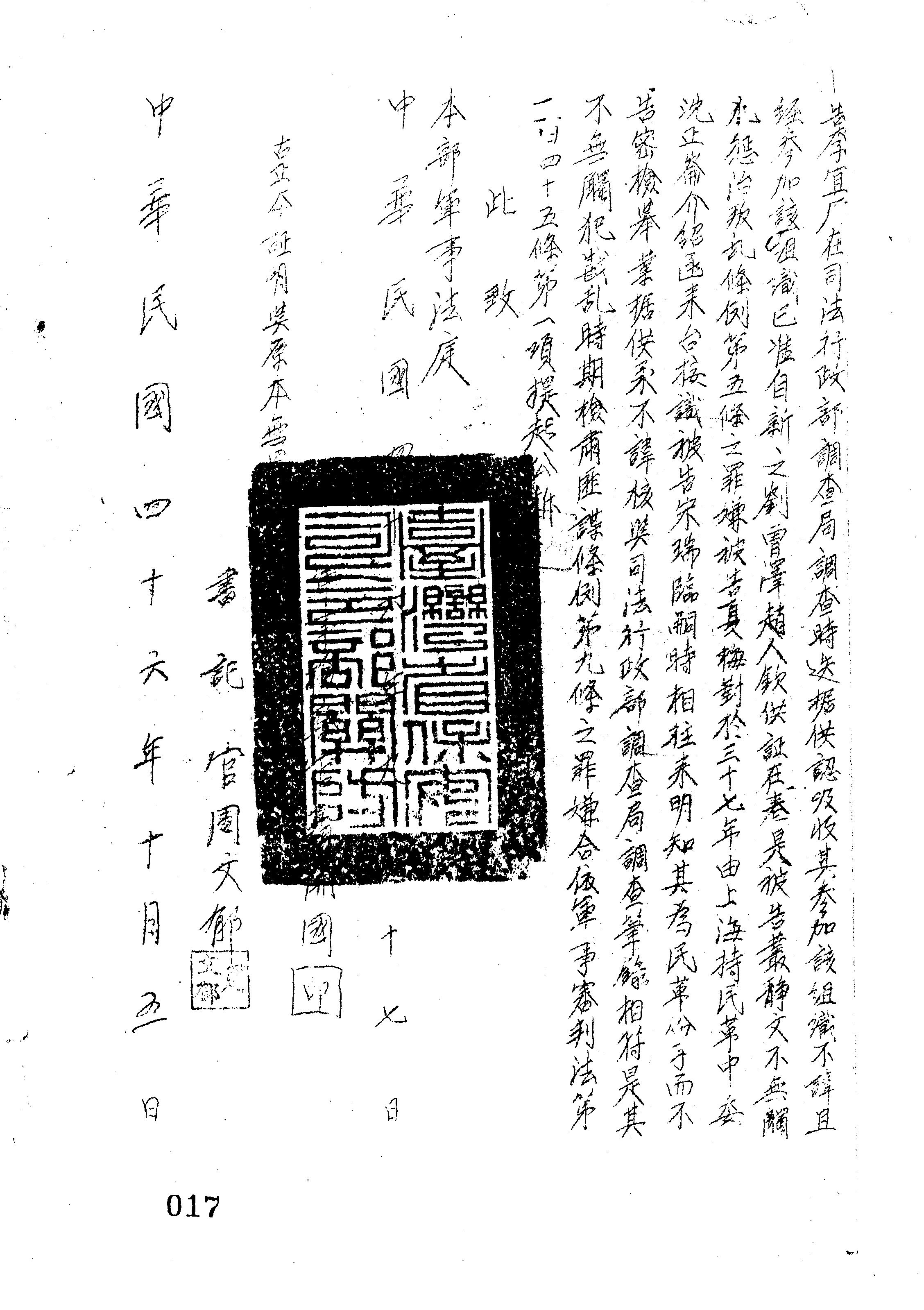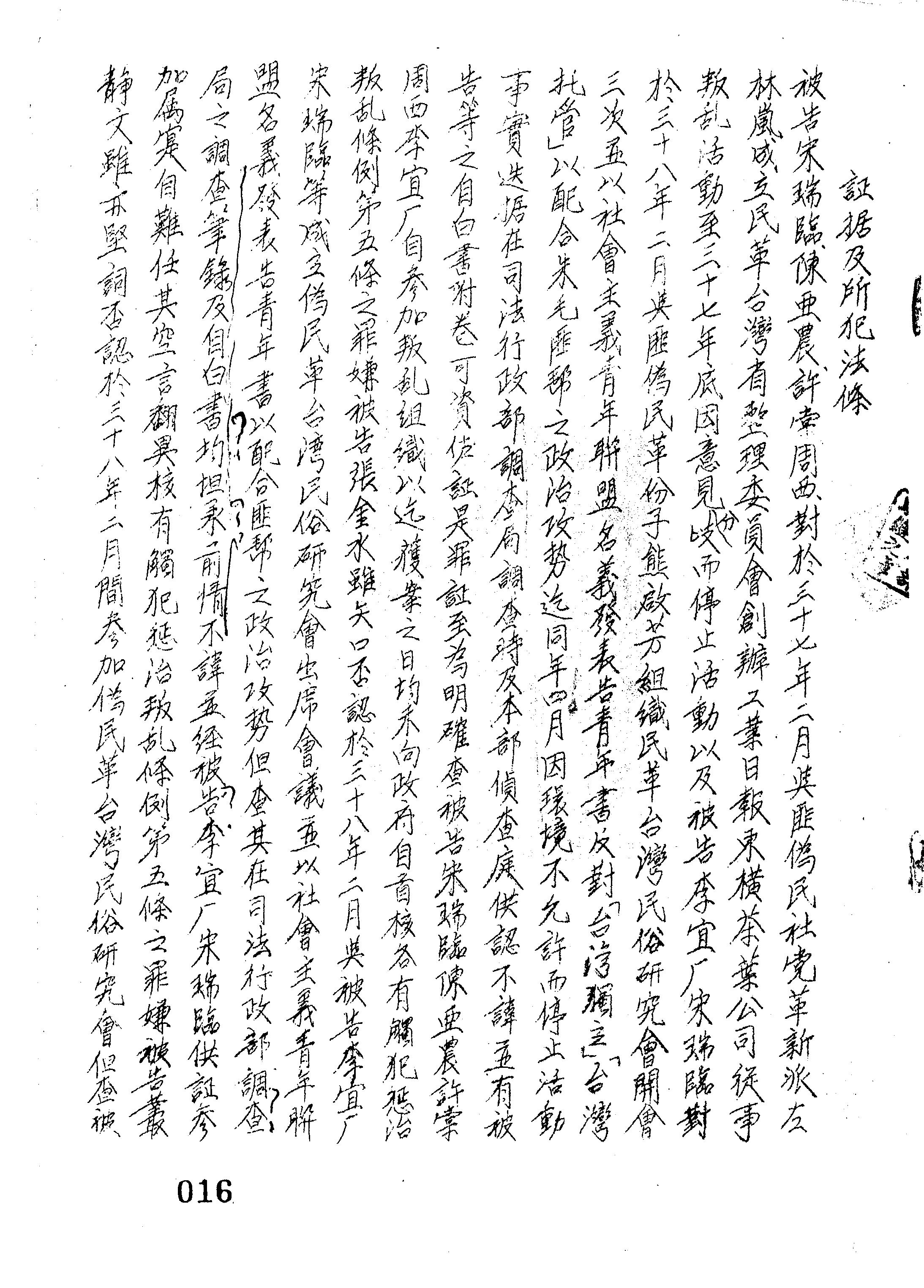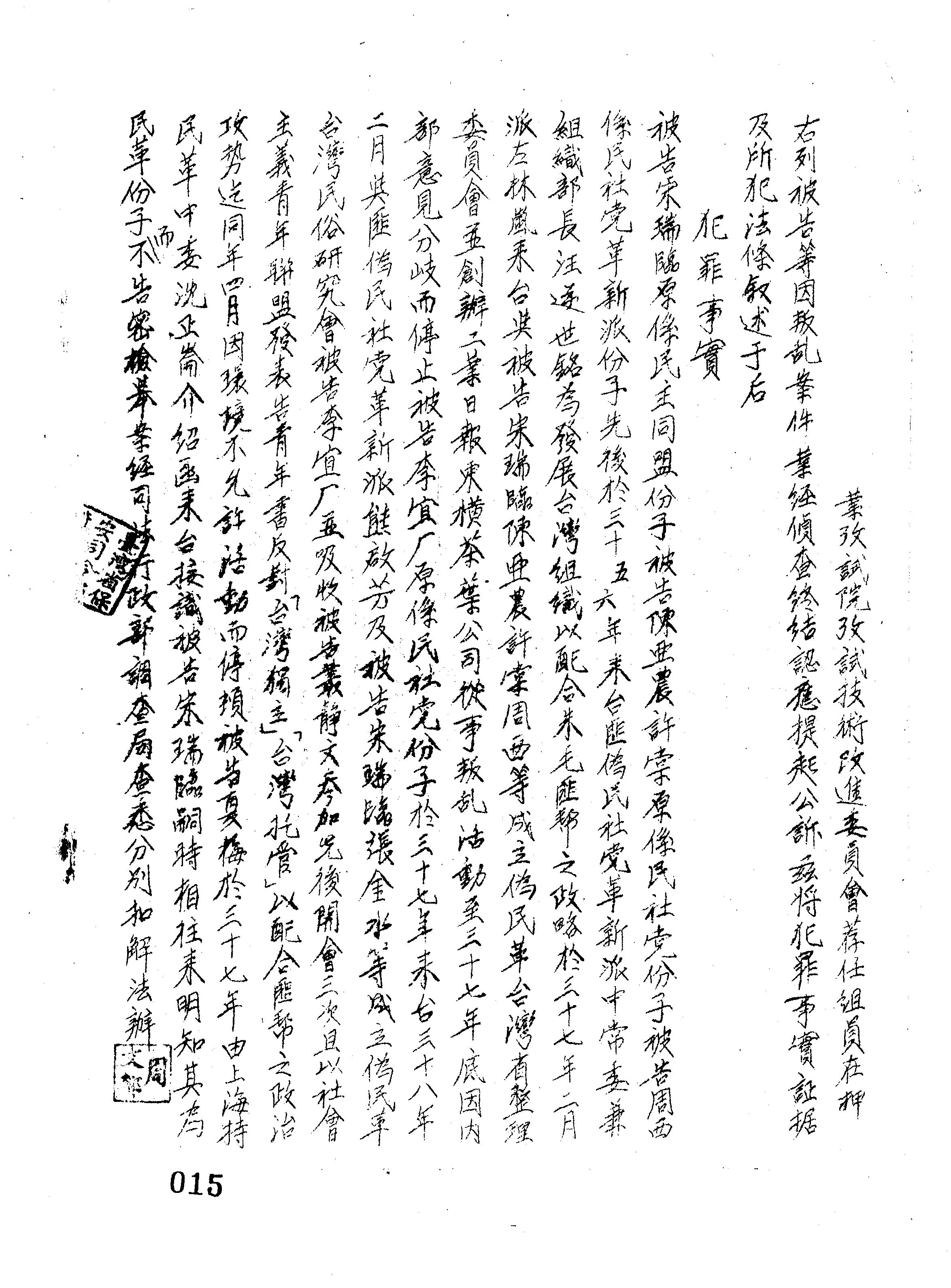 裁判書主文/要旨:宋瑞臨等因叛亂案件業經偵查終結認應提起公訴。