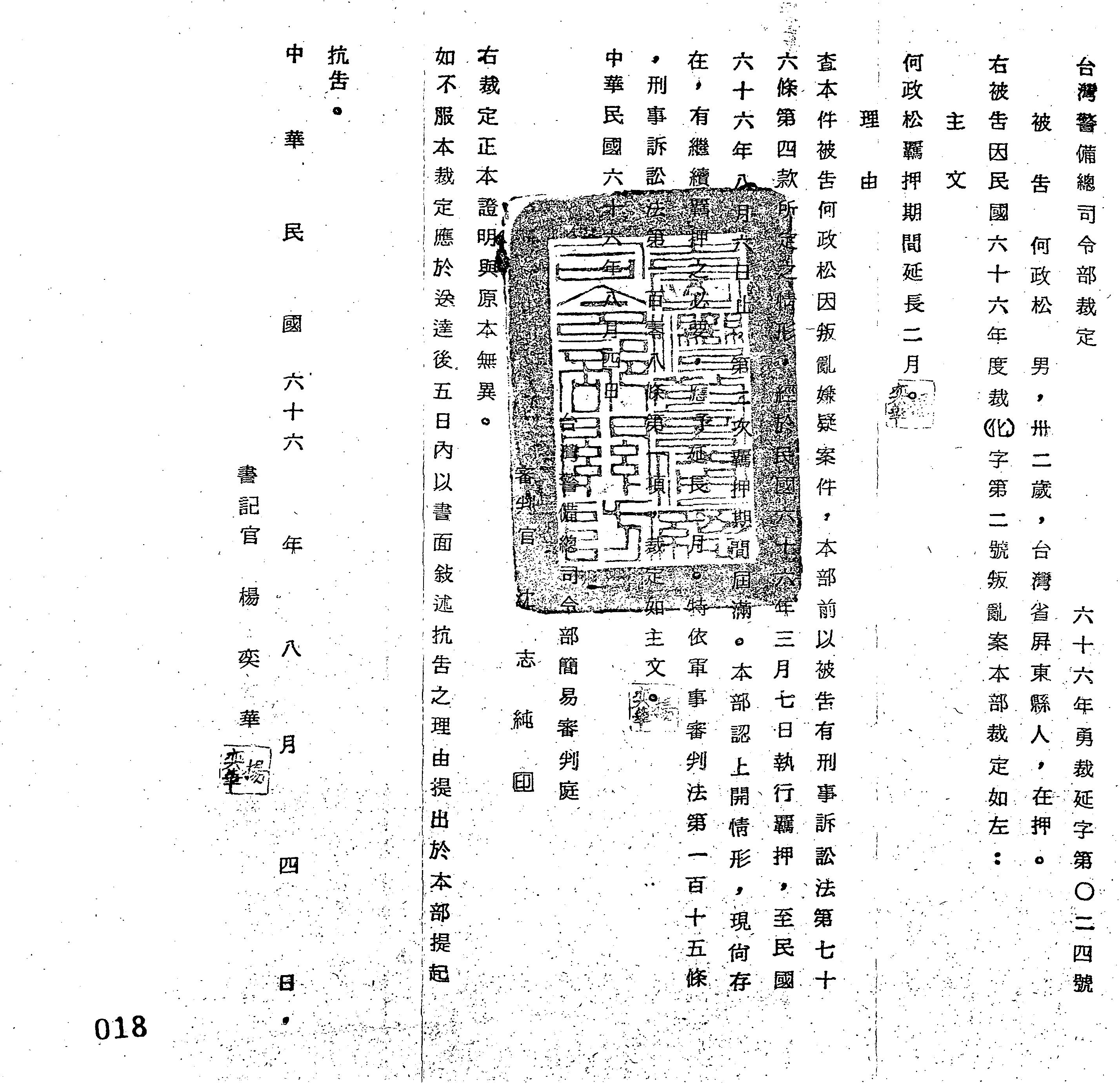 臺灣警備總司令部66年勇裁延字第0024號裁定書