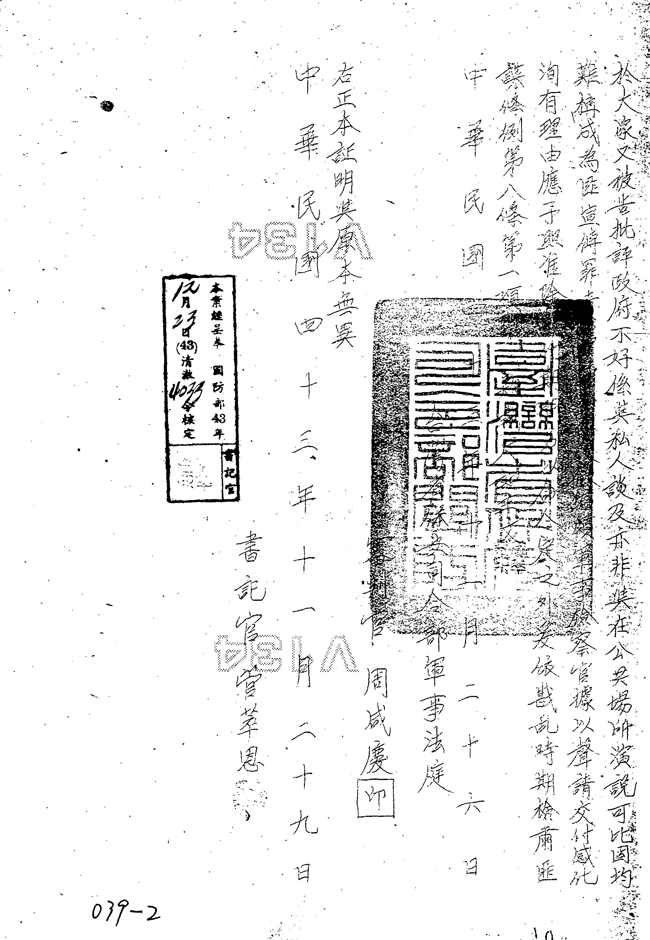 臺灣省保安司令部43年審聲字第0181號裁定書