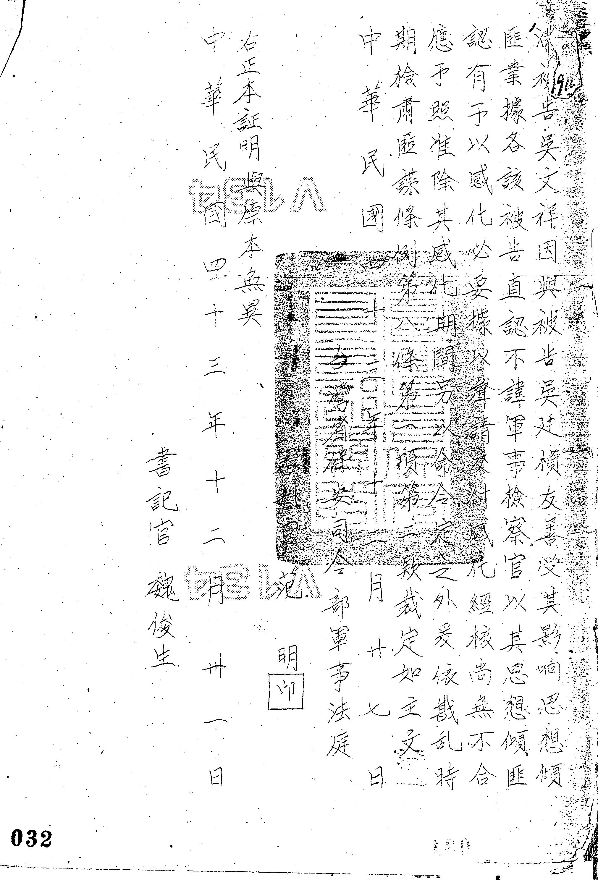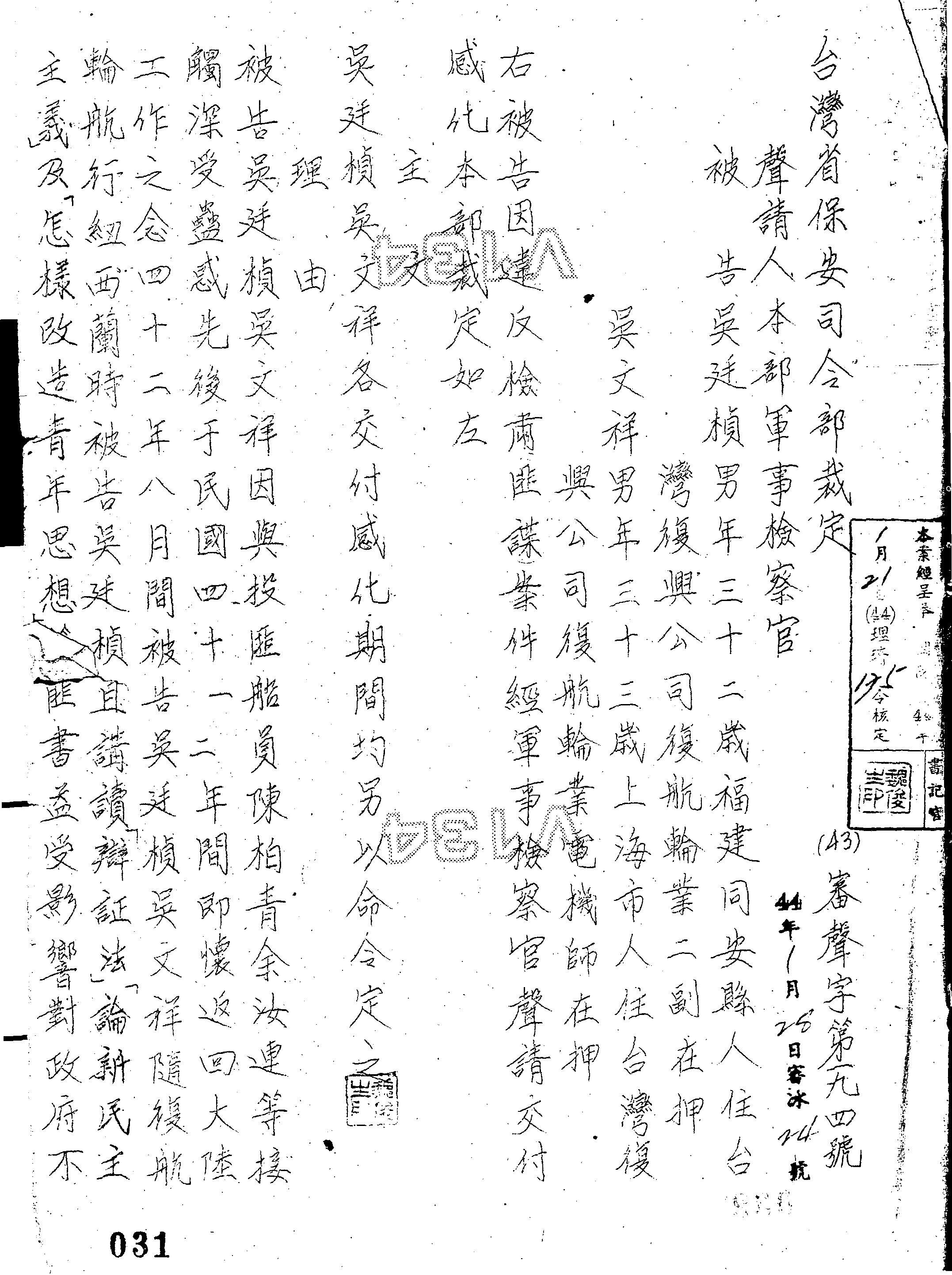 臺灣省保安司令部43年審聲字第0194號裁定書